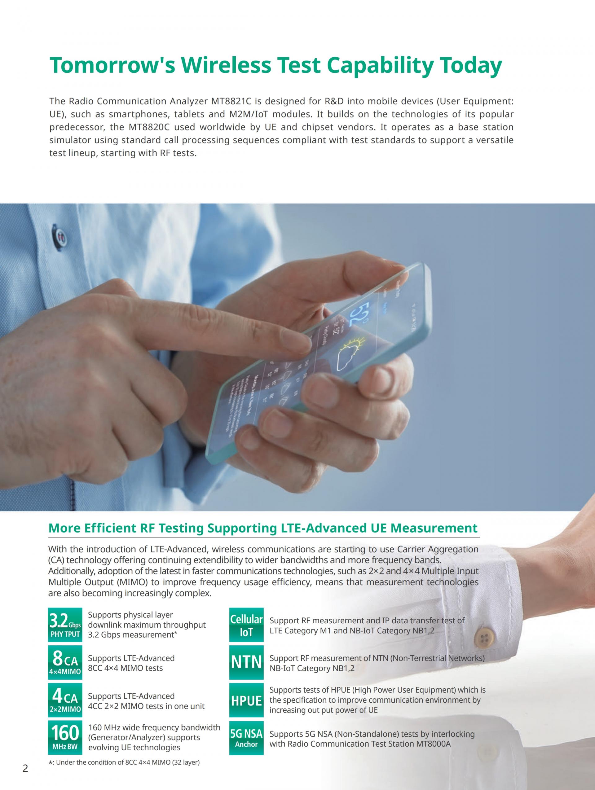 무선통신 분석기 MT8821C는 스마트폰, 태블릿 및 IoT 모듈 등과 같은 모바일 장치(UE: 사용자 기기) R&D를 위해 설계되었습니다. 이 장치는 UE 및 칩셋 공급 회사가 세계적으로 사용하는 인기 프로세서인 MT8820C의 기술로 만들어졌습니다.