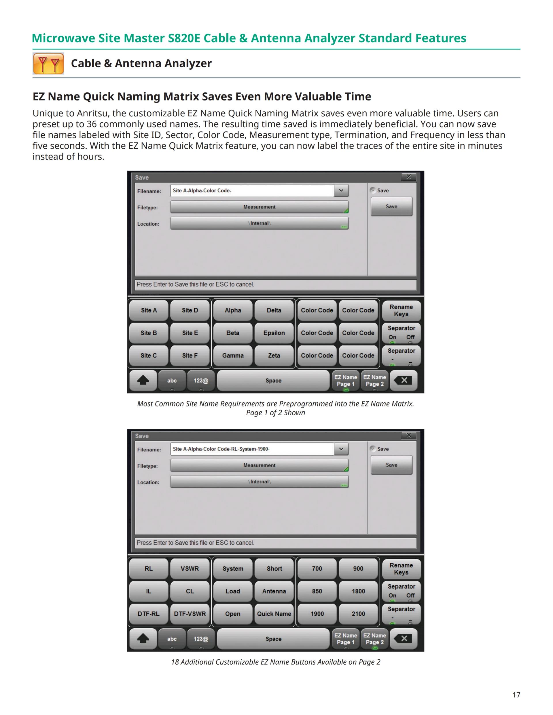 VNA 모드는 완전한 리버싱 스윕 및 사용자 구성 가능한 쿼드 디스플레이 4 S- 파라미터 동시 측정 기능을 제공합니다. 업계 표준 호환 형식 S2P 파일 (S2P 파일 3 형식을 사용할 수 있습니다). S2P 파일은 안리쓰 벤치 탑 VNA의 (안리쓰의 VectorStar ™ 및 ShockLine ™) 필드와 실험실 측정 시 비교에 용이합니다.