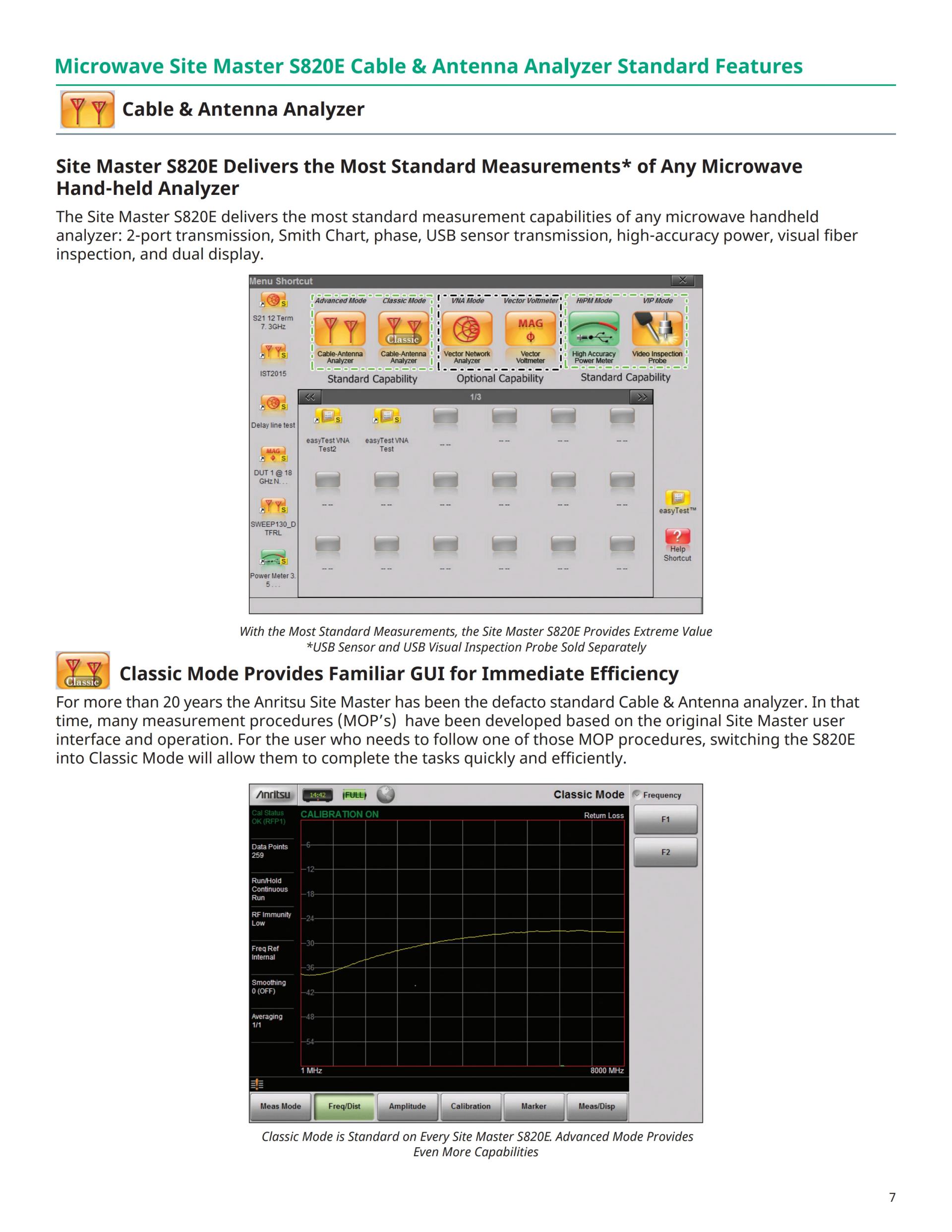 S820E는 이전 S810D/S820D 마이크로파 케이블 & 안테나 분석기를 대체하는 제품이며, 그러한 모델의 모든 기능 이상을 제공합니다. 또한 S820E에는 "클래식 모드"가 포함되어 있는데, 이 모드를 사용하면 S8X0D 이전 시리즈 사용자가 최소한의 노력으로 생산적인 작업을 즉시 수행할 수 있습니다.