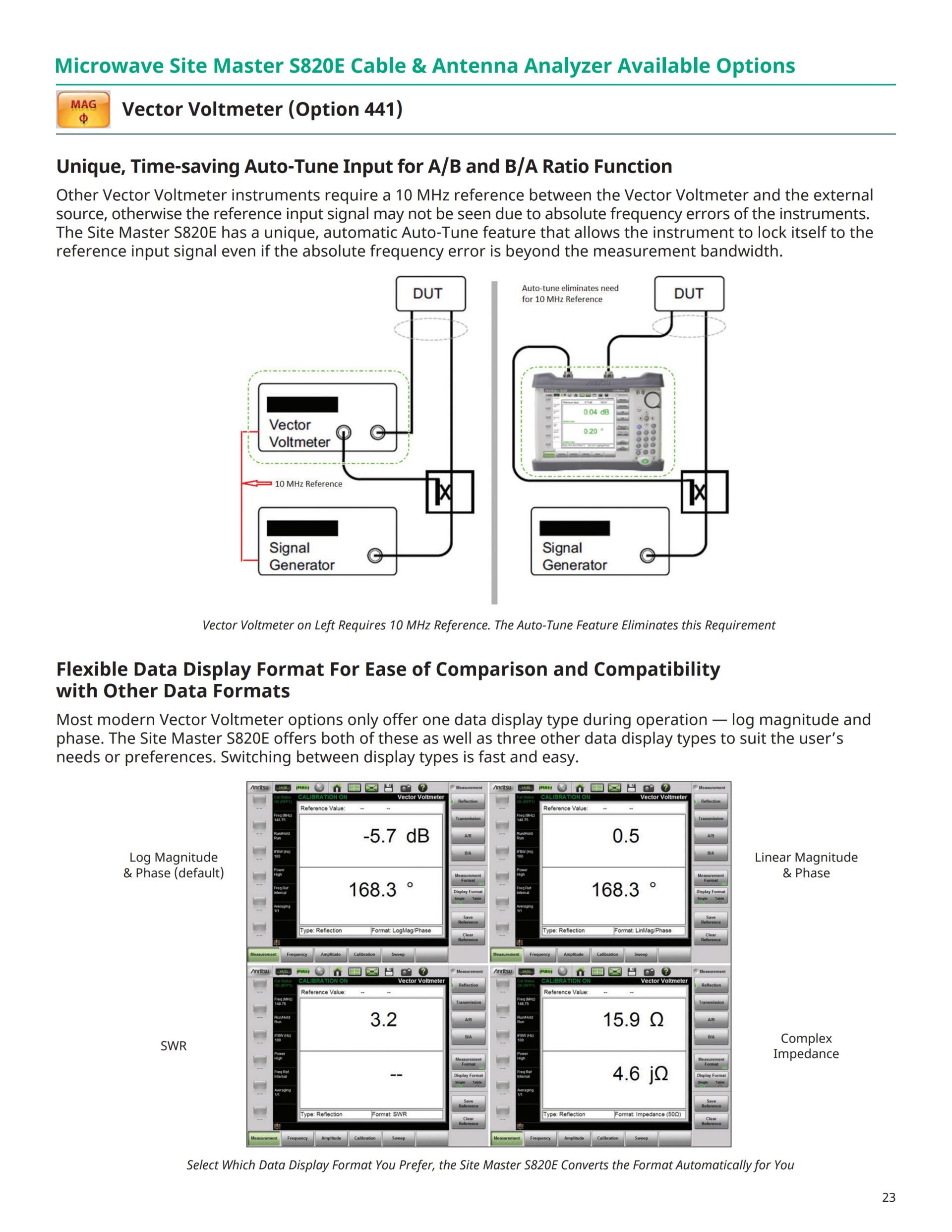 A/B 와 B/A Ratio capability 기능은 S820E는 드롭 인 (drop-in) 교체 이전의 기존 벡터 전압계 용으로 사용할 수 있습니다. VVM 모드는 외부 CW 소스에 대한 필요성을 제거하는, 직접 반사, 전송 측정을 지원하고, 외부 커플러, 교량, 또는 분할기. 벡터 에러 정정 절대 측정 DUT에 대한 데이터뿐만 아니라, DUT에 직접 연결하는 데 필요할 수있는 케이블 어댑터 또는 일정 보상을 제공 반사 또는 전송 측정에 적용 할 수 있습니다. 여러 측정 표시 모드는 다른 일반적인 측정 유형과 쉽게 비교를 용이하게 할 수 있으며, 핸디 표 화면은 최대 12 개의 DUT의 1 참조 멀티 어레이 안테나 시스템 튜닝 매우 유용 동시에 측정 할 수 있습니다. 동적 범위를 선도하는 산업은 중요한 글라이드 슬로프 설치 및 검증에 이상적, 우수한 측정 안정성과 높은 시스템 손실은 피할 수 반복성을 제공합니다.