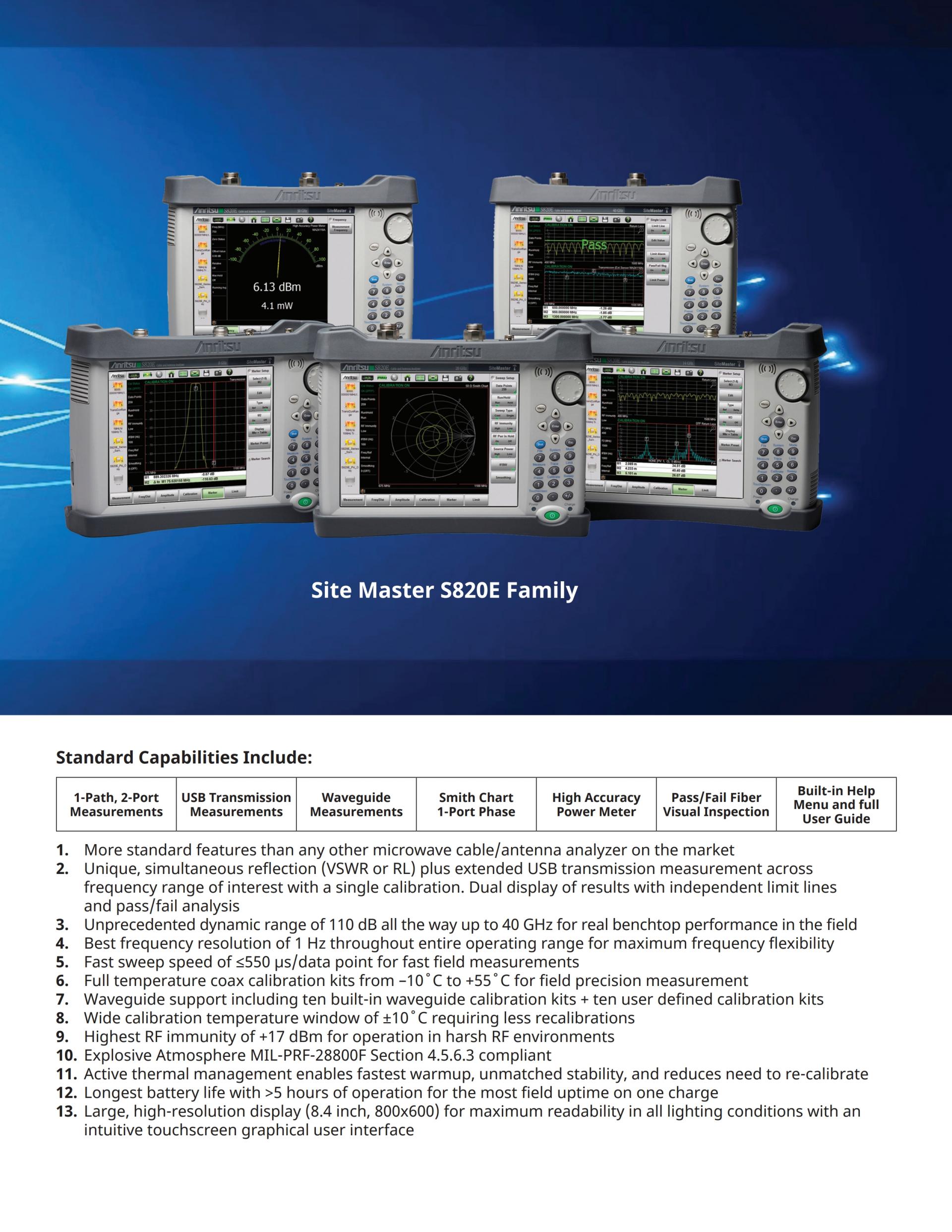 1MHz ~ 8, 14, 20, 30 및 40GHz의 주파수 옵션을 제공하는 Microwave Site Master S820E 제품군은 세계에서 가장 첨단화된 기능을 보유하도록 개발된 Site Master입니다.