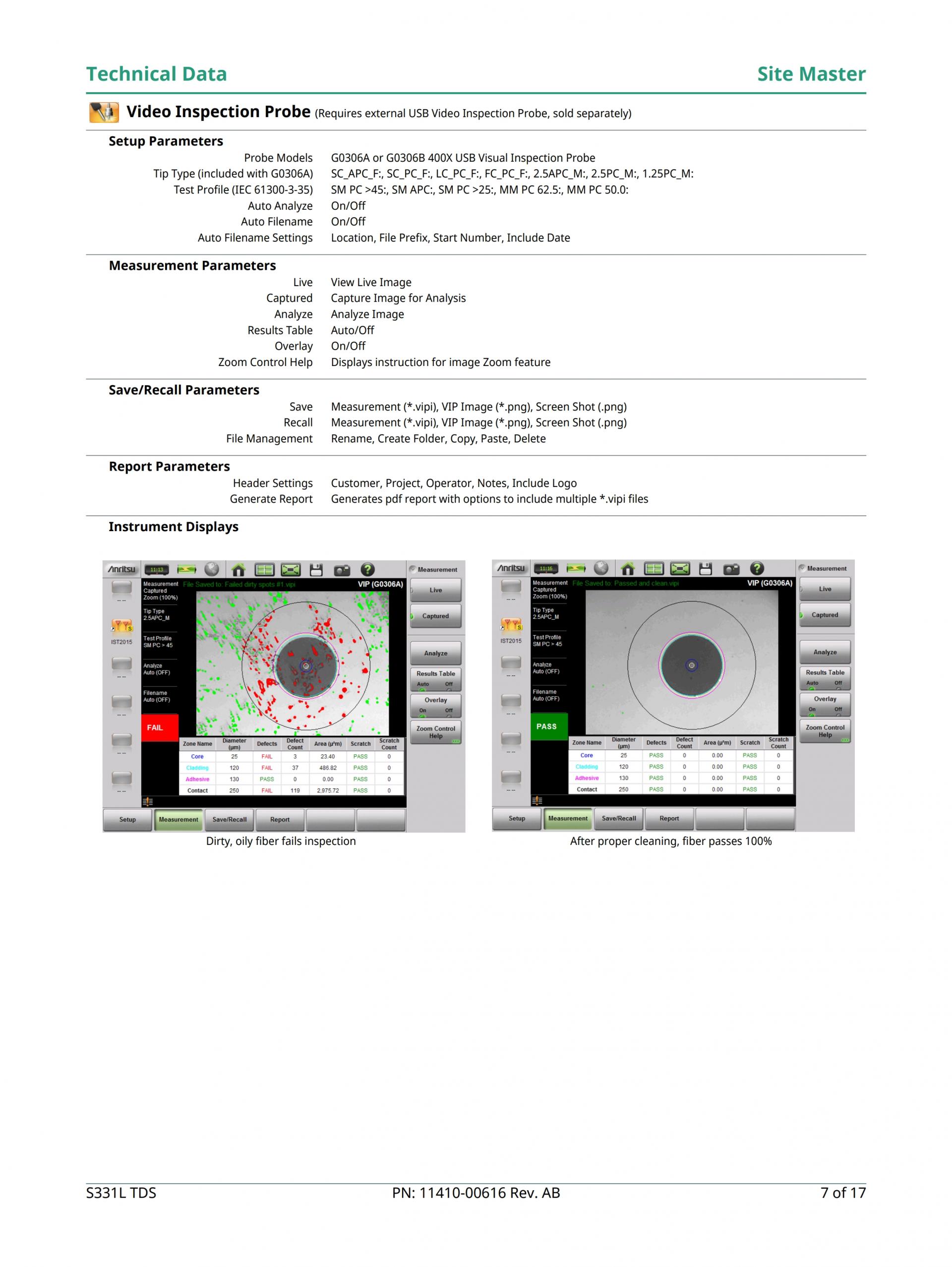 - VIP 모드 : Pass/Fail 스탠다드 를 기본으로 IEC 61300-3-35 로 광 커넥터 검사 (개별적으로 판매하는 USB 비디오 인스펙션 프로브 G0306A 가 필요)