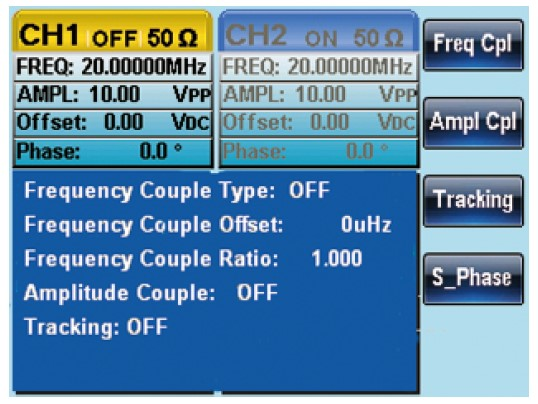 두 채널은 독립적이거나 연관된 구성으로 사용할 수 있습니다. AFG-2225는 Couple, Tracking 및 Phase 기능 세 가지를 제공합니다. Couple 기능에서는 진폭이나 주파수에서의 비율 또는 오프셋이 있는 두 신호를 생성할 수 있습니다. 조정 가능한 오프셋 주파수를 갖는 두 신호 중 하나는 앰프의 삼차 상호 변조 왜곡을 테스트하기 위한 이차 음조 신호를 형성하는 예입니다. Tracking 기능으로는 주파수와 진폭이 동일하지만 반전된 위상을 갖는 두 개의 차분 신호를 생성할 수 있습니다. 예로는 PECL, LVPECL 및 LVDS 디지털 신호 또는 온도, 속도 신호와 같은 자동차 센서가 있는데, 이러한 것들은 모두 추적 기능으로 시뮬레이션할 수 있습니다. Phase 기능은 지정된 위상 오프셋을 갖는 두 신호를 생성하기 위해 설계되었습니다. 사용자가 두 사분면 (사인 및 코사인) 신호를 생성하려는 경우 Phase 기능에서 위상 오프셋을 90도로 설정합니다. 요약하면, 다른 임의 함수 발생기가 위상 기능만을 갖추고 있는 것과 비교하여, AFG-2225는 현대 전자 산업에서 발생하는 다양한 도전에 대처하기 위한 큰 편의를 제공합니다.
