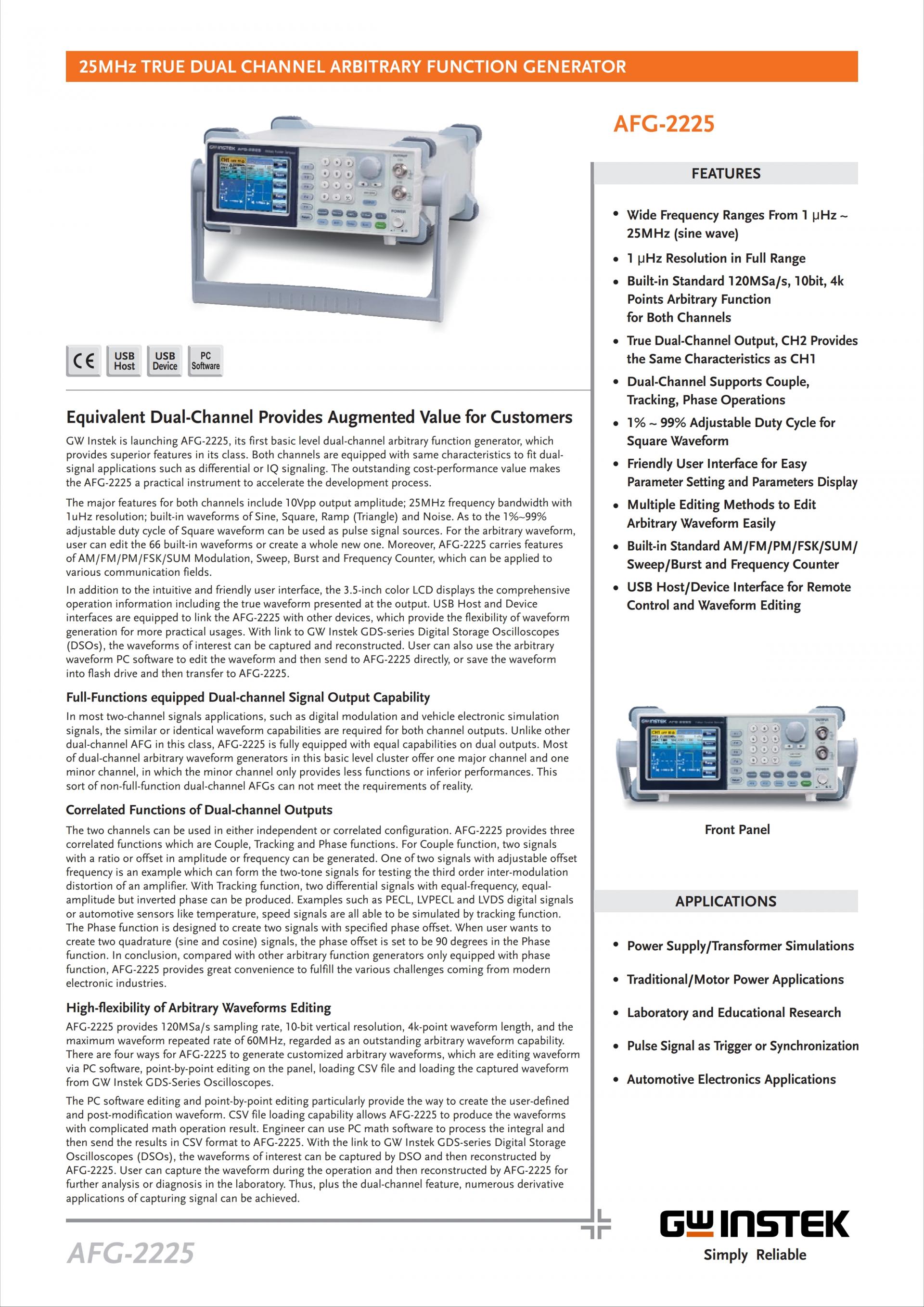 AFG-2225는 이중 채널 임의 함수 발생기로, 우수한 기능과 비용 대성능 가치를 제공합니다. 각 채널은 동일한 특성을 갖추어 차별화나 IQ 신호 전달 등에 적합합니다. 주요 기능으로는 10Vpp 출력 진폭, 25MHz 주파수 대역폭, 내장 파형 (사인, 사각, 램프, 노이즈), 조절 가능한 듀티 사이클 등이 있습니다. 또한 AM/FM/PM/FSK/SUM 변조, 스위프트, 버스트 및 주파수 카운터 등의 기능을 제공합니다. 직관적이고 사용자 친화적인 인터페이스와 USB 호스트 및 장치 인터페이스를 통해 다른 장치와 연결하여 실용적인 용도로 파형을 생성할 수 있습니다.