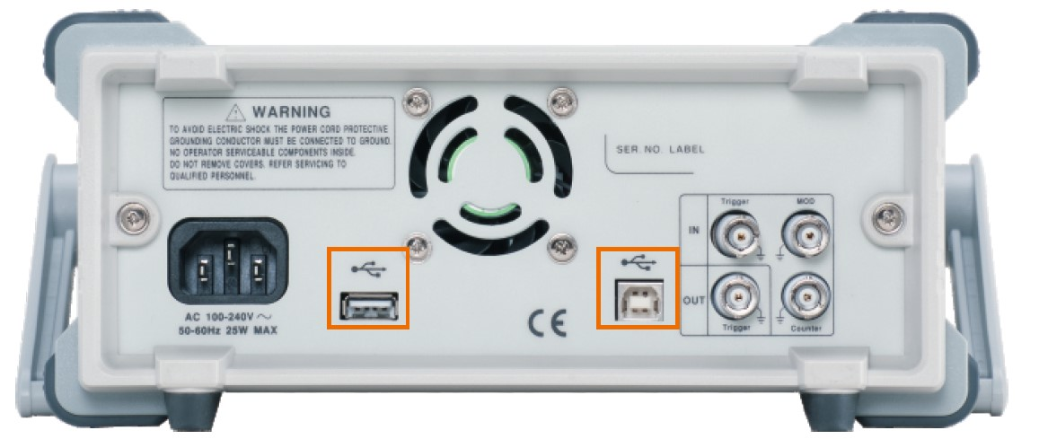 USB 호스트/장치 인터페이스는 AFG-2225의 후면 패널에 위치해 있습니다. USB 호스트는 주로 GW Instek GDS 시리즈 오실로스코프의 파형을 직접 재구성하는 데 사용됩니다. 따라서 휴대용 USB 플래시 드라이브에 저장하고 호출할 수 있습니다. USB 장치는 PC에 연결하여 소프트웨어를 통해 제어하는 것 외에도 사용자 정의 기능 제어를 위해 IEEE488.2 명령 목록을 지원합니다.