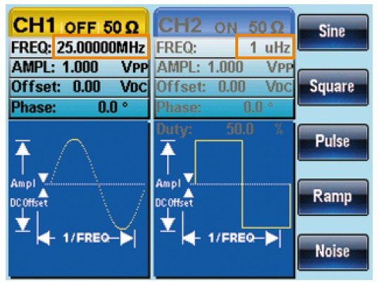 - 주파수 범위가 1μHz에서 25MHz까지 (사인/사각파)