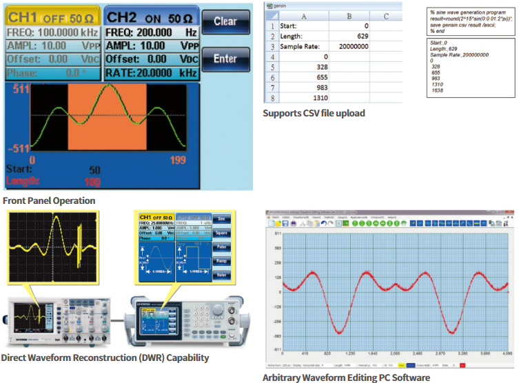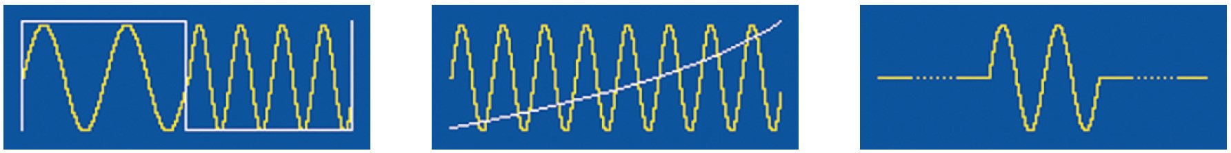 AFG-2225는 120MSa/s 샘플링 속도, 10비트 수직 해상도, 4k포인트 파형 길이 및 최대 파형 반복 속도 60MHz를 제공하여 뛰어난 임의 파형 능력으로 평가됩니다. AFG-2225는 사용자 정의 임의 파형을 생성하기 위한 네 가지 방법을 제공합니다. 이것들은 PC 소프트웨어를 통한 파형 편집, 패널에서 포인트별 편집, CSV 파일 로딩 및 GW Instek GDS 시리즈 오실로스코프에서 캡처한 파형 로딩입니다.
