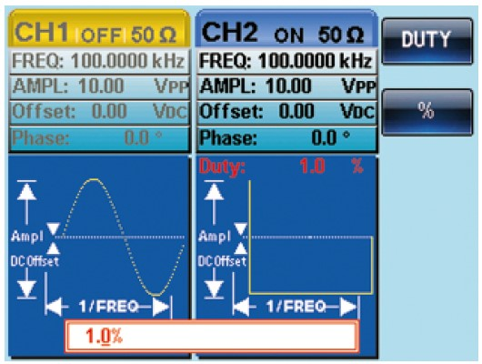 - 사각파형에 대한 1% ~ 99% 조절 가능한 듀티 사이클