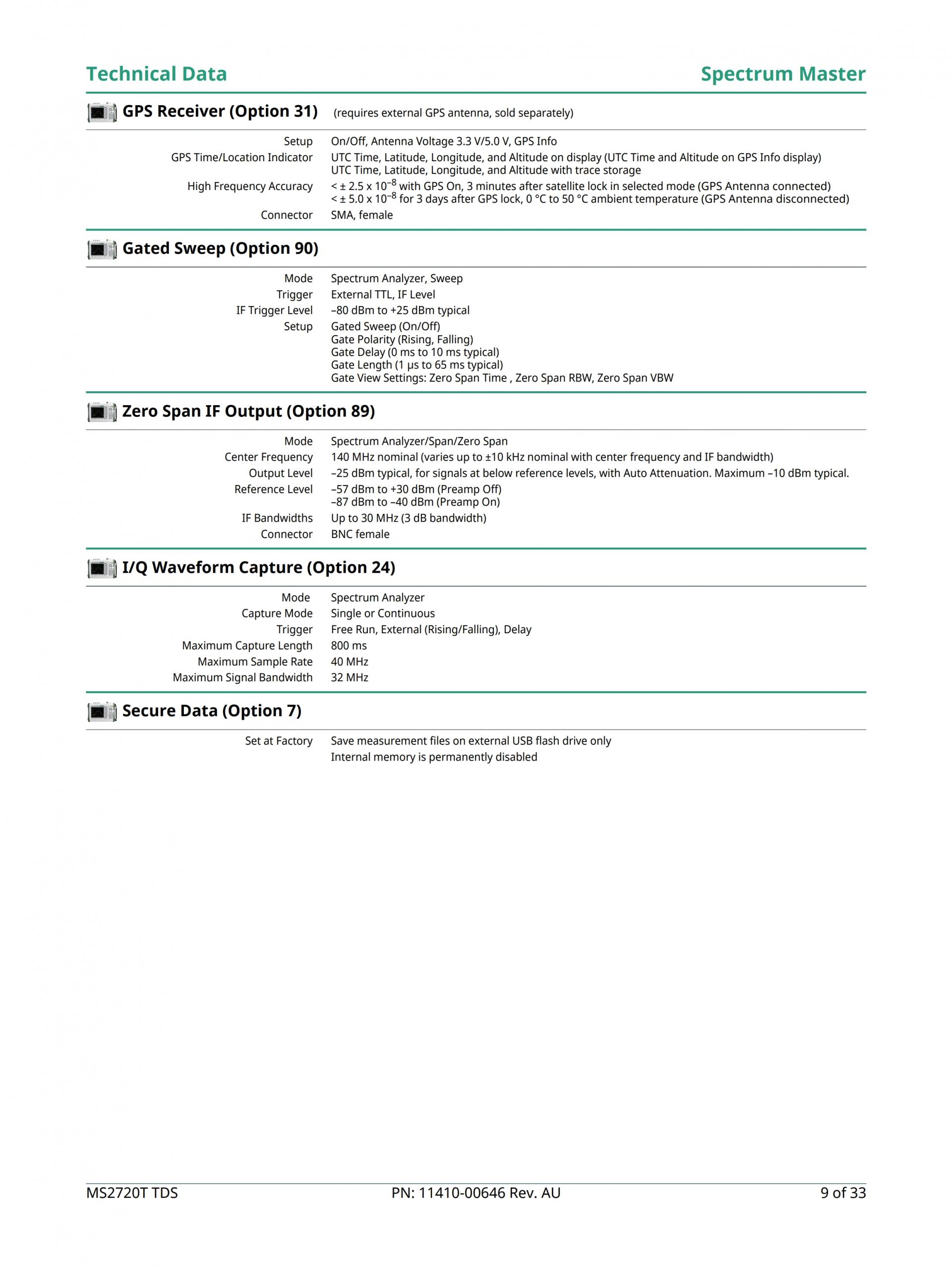 - 거의 모든 광대역 신호의 외부 복조를 위한 140 MHz 중심 주파수에서 30 MHz 와이드 제로-스팬 IF 출력