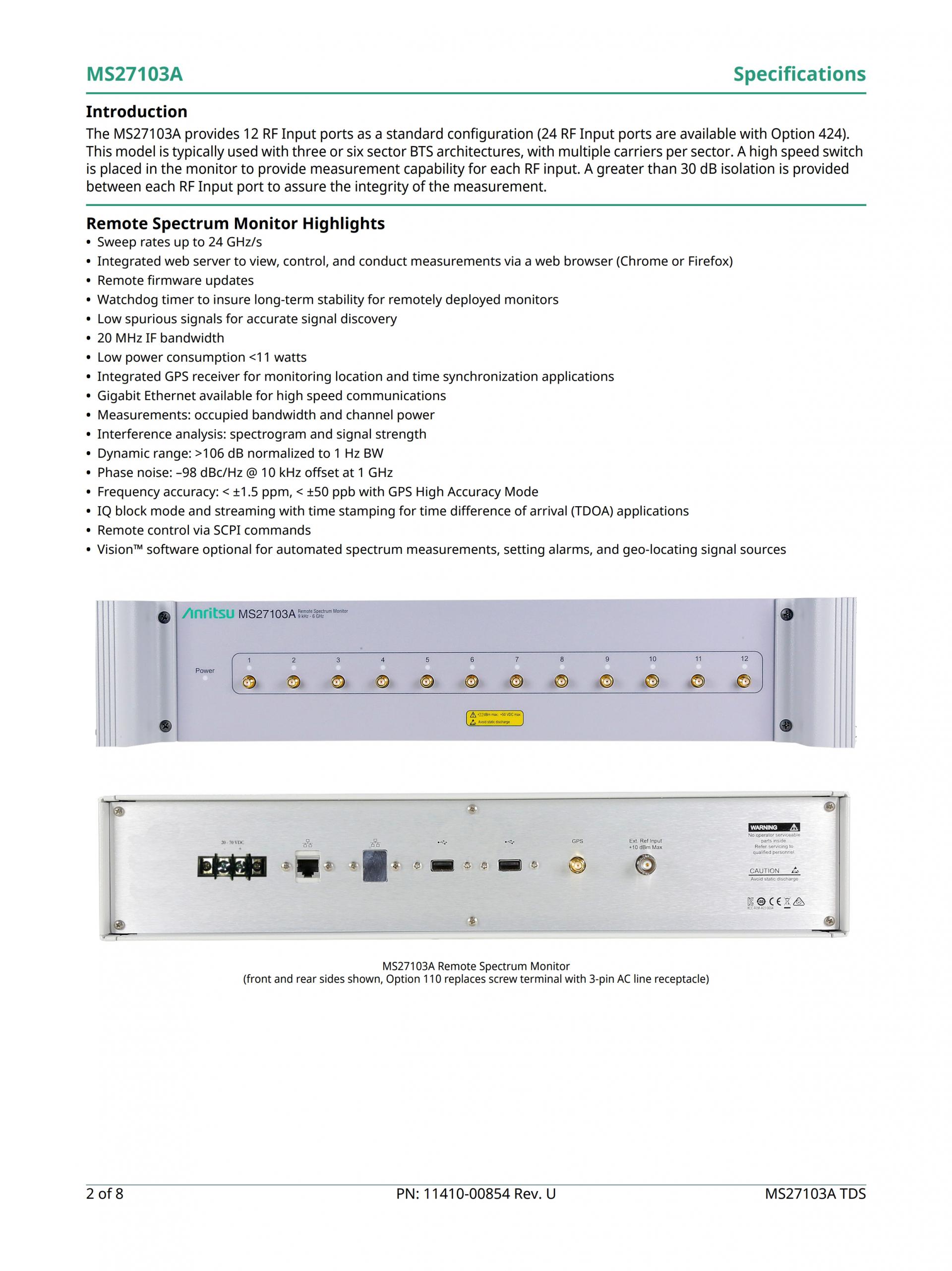 MS27103A는 12개(또는 선택적으로) 24개의 RF 입력을 갖춘 랙 장착형 인클로저에 들어 있습니다. 전자 스위치는 각 포트의 주소를 지정하는 데 사용됩니다. MS27103A는 사용자가 지정한 주파수에서 신호를 모니터링하고 기록하기 위한 모든 기능을 갖춘 플랫폼입니다.