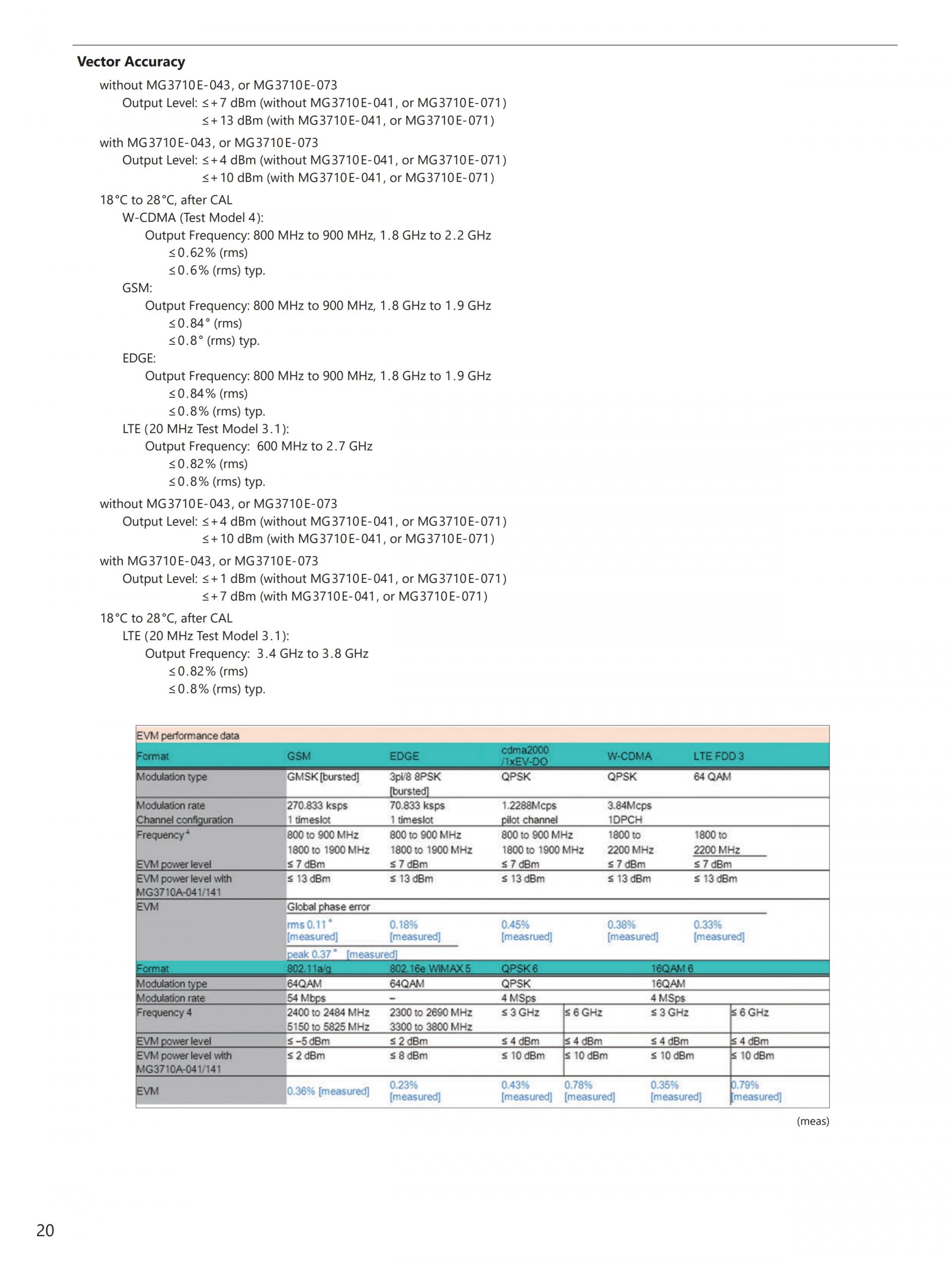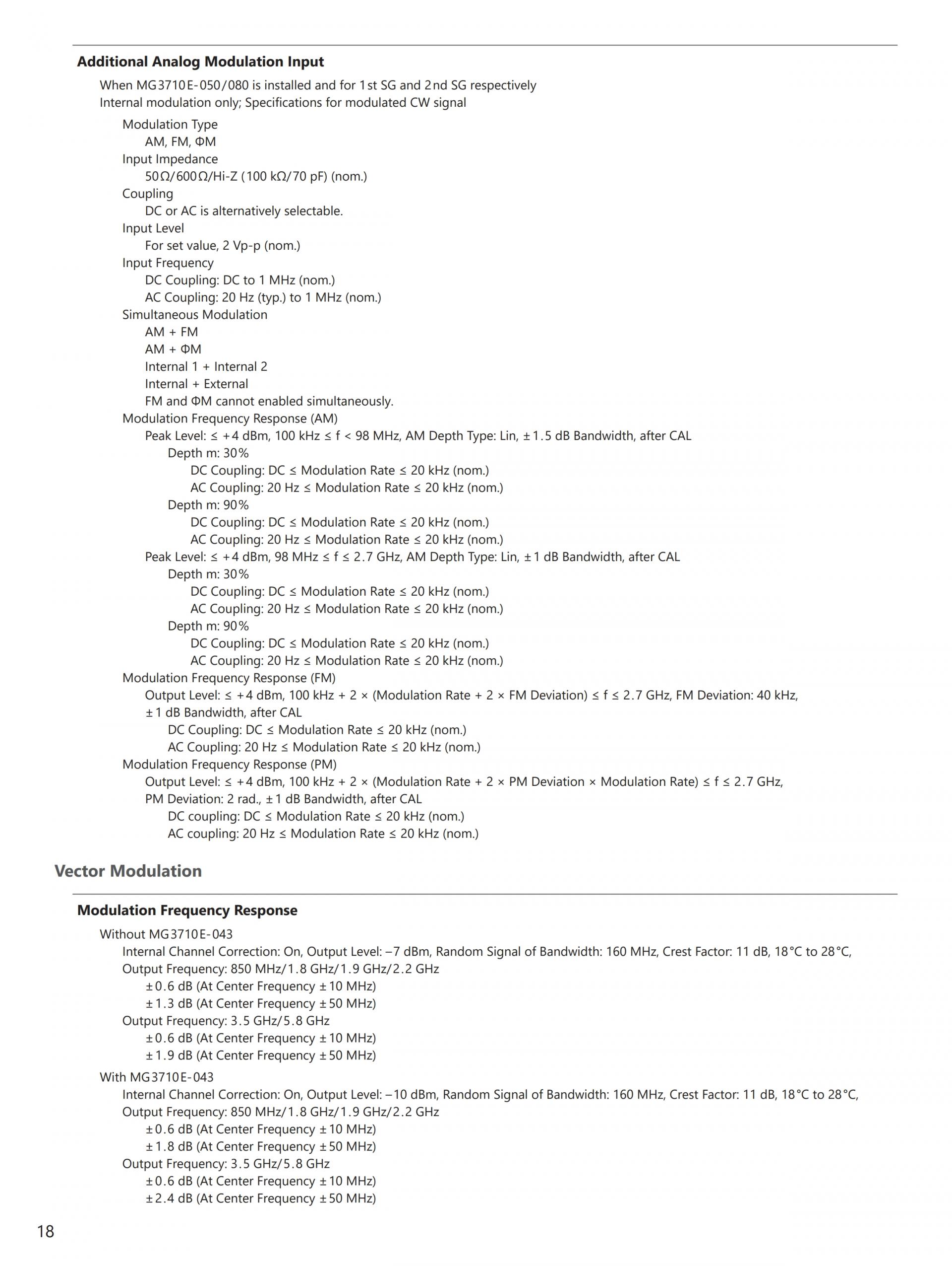 벡터 신호 발생기 MG3710E는 뛰어난 RF 및 기저대 성능을 지닌 최상급 고기능 신호 발생기입니다. MG3710E는 광대역 벡터 변조가 특징이며, 딥 메모리를 지원하는 내장 기저대 파형 세대 모델로 다용성을 극대화합니다. 이것은 모든 주요 통신 및 무선 LAN 표준을 지원하며, 또한 최근 새롭게 떠오르는 특허 무선 통신 기술에 필요한 우수한 성능을 보유하고 있습니다. 듀얼 RF 및 이중 파형 옵션으로 인해 MG3710E 1개로 최대 4개의 독립된 변조 신호로 출력이 가능합니다. MG3710E는 일반적으로 다중 합성 신호 발생기가 필요한 다음과 같은 복잡한 테스트 시나리오를 쉽게 구현할 수 있습니다.