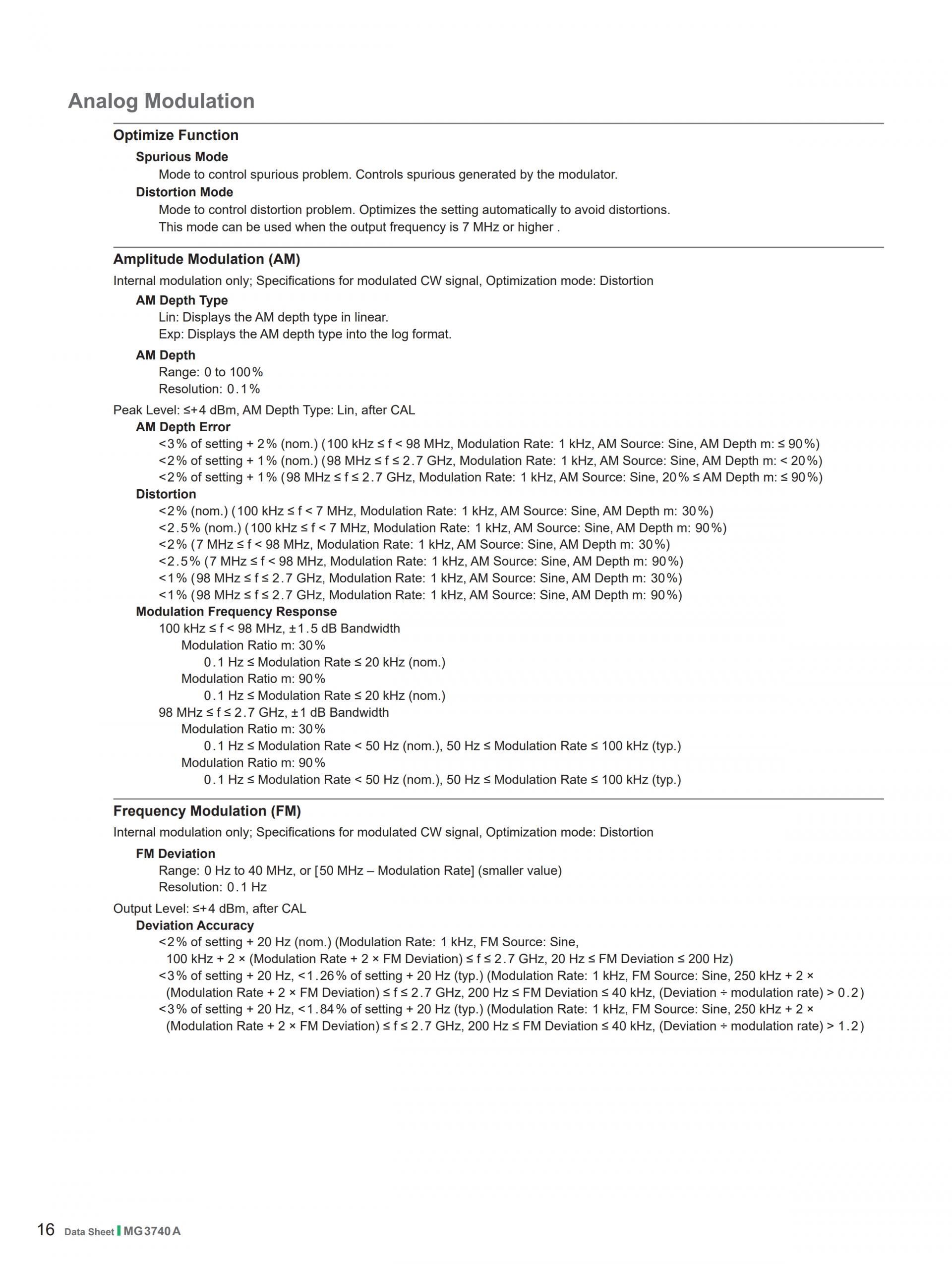 MG3740A는 협대역 디지털뿐 아니라 CW 및 아날로그 변조도 지원합니다.