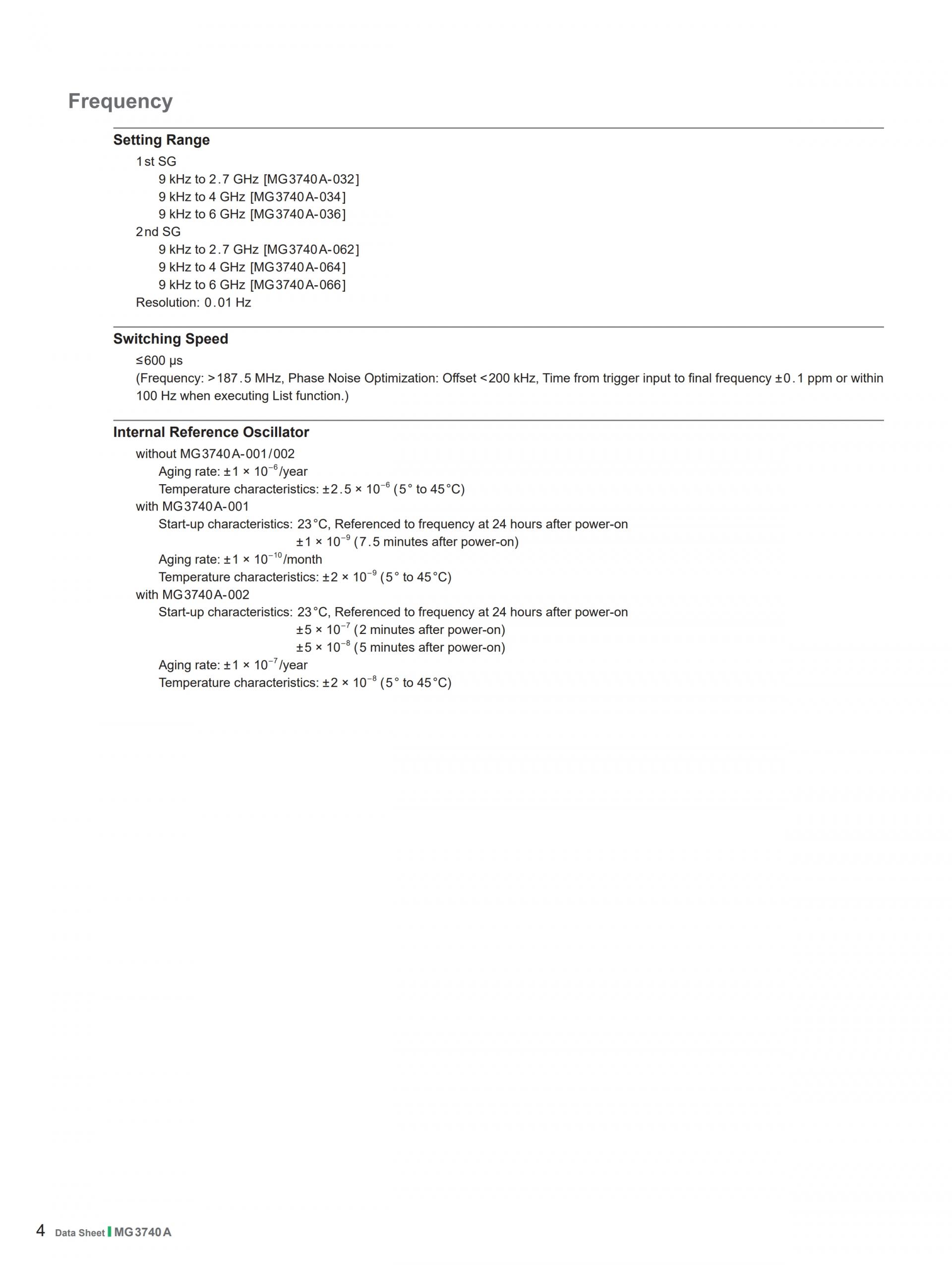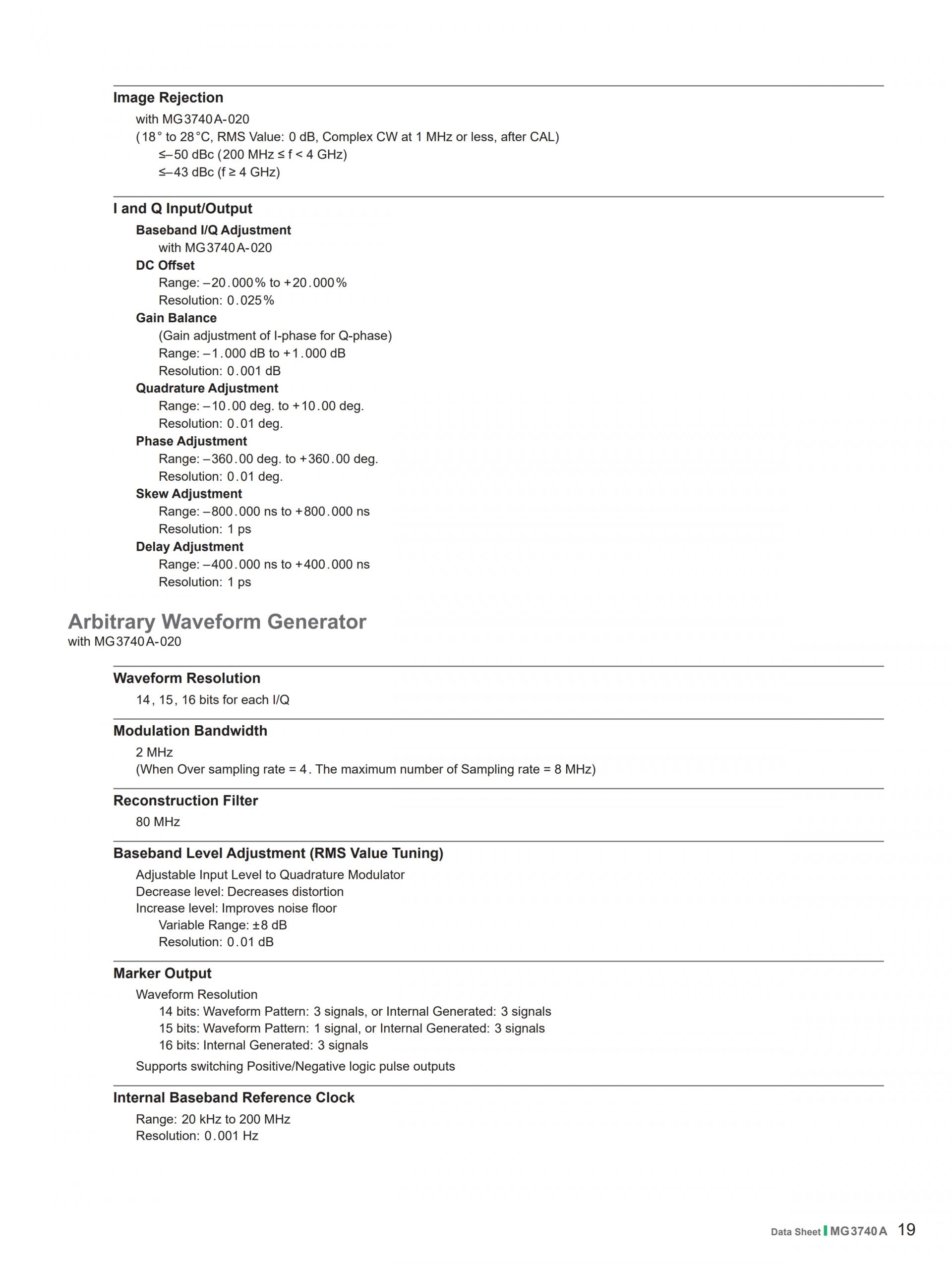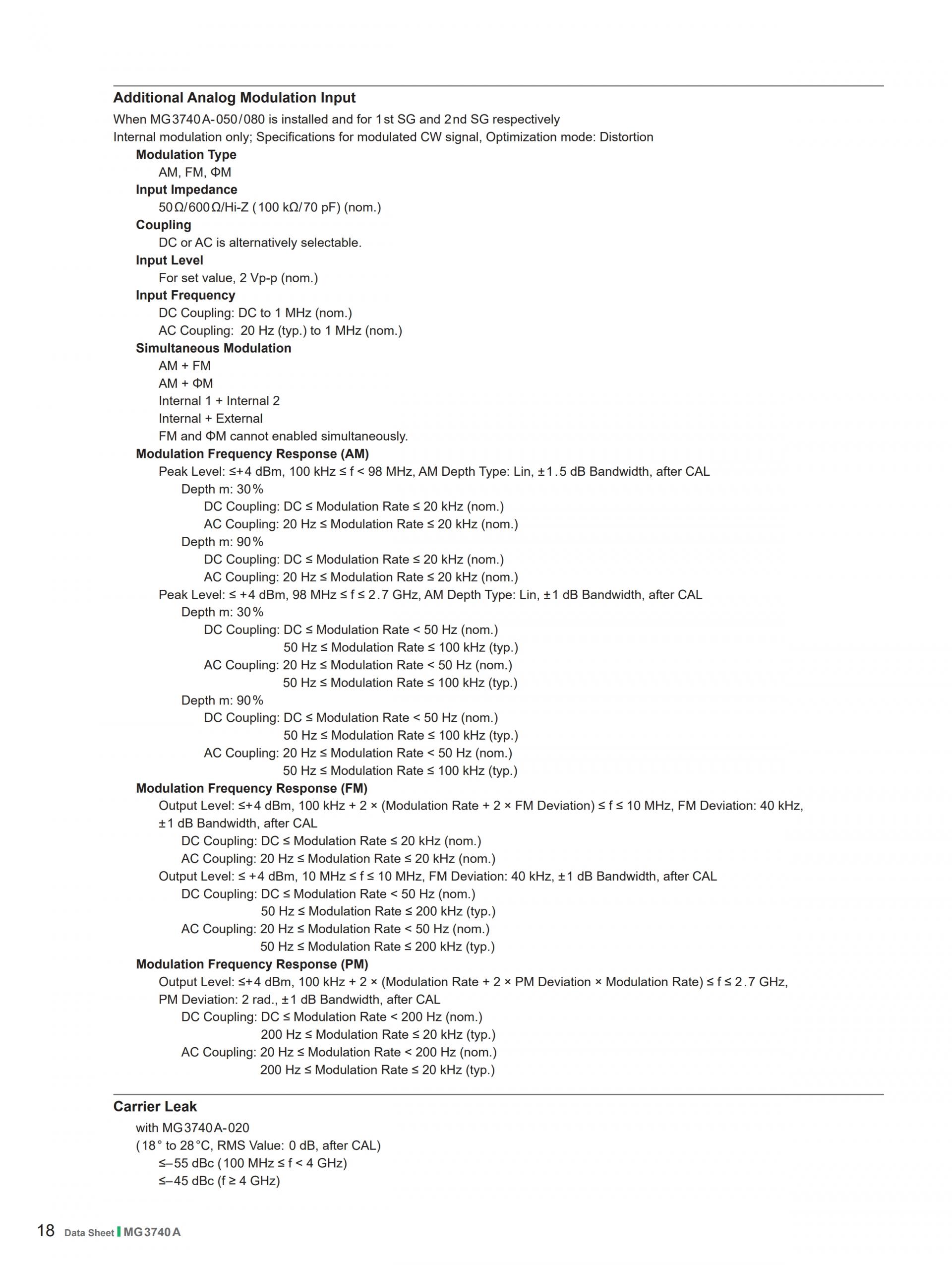 아날로그 신호 발생기 MG3740A는 SSB 위상 잡음, 출력 레벨, 다채로운 변조 기능 (AM/FM/ΦM/펄스) 등 탁월한 RF 사양을 갖추고 있습니다. MG3740A는 아날로그 무선 Rx 특성 테스트용 고순도 신호 소스를 위한 이상적인 솔루션입니다. 또한, 디지털 변조 옵션 추가는 협대역 디지털 변조 신호 생성을 지원합니다.