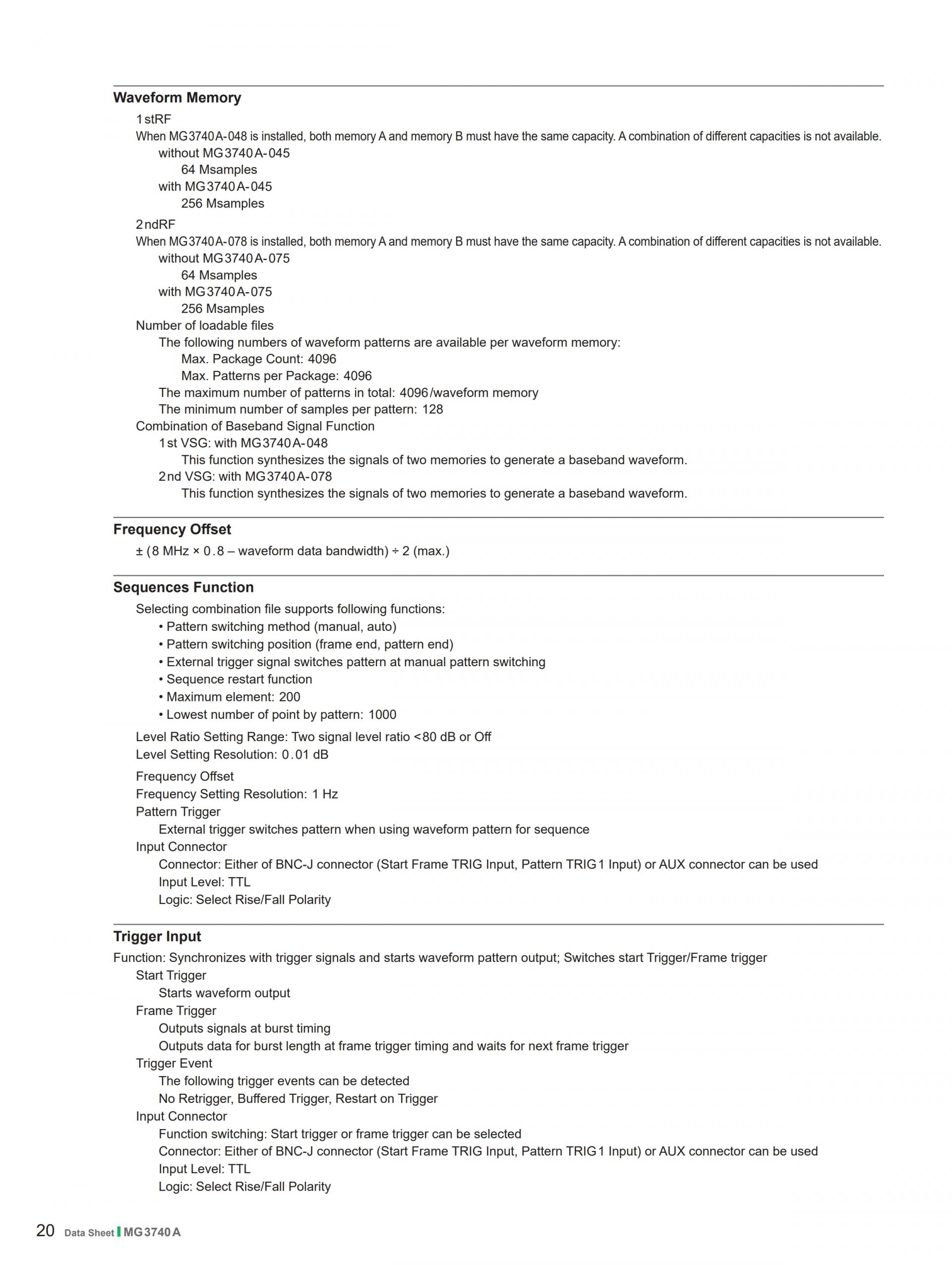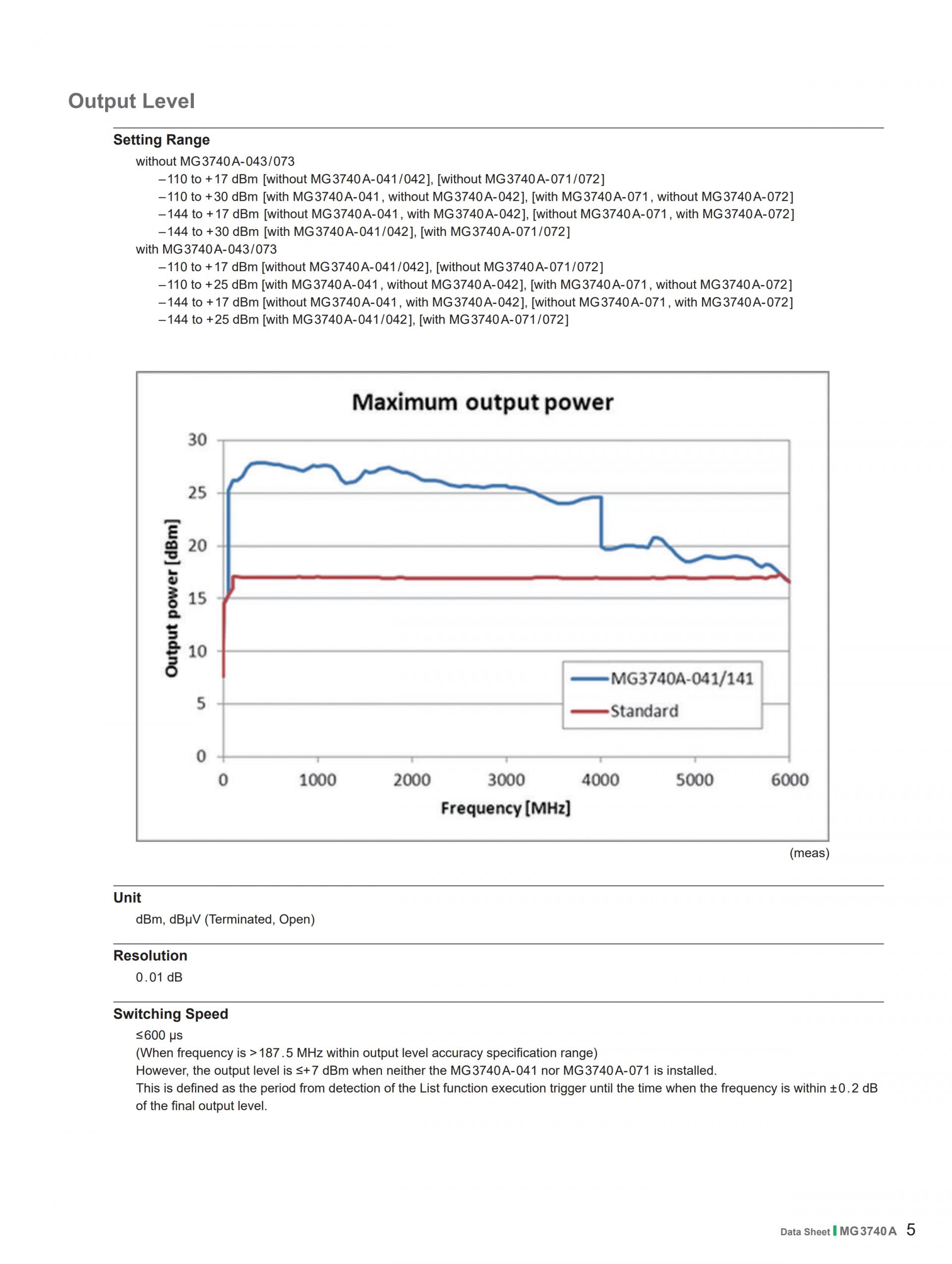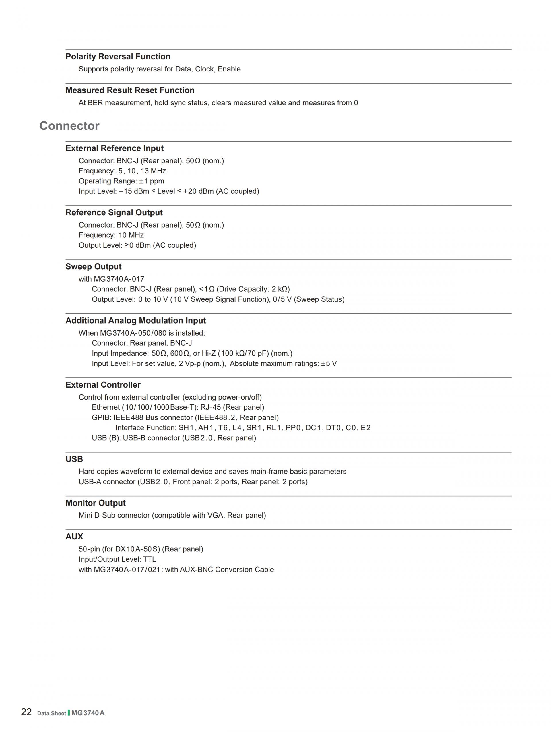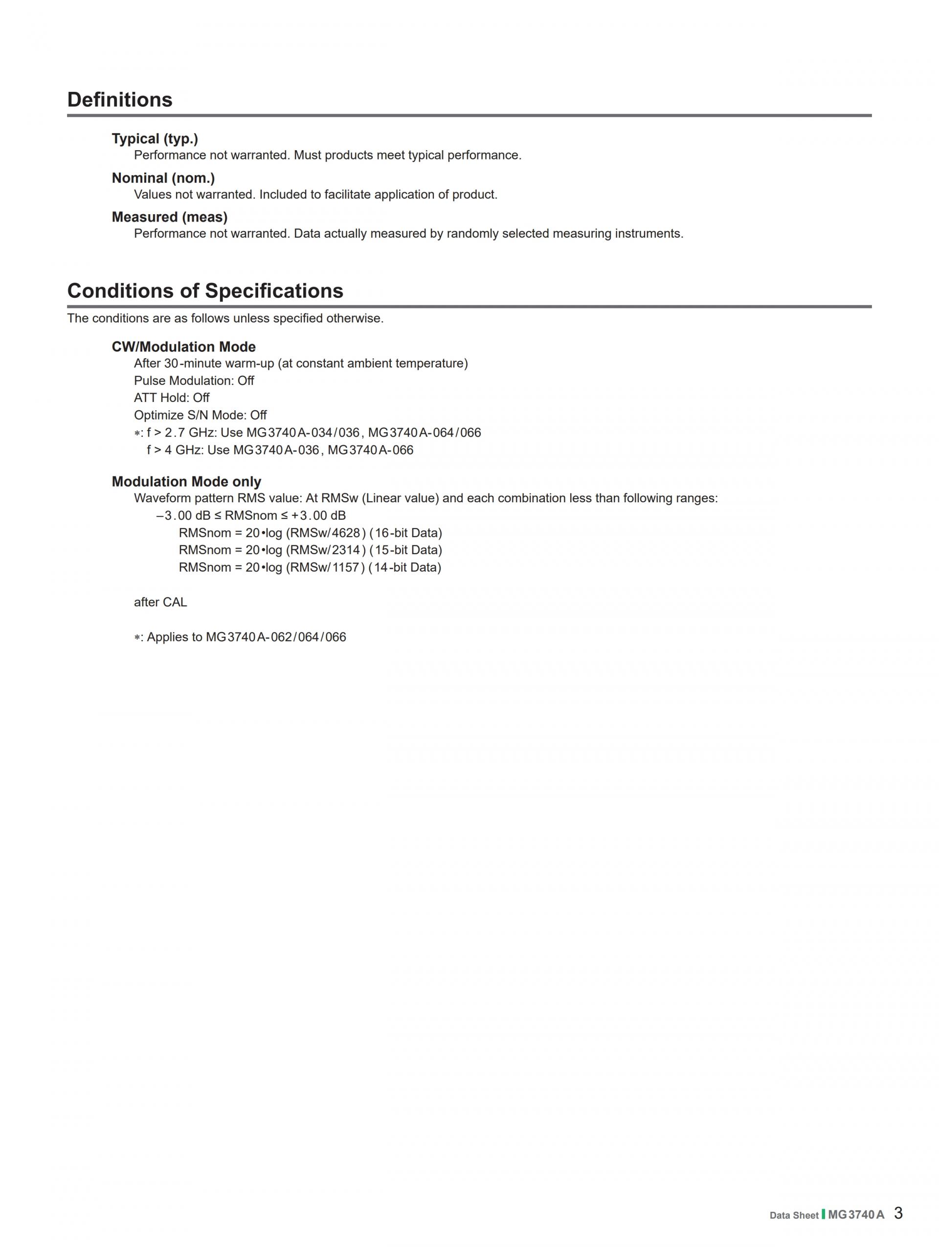 아날로그 신호 발생기 MG3740A는 SSB 위상 잡음, 출력 레벨, 다채로운 변조 기능 (AM/FM/ΦM/펄스) 등 탁월한 RF 사양을 갖추고 있습니다. MG3740A는 아날로그 무선 Rx 특성 테스트용 고순도 신호 소스를 위한 이상적인 솔루션입니다. 또한, 디지털 변조 옵션 추가는 협대역 디지털 변조 신호 생성을 지원합니다.