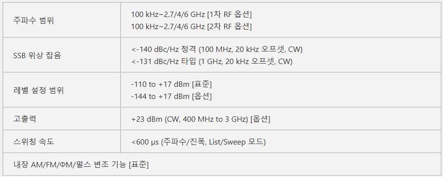 Supports "Rx 특성 테스트용 Wanted + 간섭파", "앰프 상호 변조 특성 평가", "믹서 평가용 RF/LO 신호 소스"를 지원합니다.