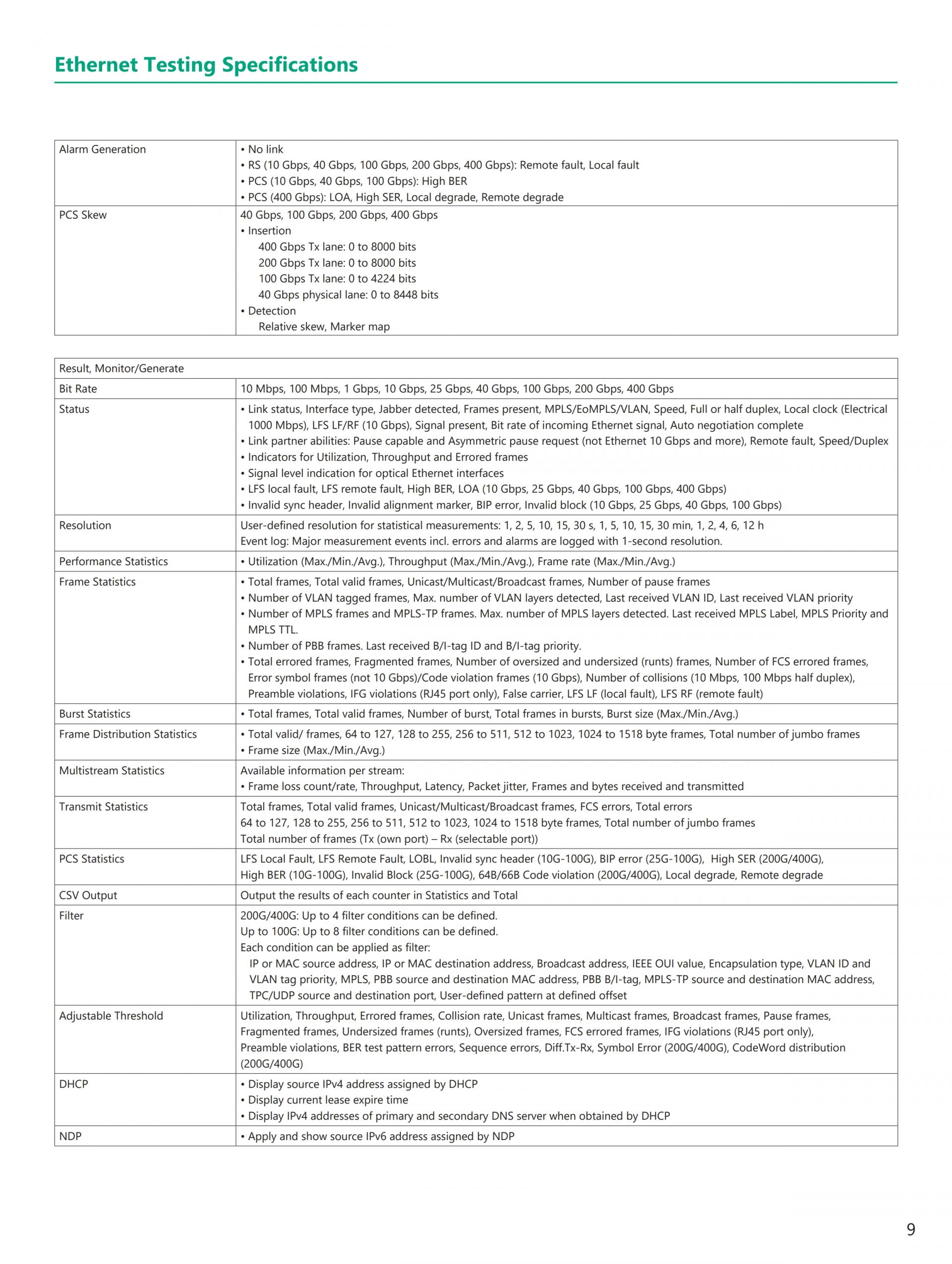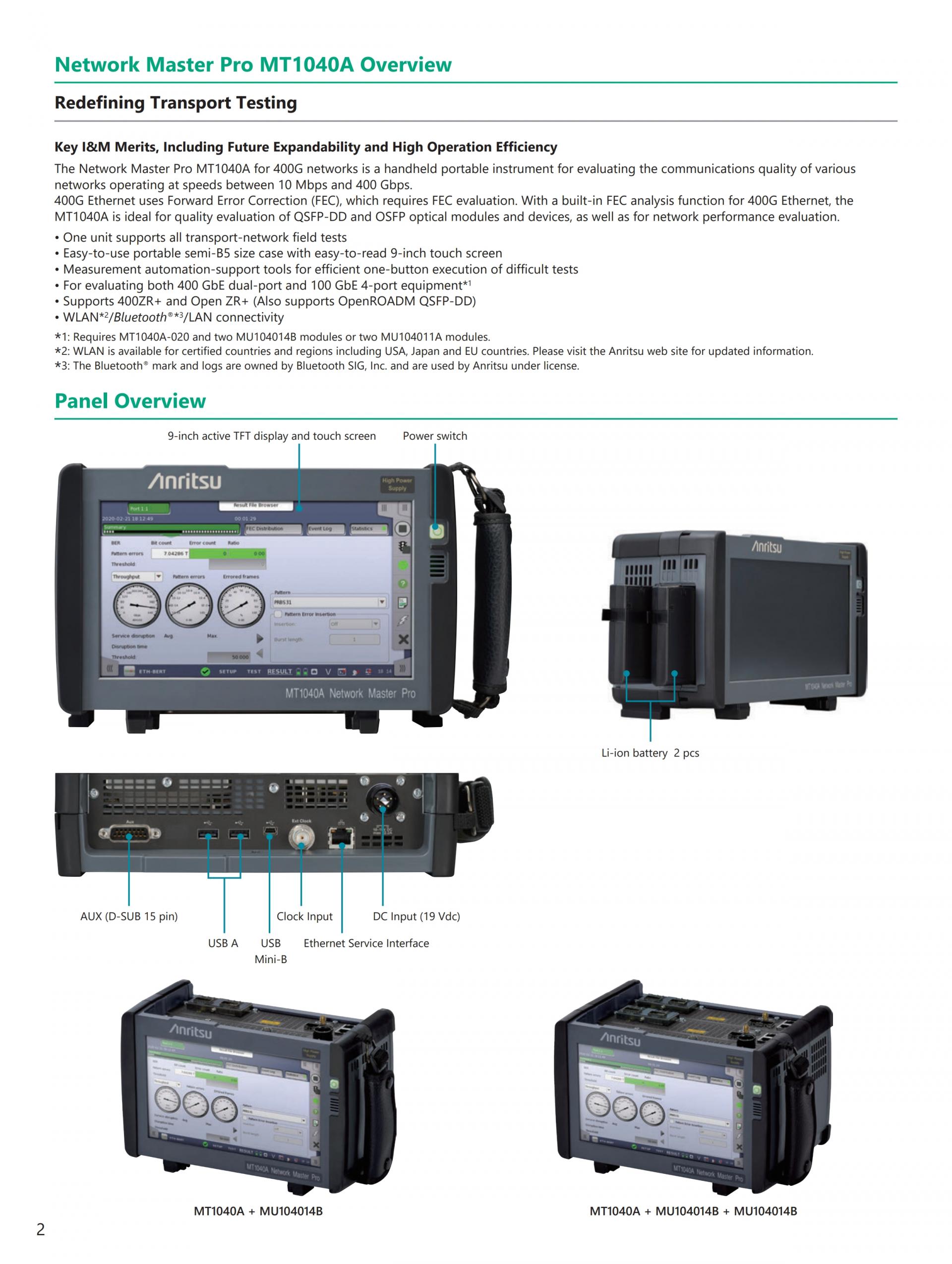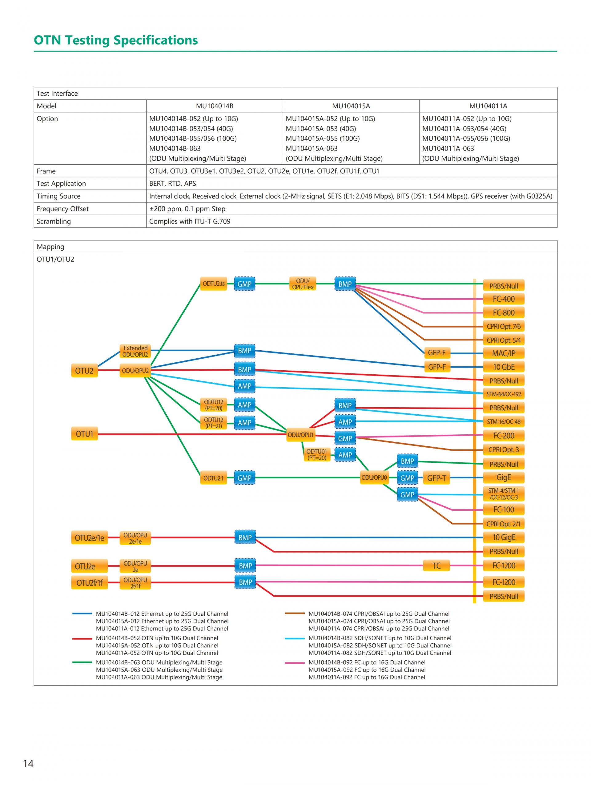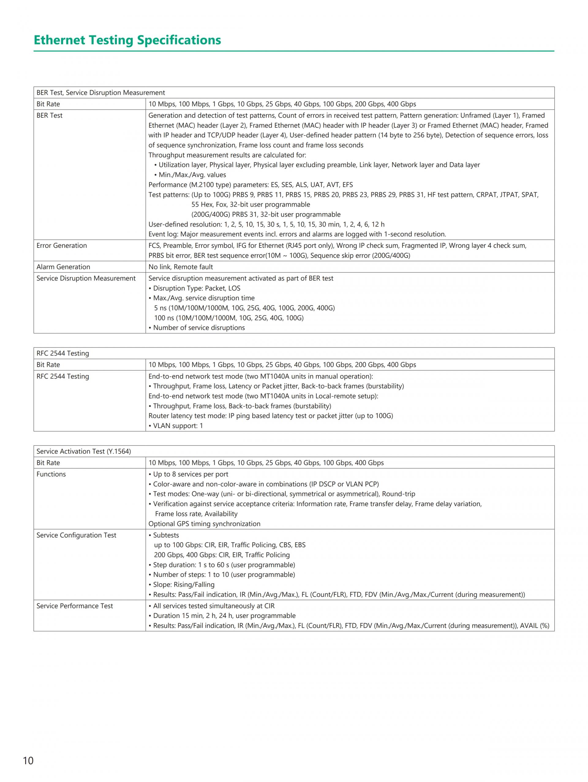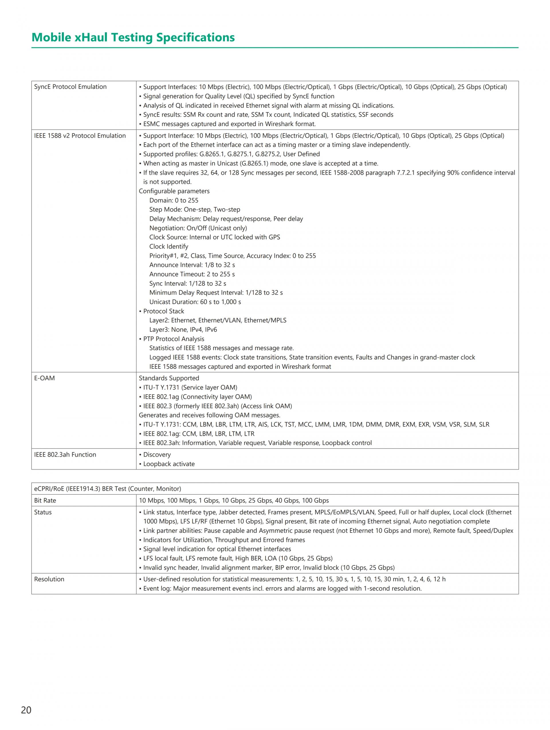 - 현재(이더넷, eCPRI/IEEE1914.3/CPRI/OBSAI, OTN, 파이버 채널) 및 Legacy(SONET/SDH) 기술 지원 전체 이더넷 벤치마크 테스트 제품군 RFC2544, Y.1564, RFC6349