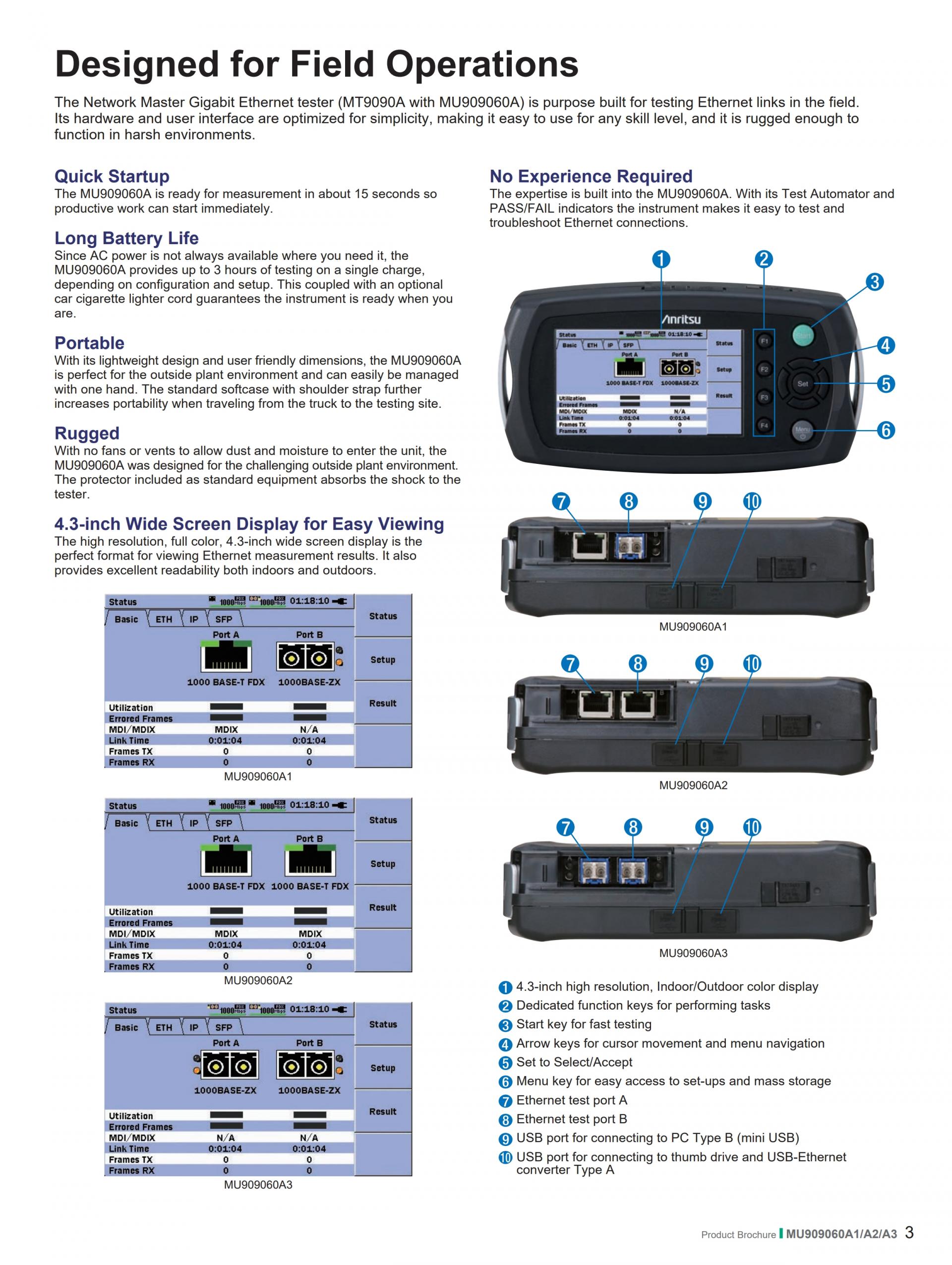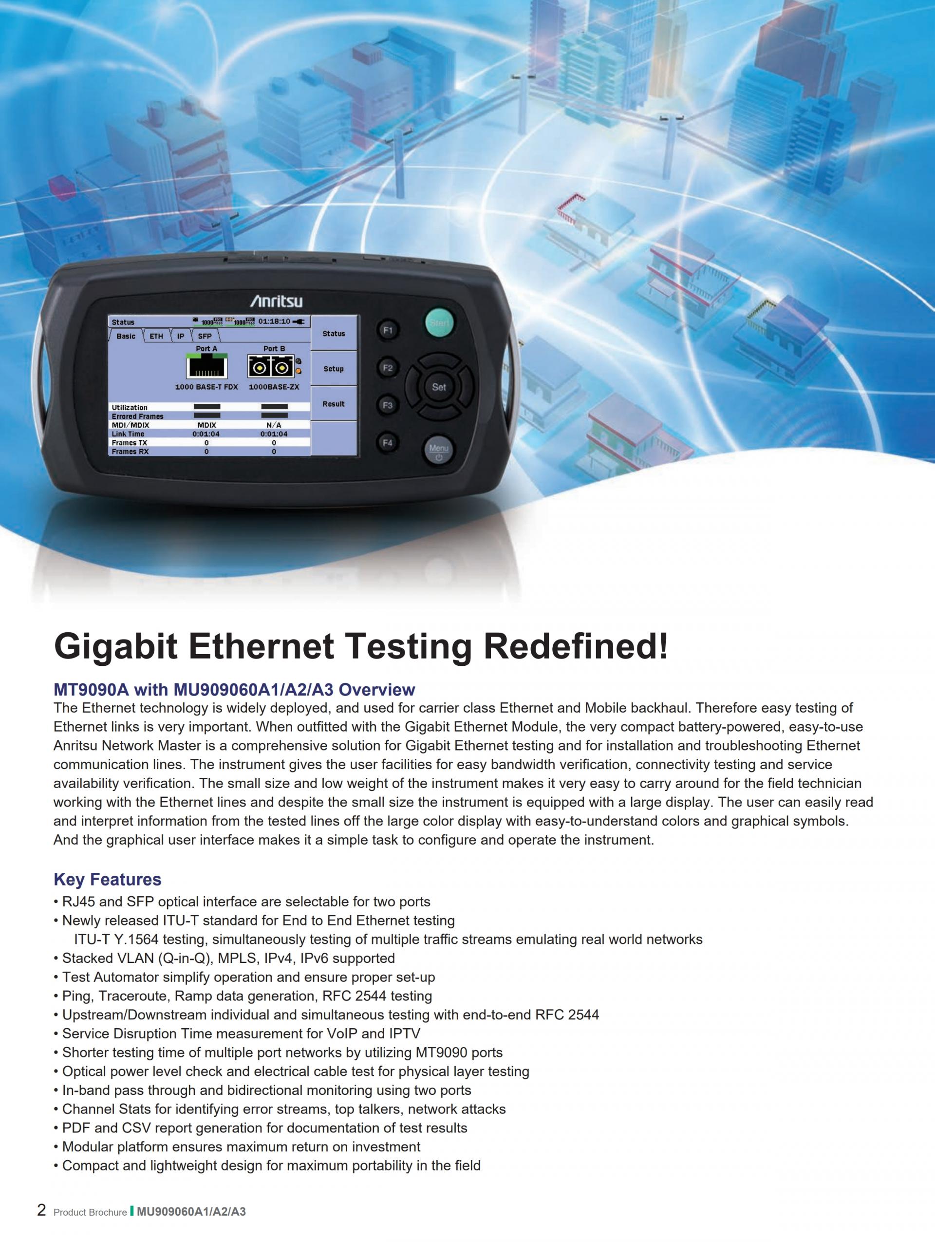 배터리로 작동하고, 사용이 간편하며, 매우 콤팩트한 Anritsu Network Master는 기가비트 이더넷 모듈을 갖췄을 때 기가비트 이더넷 테스트는 물론 이더넷 통신 라인의 설치와 문제해결에 광범위하게 쓰이는 솔루션입니다.