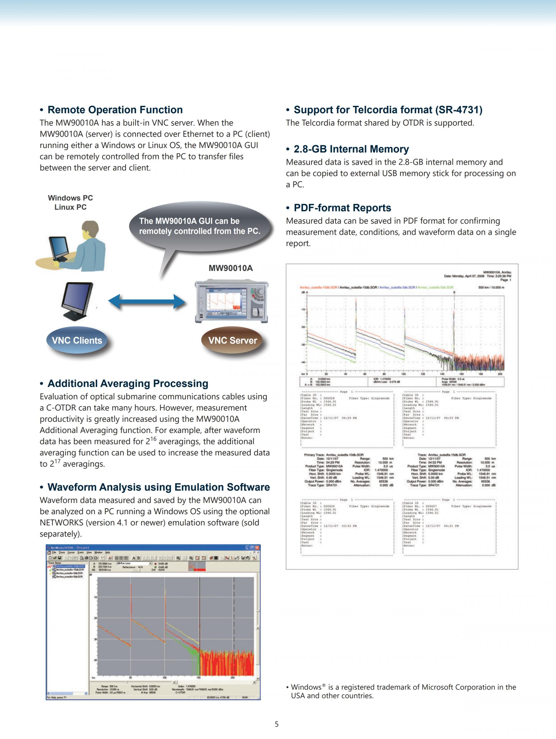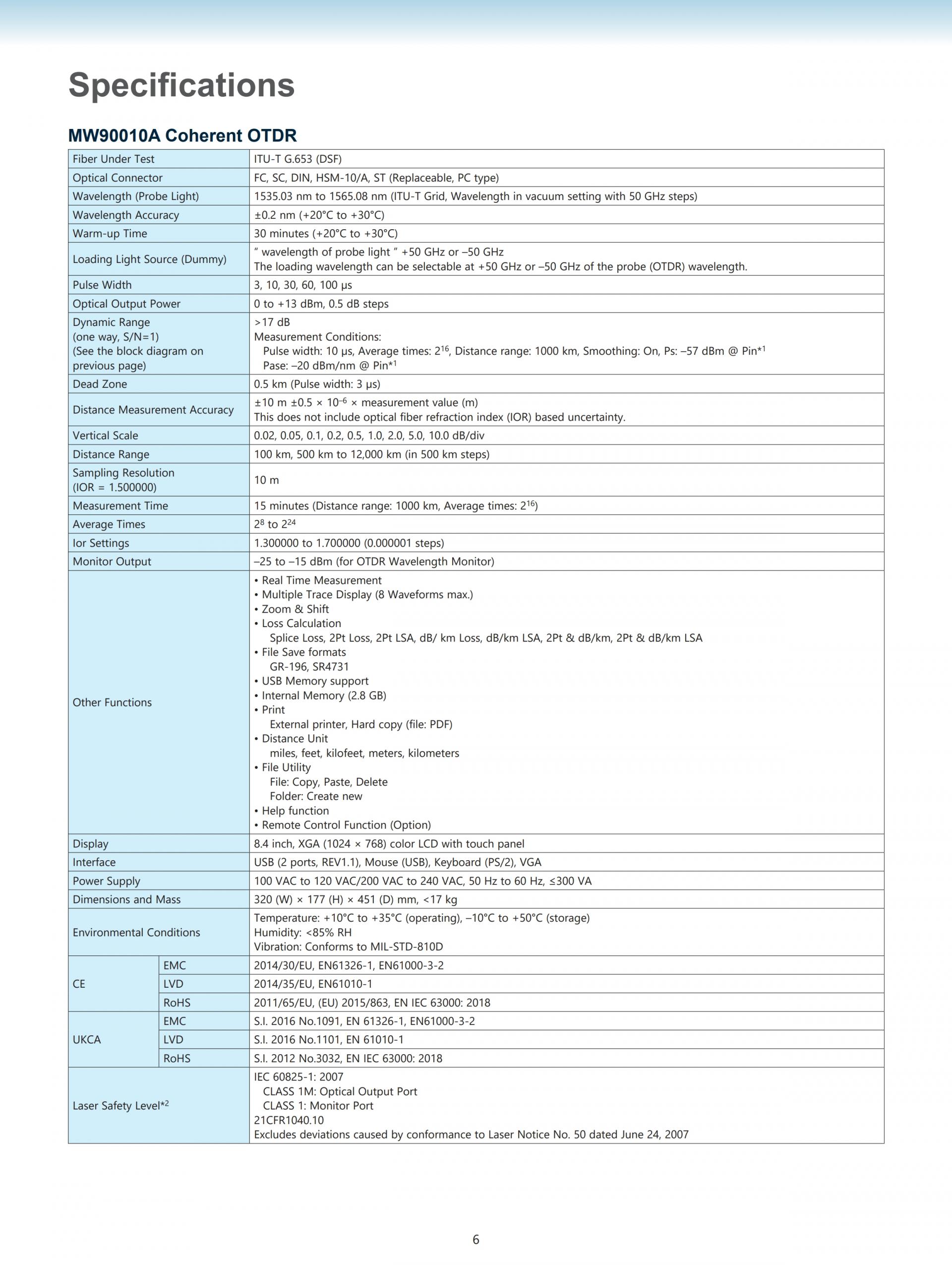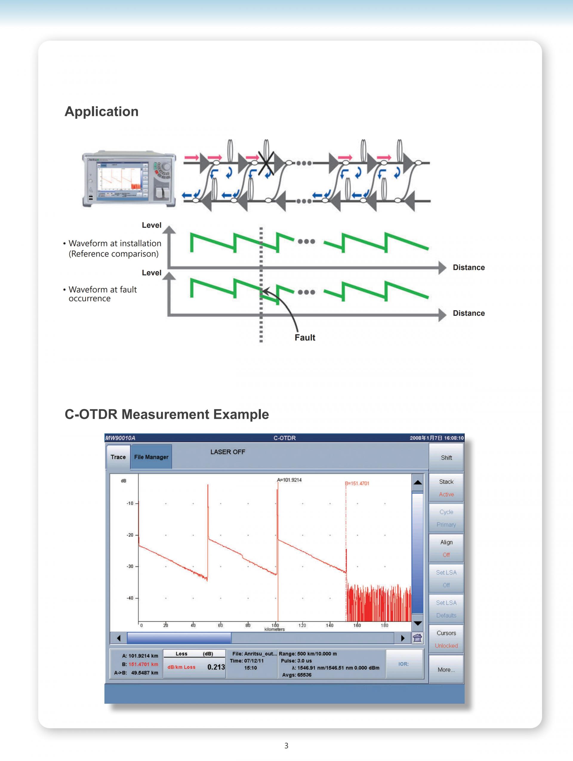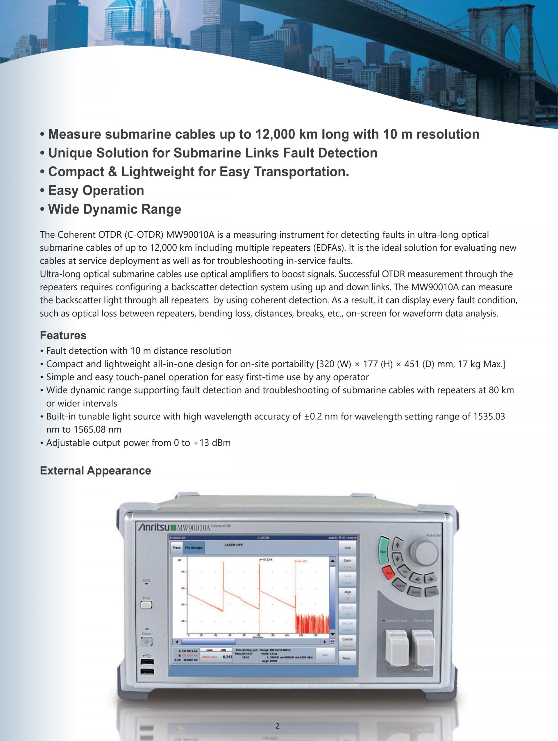 OTDR MW90010A는, 최대 12,000km까지의 초장거리빛해저 케이블의 장해검출을 10m의 측정 분해능으로 실현된 OTDR입니다.