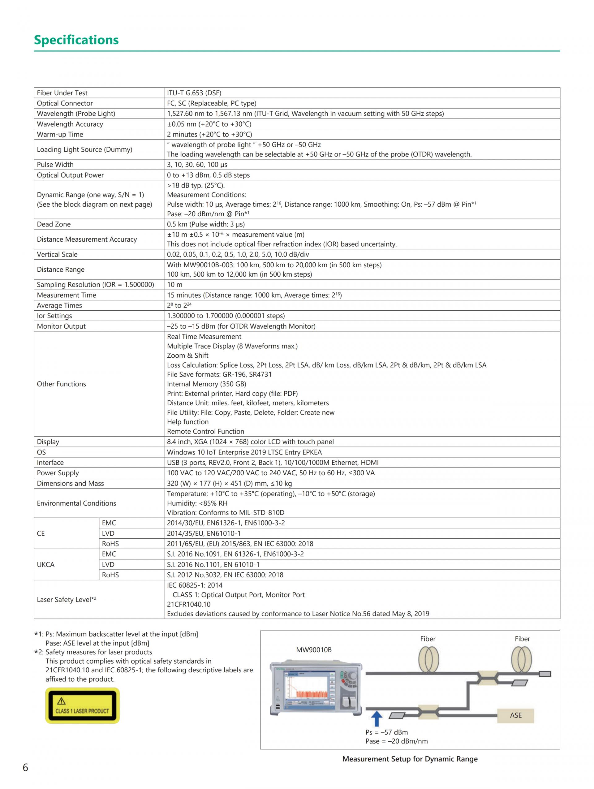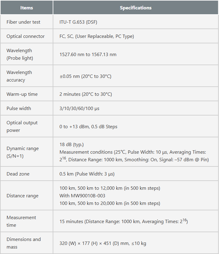 The MW90010B has a tunable light source covering C-band wavelengths. The 10 m resolution locates fault precisely and the 20,000 km max. range supports submarine-cable measurement.