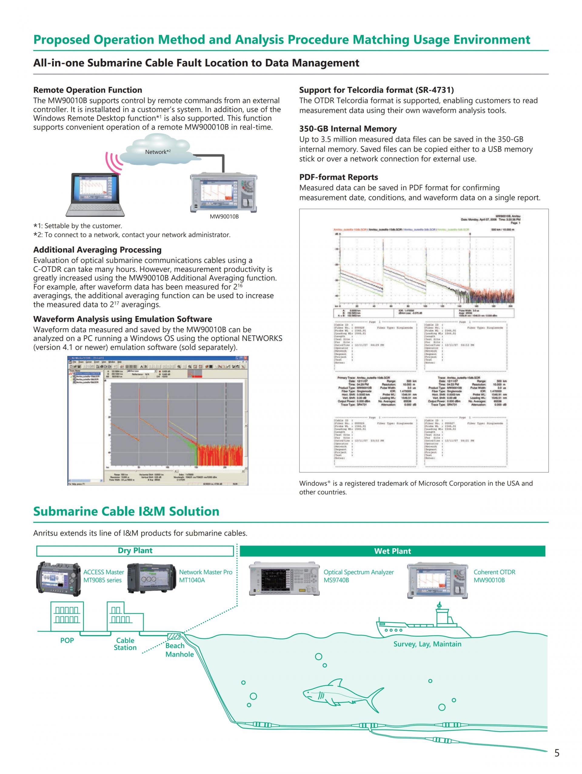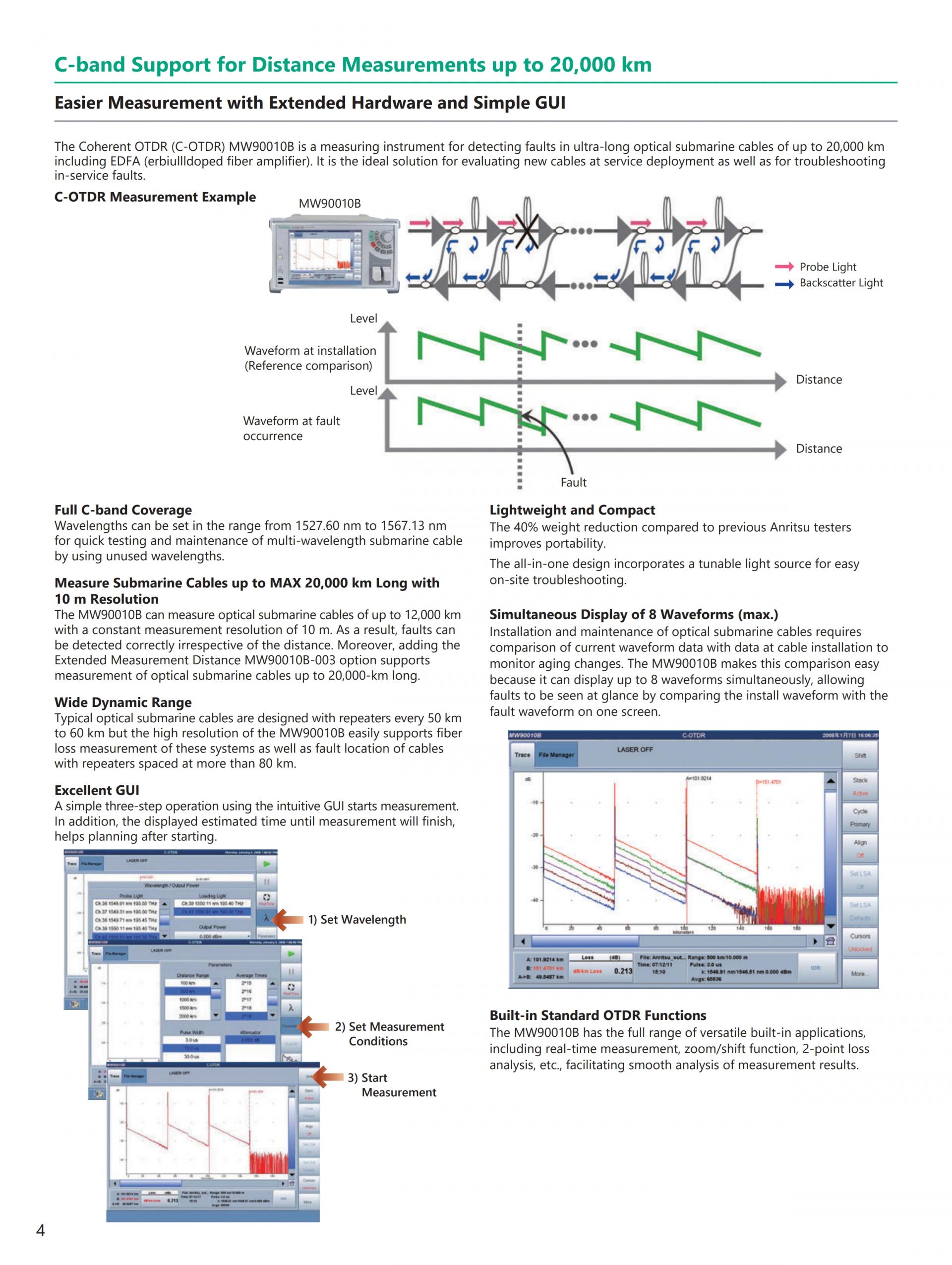The Coherent OTDR MW90010B can measure ultra-long submarine cables of up to 20,000 km to locate faults with 10 m measurement resolution.
