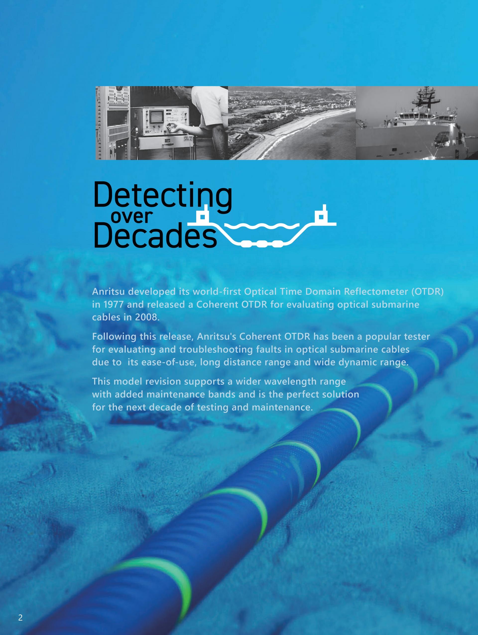 Coherent detection technology captures waveform data, including fault location, cable loss, bending loss, fiber length, etc., for detailed evaluation of submarine cables. Its excellent basic performance, such as measurement time and dynamic range, accurately measures submarine cables with optical-amplifier repeaters separated by distances of 80 km or more.