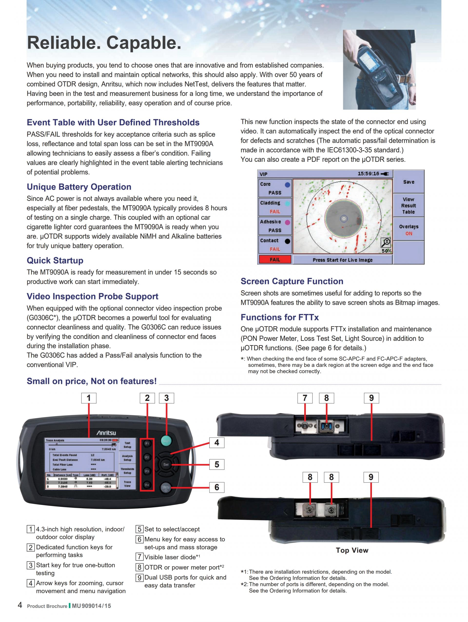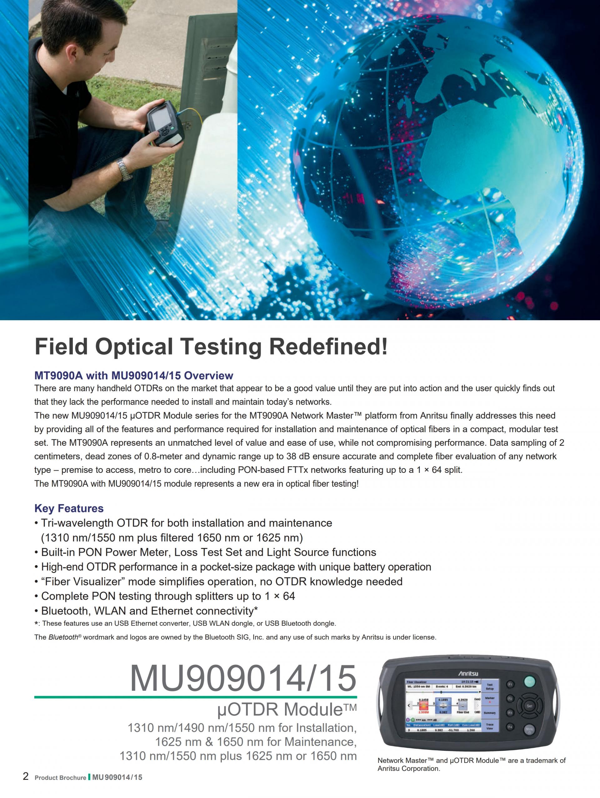 성능 저하 없는 핸드헬드 OTDR인 Anritsu의 µOTDR MU909014A/A1을 소개합니다. 네 배나 크고 두 배나 비싼 전통적인 OTDR에 비견할 만한 성능을 바탕으로, Network Master MT9090A µOTDR이 테스트 기계의 새로운 지평을 열었습니다. 정확한 이벤트 매핑을 위한 5 cm의 해상도, 1미터 미만의 데드존, 최대37 dB의 다이내믹 레인지를 갖추고 있어, 150 km 이상 또는 최대 1x64 스플릿의 PON 기반 FTTx 네트워크를 테스트하기에 충분합니다. MT9090A µOTDR은 또한 손바닥 안에 쏙 들어가는 핸드헬드 OTDR로서 이동성의 새로운 수준을 열고 있습니다.