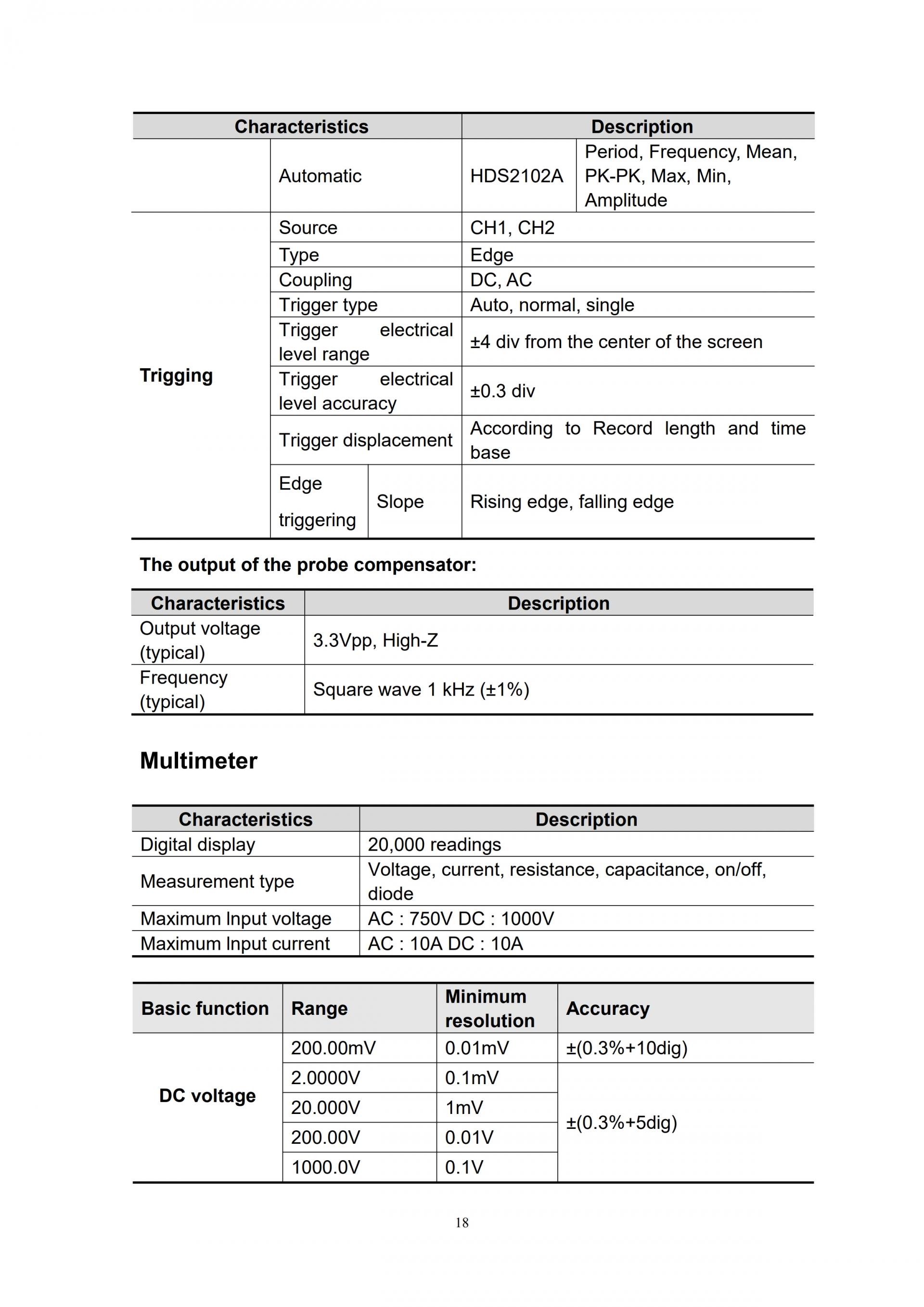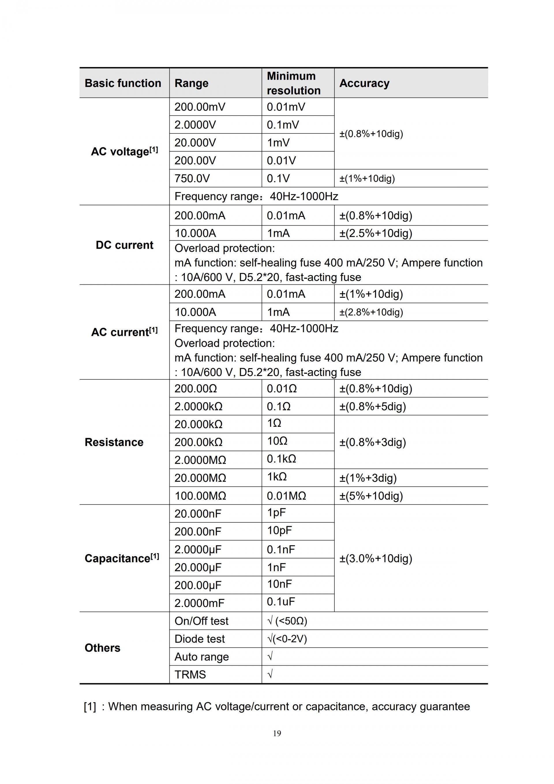 - 41/2 자리 멀티 미터 (20,000 카운트), 전압, 전류, 저항, 다이오드, 커패시턴스 및 연속성 테스트 지원
