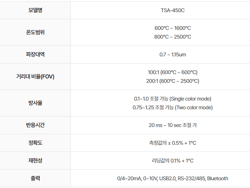 - 출력 : 0/4~20mA, 0~10V, USB2.0, RS-232/485, Bluetooth