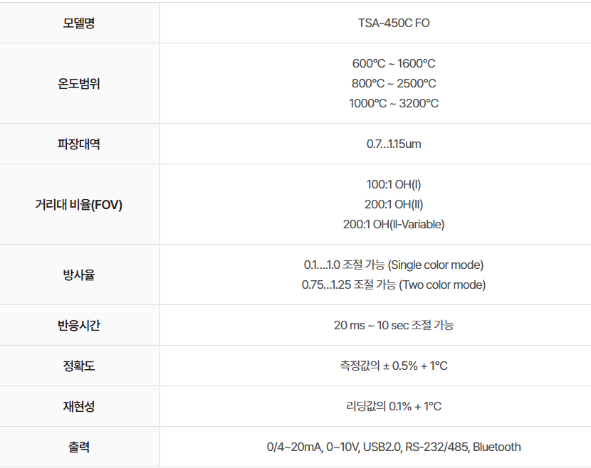 - 출력 : 0/4~20mA, 0~10V, USB2.0, RS-232/485, Bluetooth