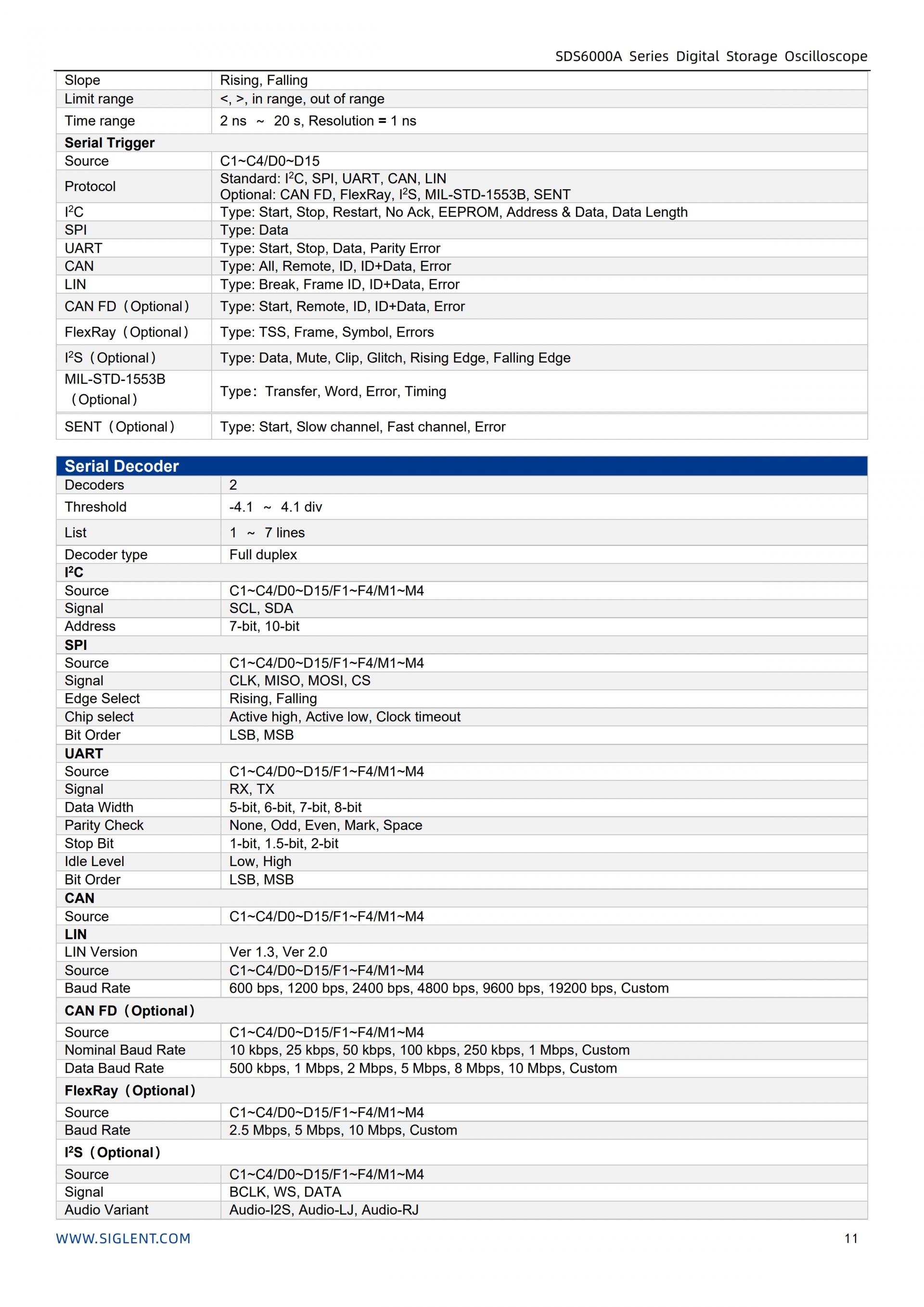 - 직렬 버스 트리거링 및 디코더는 I 2 C, SPI, UART, CAN, LIN, CAN FD, FlexRay, I 2 S, MIL-STD-1553B, SENT 및 Manchester 프로토콜을 지원합니다.