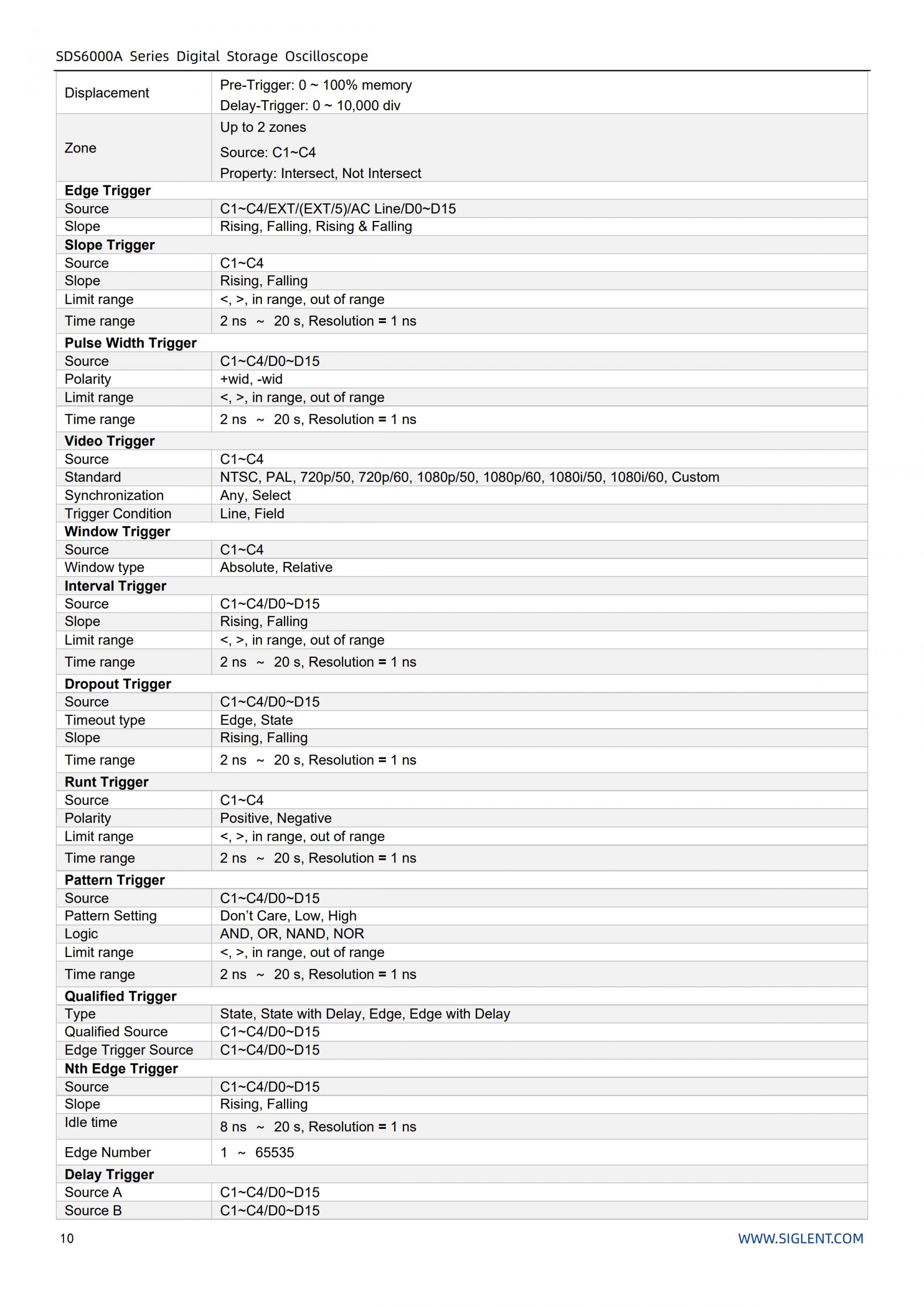 - 지능형 트리거: 에지, 슬로프, 펄스, 윈도우, 런트, 인터벌, 드롭아웃, 패턴, 한정, N번째 에지, 셋업/홀드, 지연, 비디오(HDTV 지원). 존 트리거는 고급 트리거를 간소화합니다.