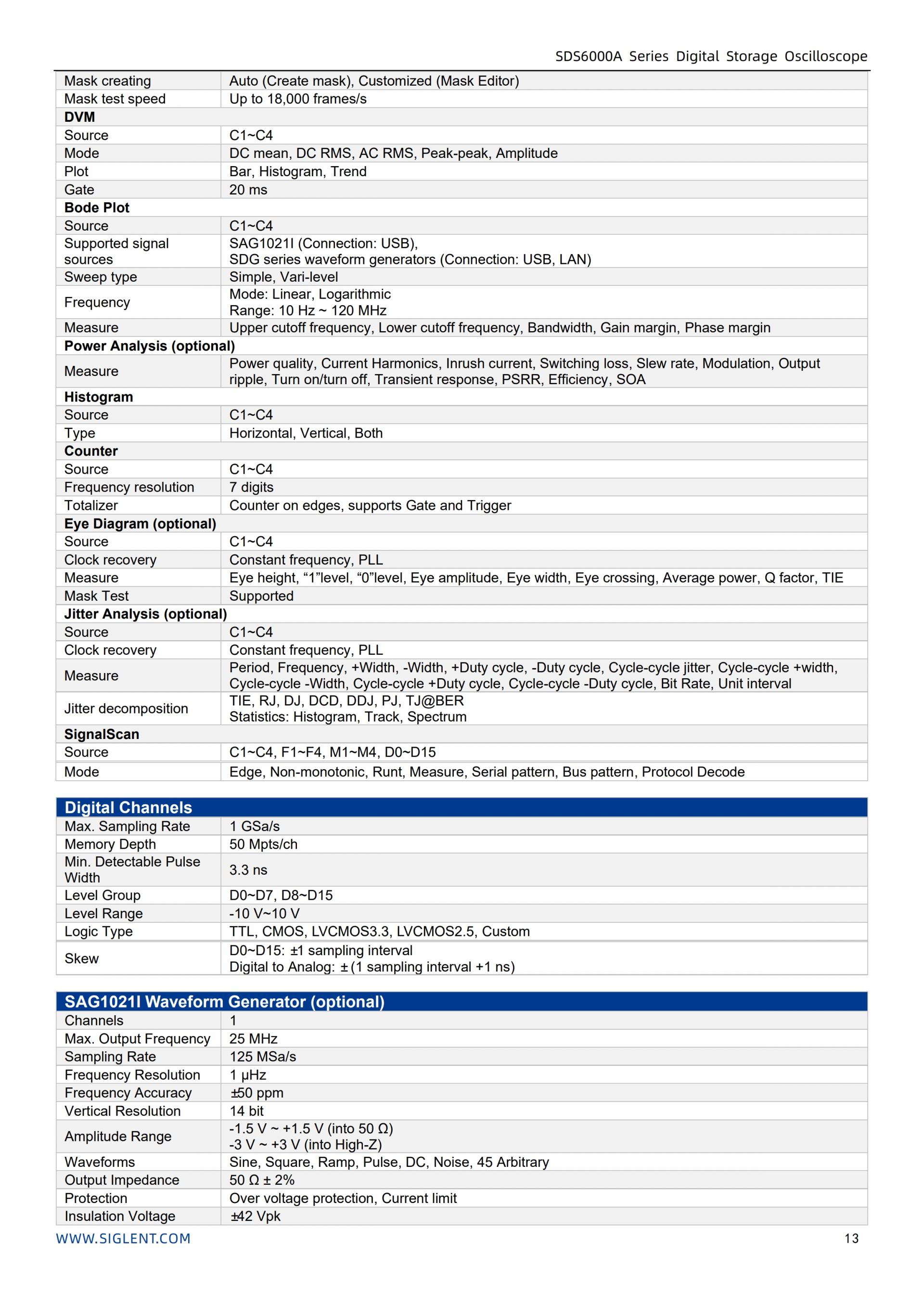SIGLENT의 SDS6000A 시리즈 디지털 스토리지 오실로스코프는 2GHz, 1GHz, 500MHz의 대역폭으로 제공되며, 각 채널에서 5GSa/s(10GSa/s ESR)의 샘플링 속도, 최대 500Mpts/ch의 레코드 길이를 갖추고 있으며, 최대 4개의 아날로그 채널과 16개의 디지털 채널을 표시하여 혼합 신호 분석 기능을 제공합니다.