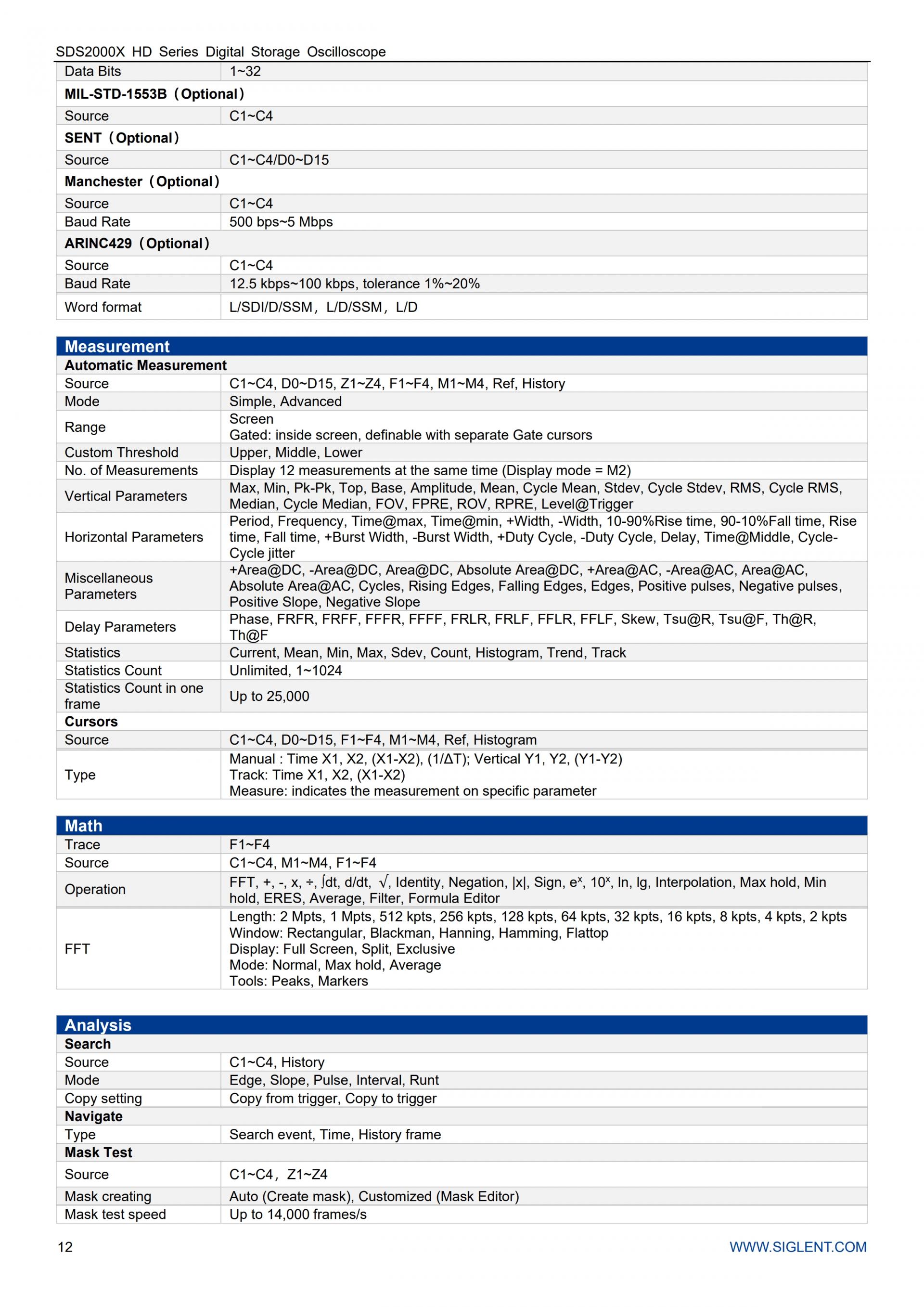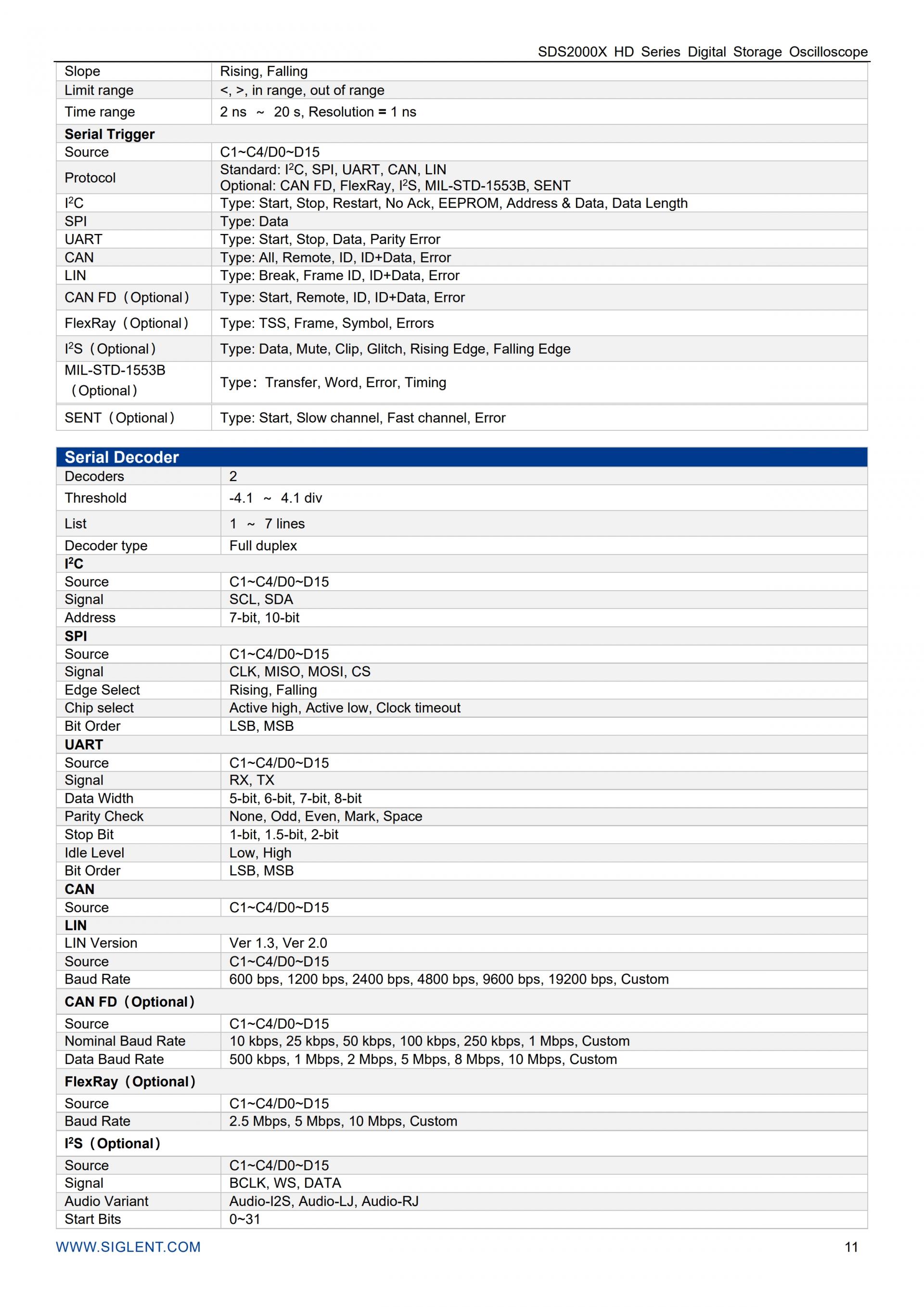 - 직렬 버스 트리거링 및 디코더는 I 2 C, SPI, UART, CAN, LIN, CAN FD, FlexRay, I 2 S, MIL-STD-1553B, SENT 및 Manchester 프로토콜을 지원합니다.