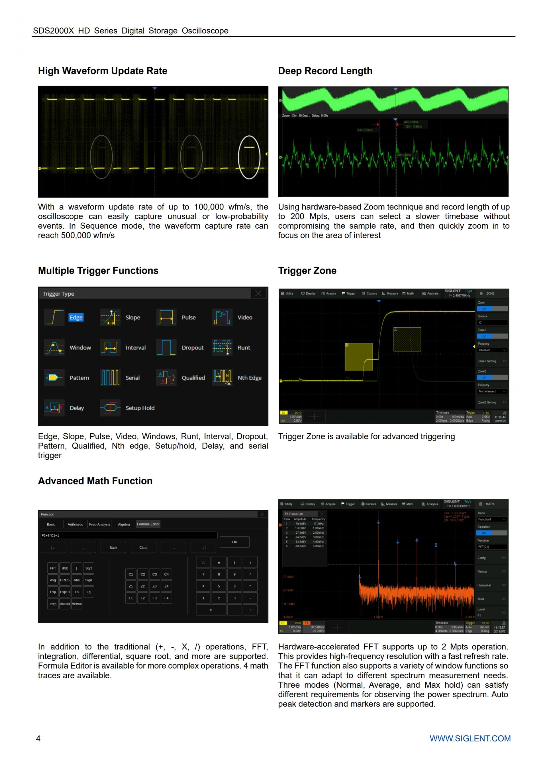 - 2개의 수학 추적(2 Mpts FFT, 덧셈, 뺄셈, 곱셈, 나눗셈, 적분, 미분, 제곱근 등), 수식 편집기 지원
