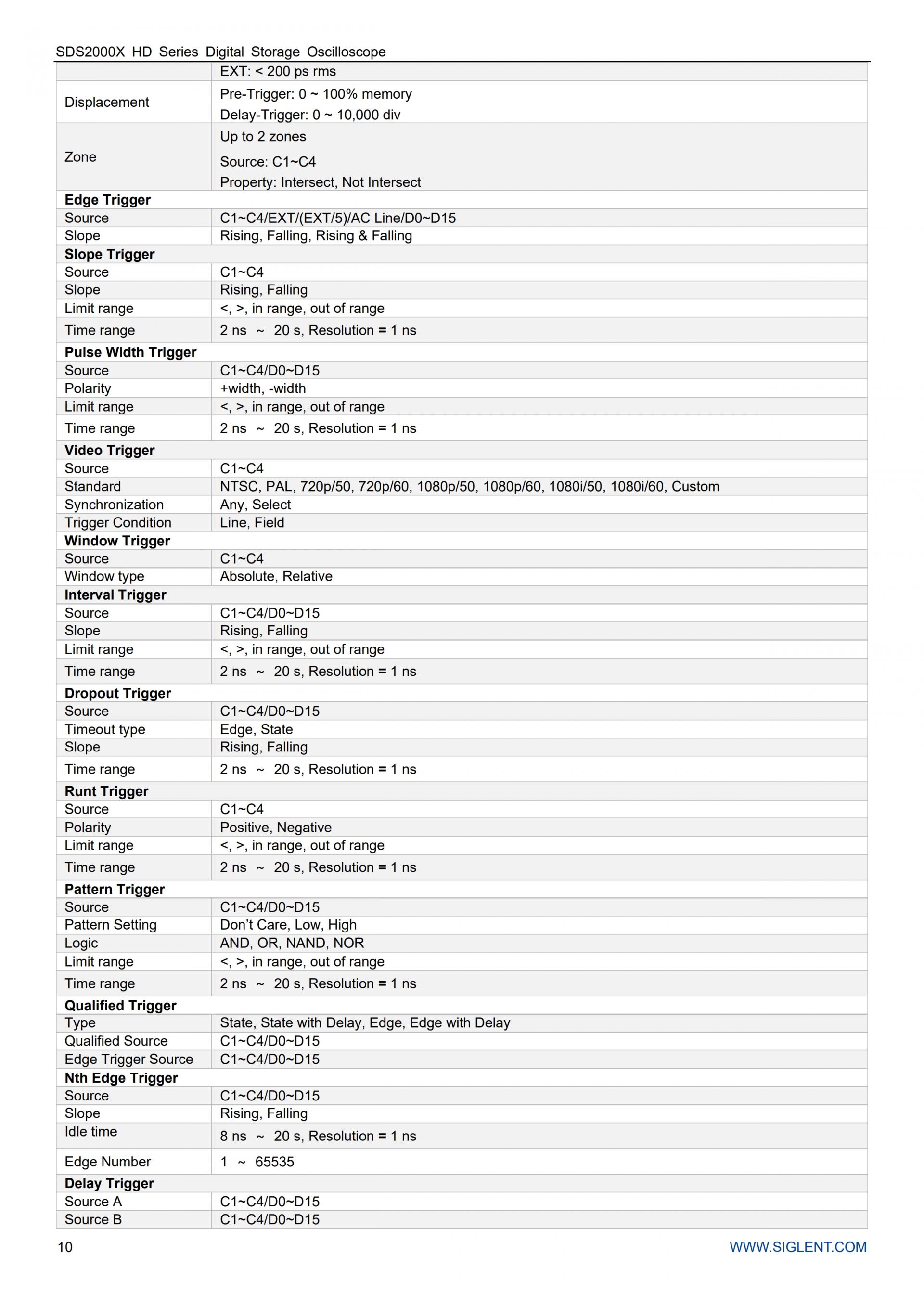 - 지능형 트리거: 에지, 슬로프, 펄스, 윈도우, 런트, 인터벌, 드롭아웃, 패턴, 한정, N번째 에지, 셋업/홀드, 지연 및 비디오(HDTV 지원). 존 트리거는 고급 트리거를 간소화합니다.