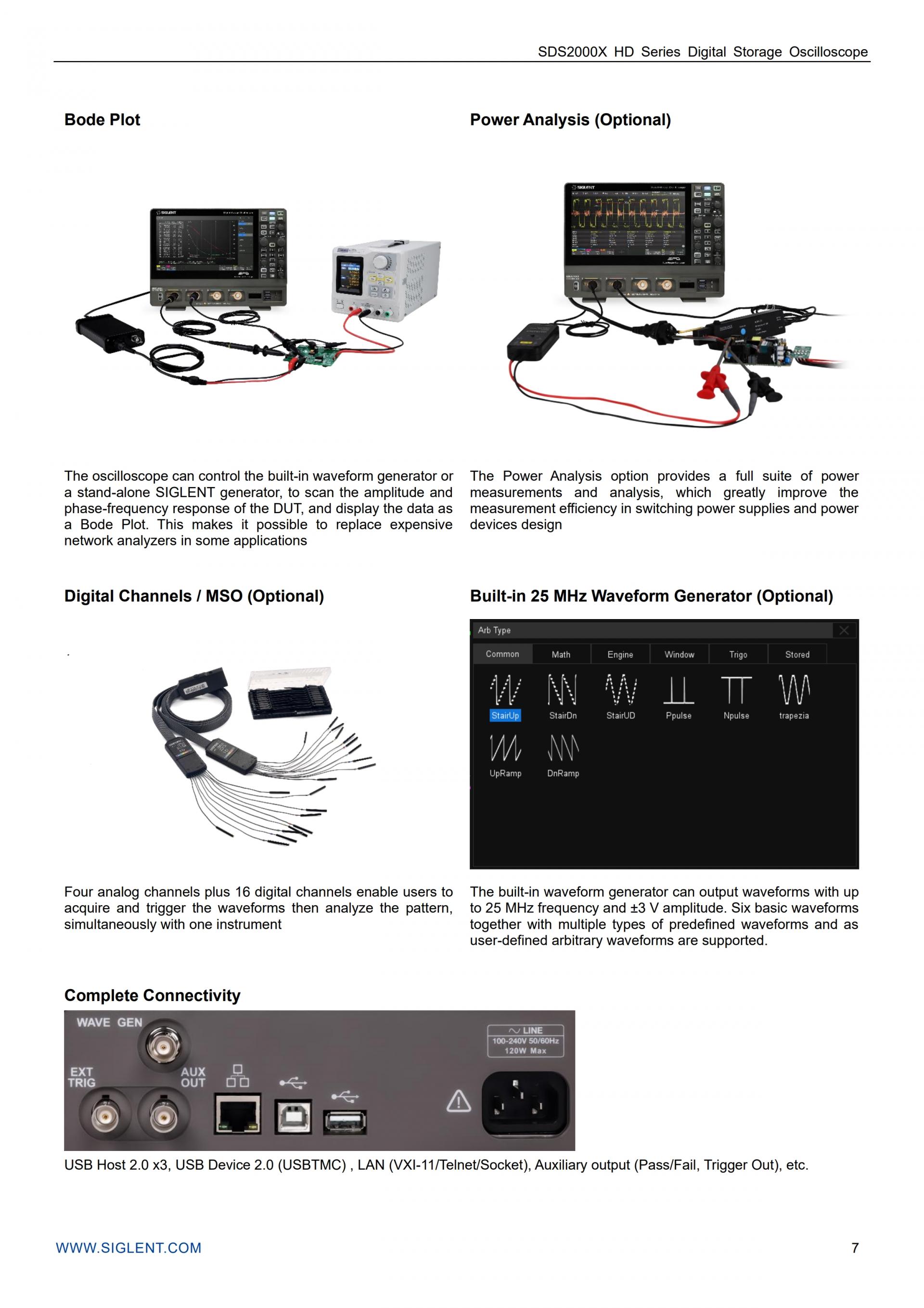 - 검색, 탐색, 디지털 전압계, 카운터, 파형 히스토그램, 보드 플롯 및 전력 분석과 같은 풍부한 데이터 분석 기능