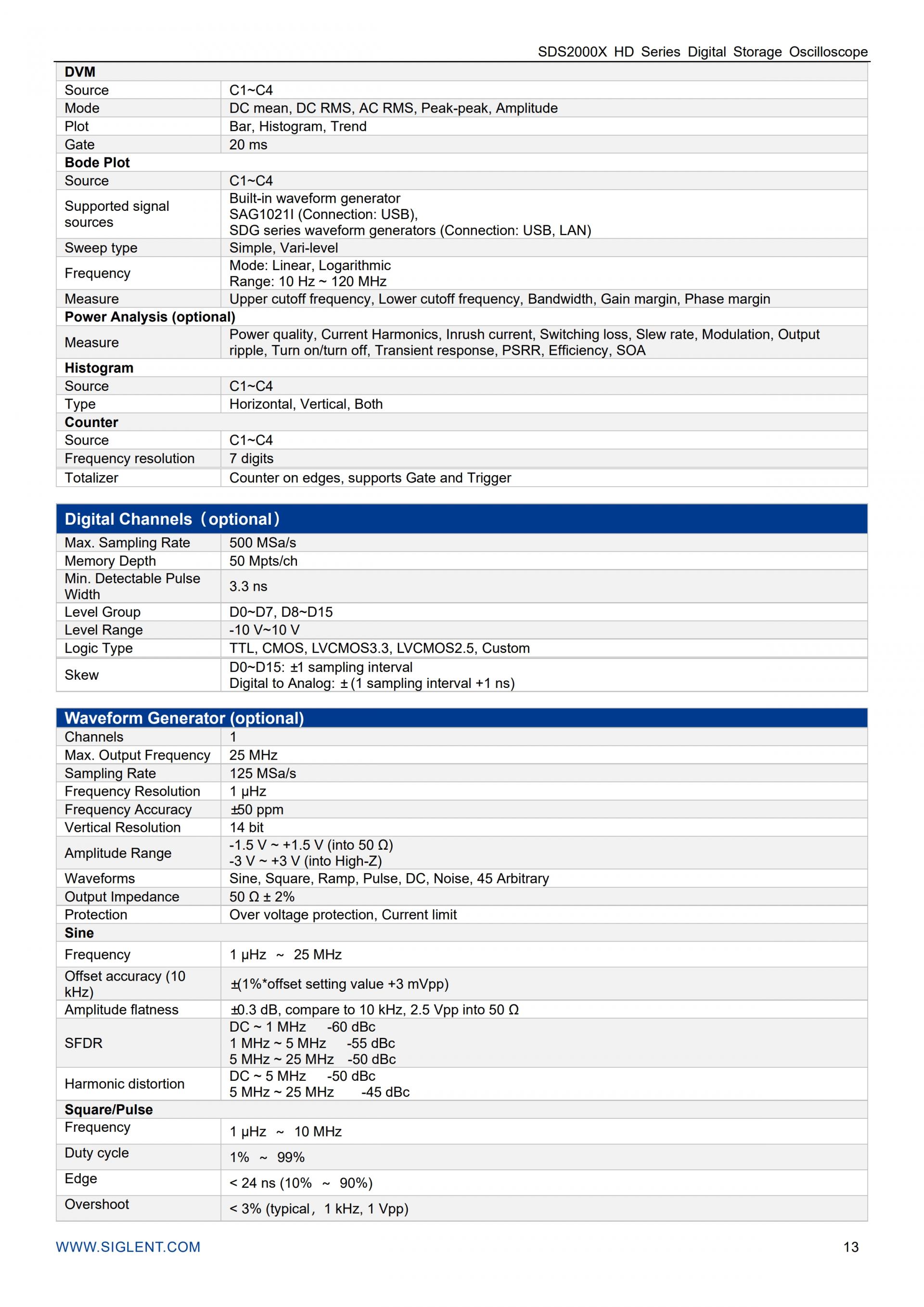SDS2000X HD 시리즈는 Siglent의 SPO 기술을 채택하여 최대 100,000 wfm/s(일반 모드, 시퀀스 모드 최대 500,000 wfm/s)의 파형 캡처 속도, 256단계 강도 등급 표시 기능, 그리고 색온도 표시 모드를 제공합니다. 또한, 높은 감도와 낮은 지터를 갖춘 혁신적인 디지털 트리거 시스템을 채택했습니다. 이 트리거 시스템은 직렬 버스 트리거링을 포함한 여러 강력한 트리거 모드를 지원합니다. 히스토리 파형 기록, 검색 및 탐색 기능, 마스크 테스트, 보드 플롯, 전력 분석, 히스토그램과 같은 도구를 사용하여 확장된 파형 기록을 캡처, 저장 및 분석할 수 있습니다. SDS2000X HD는 다양한 측정 및 연산 기능, 25MHz 임의 파형 발생기 옵션, 그리고 직렬 디코딩 기능도 제공합니다.