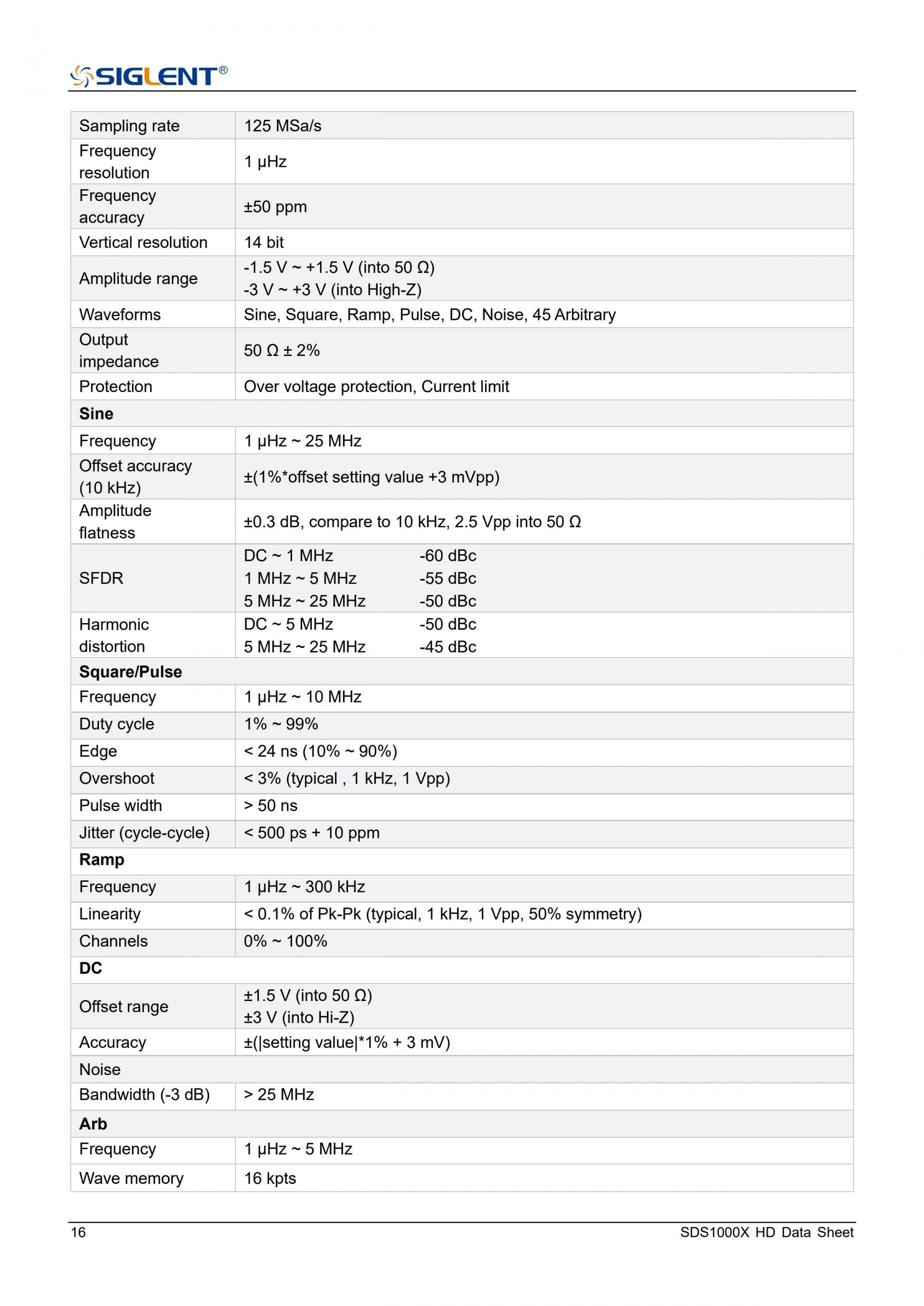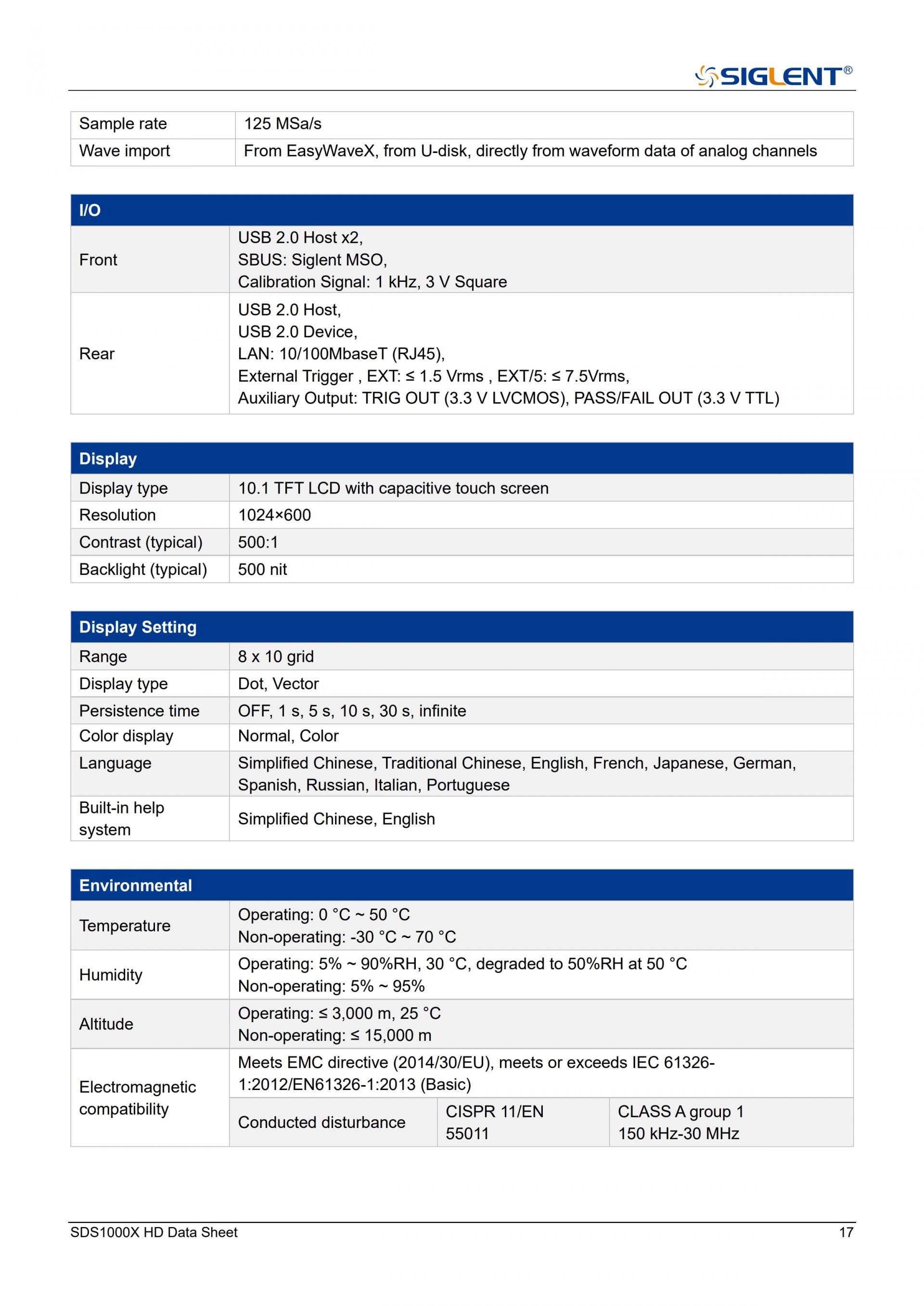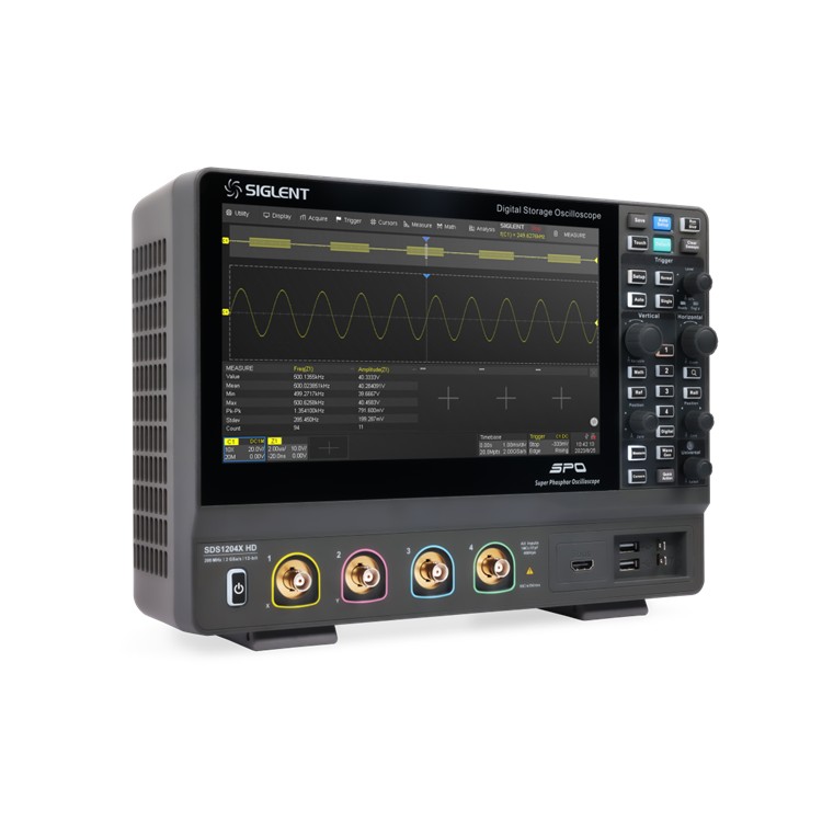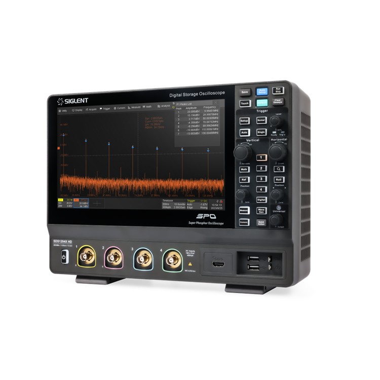 SDS1000X HD 시리즈는 Siglent의 SPO 기술을 채택하여 최대 120,000 wfm/s(일반 모드, 시퀀스 모드 최대 500,000 wfm/s)의 파형 캡처 속도, 256단계 강도 등급 표시 기능, 그리고 색온도 표시 모드를 제공합니다. 또한, 고감도와 낮은 지터를 갖춘 혁신적인 디지털 트리거 시스템을 채택했습니다. 이 트리거 시스템은 직렬 버스 트리거링을 포함한 여러 강력한 트리거 모드를 지원합니다. 히스토리 파형 기록, 검색 및 탐색 기능, 마스크 테스트, 보드 플롯, 전력 분석 등의 도구를 사용하여 확장된 파형 기록을 캡처, 저장 및 분석할 수 있습니다. SDS1000X HD는 다양한 측정 및 연산 기능, 25MHz 임의 파형 발생기 옵션, 그리고 직렬 디코딩 기능도 제공합니다.