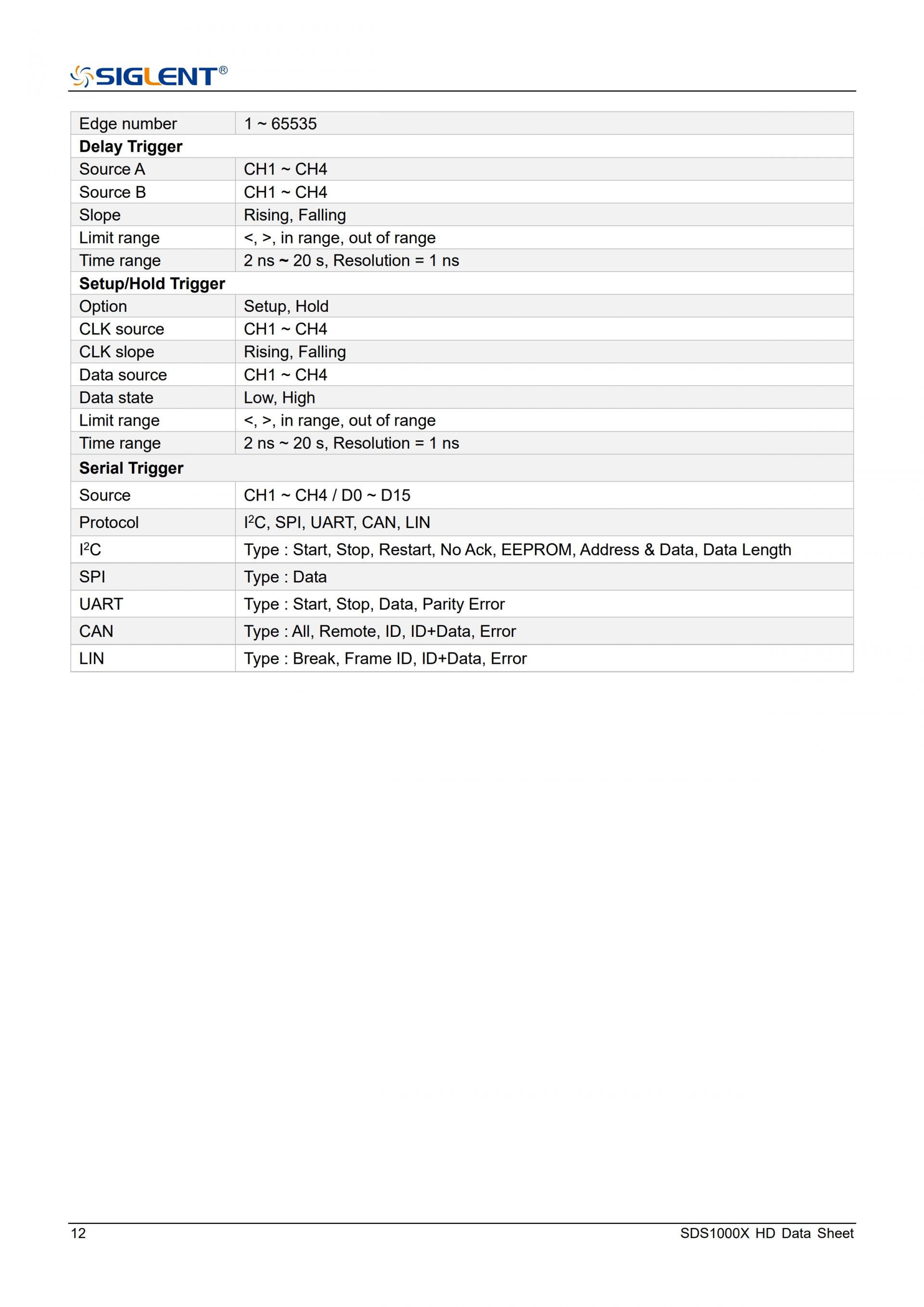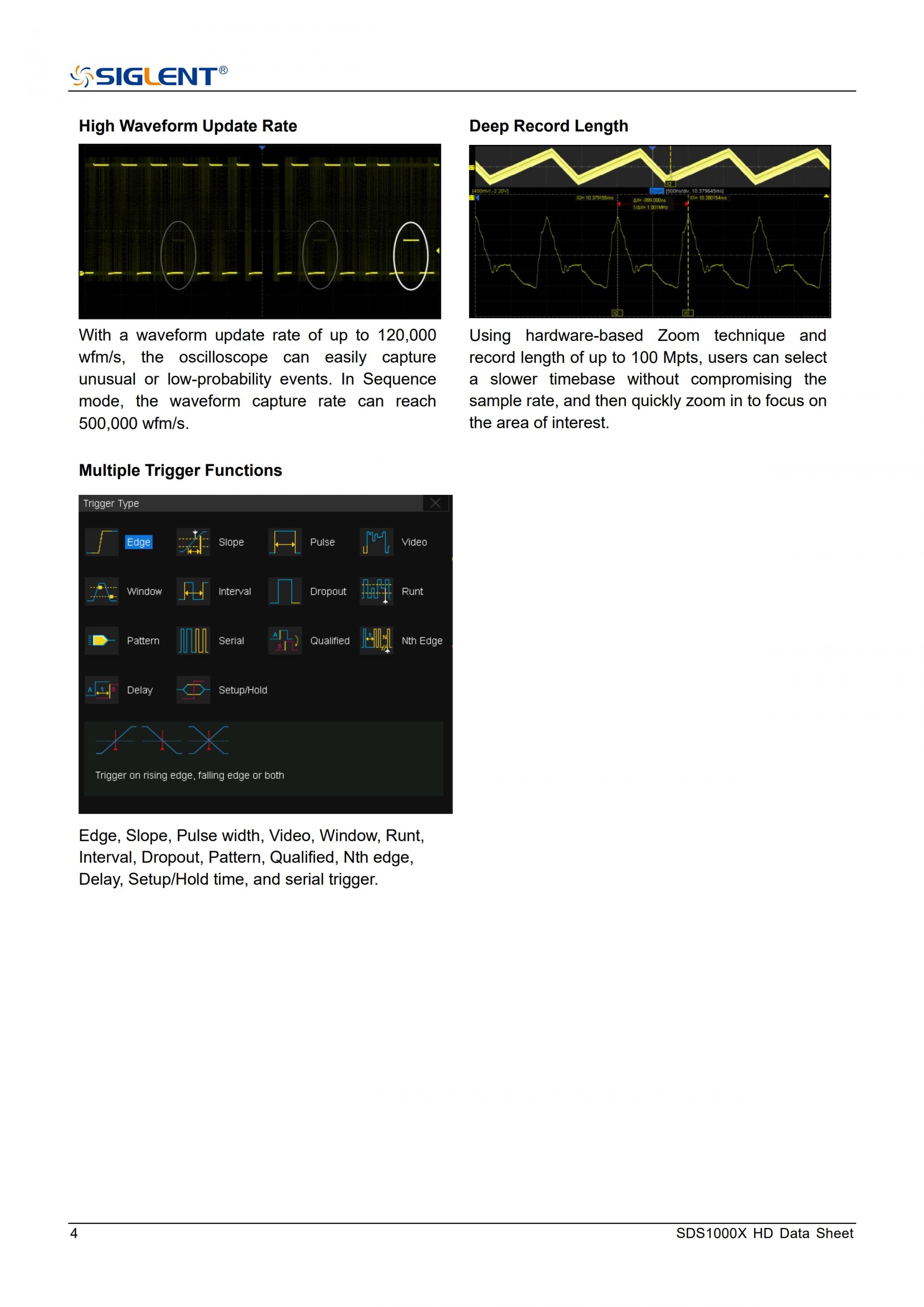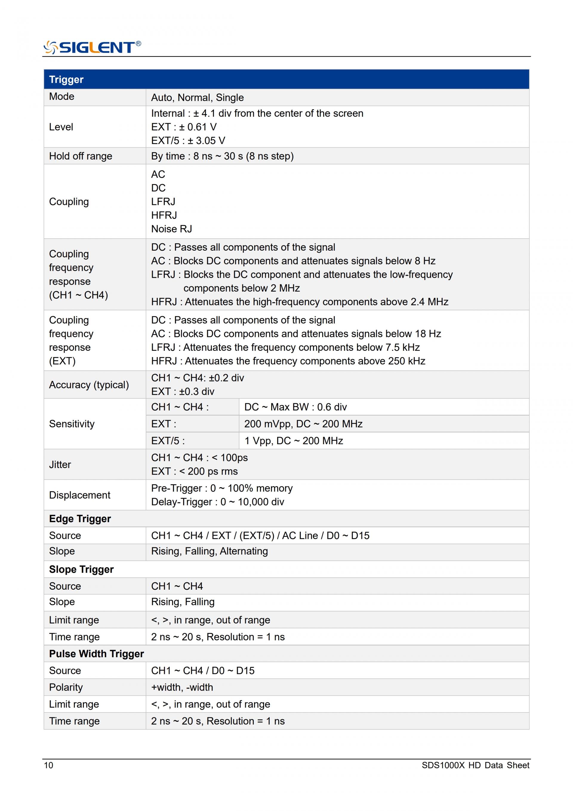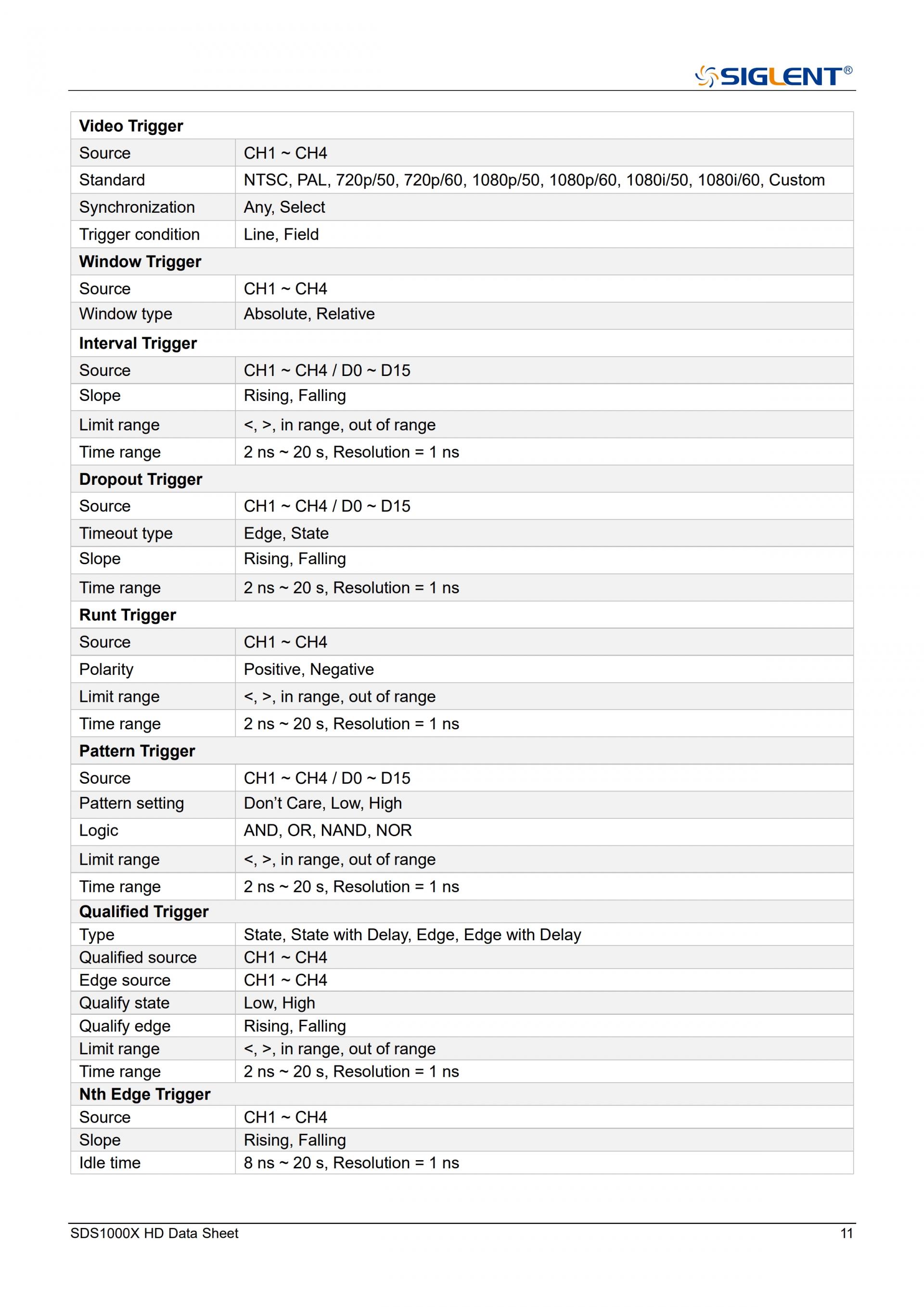 - 지능형 트리거: 에지, 기울기, 펄스 폭, 윈도우, 런트, 간격, 드롭아웃, 패턴, 비디오(HDTV 지원), 적격, N번째 에지, 지연, 설정/보류 시간.