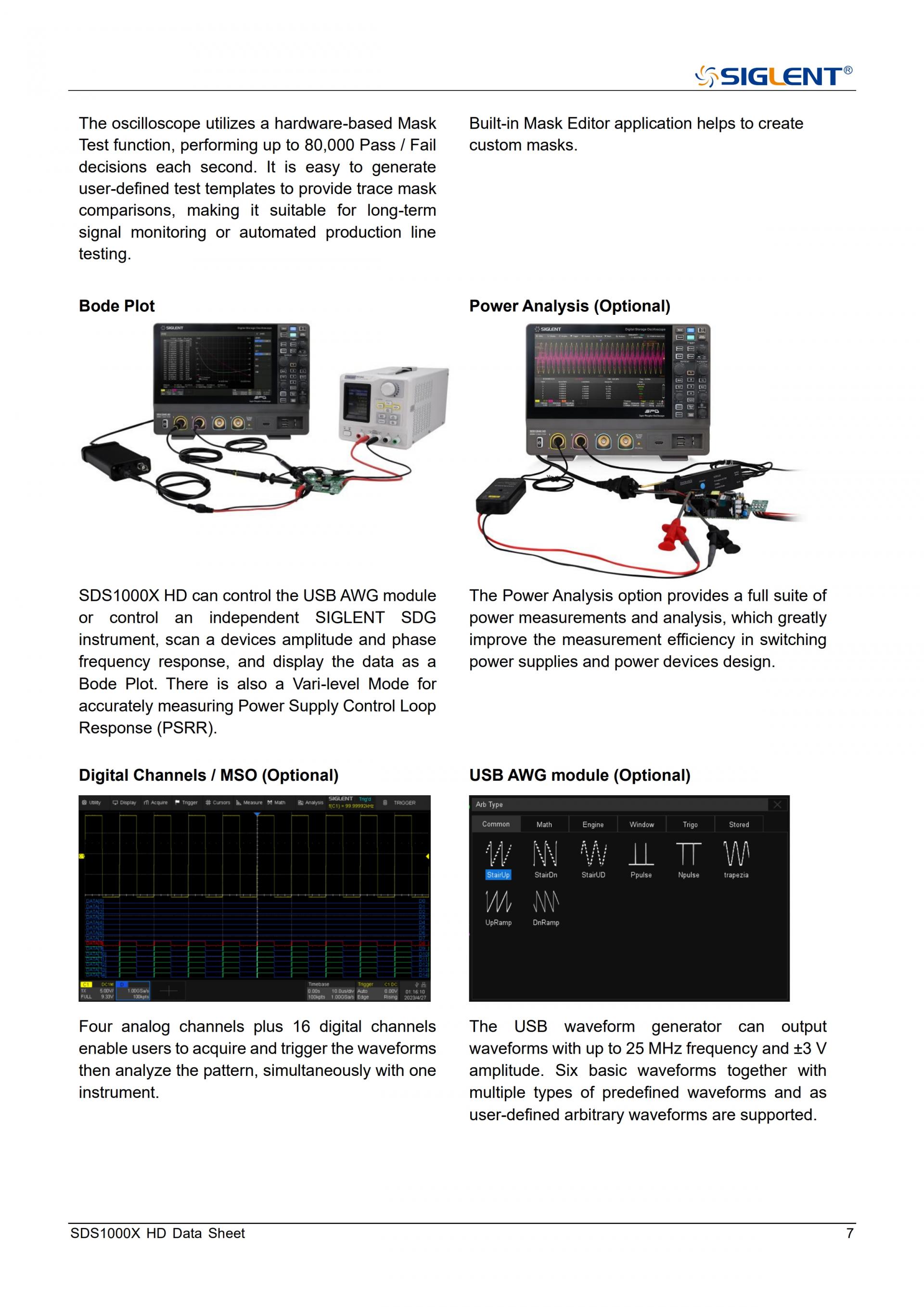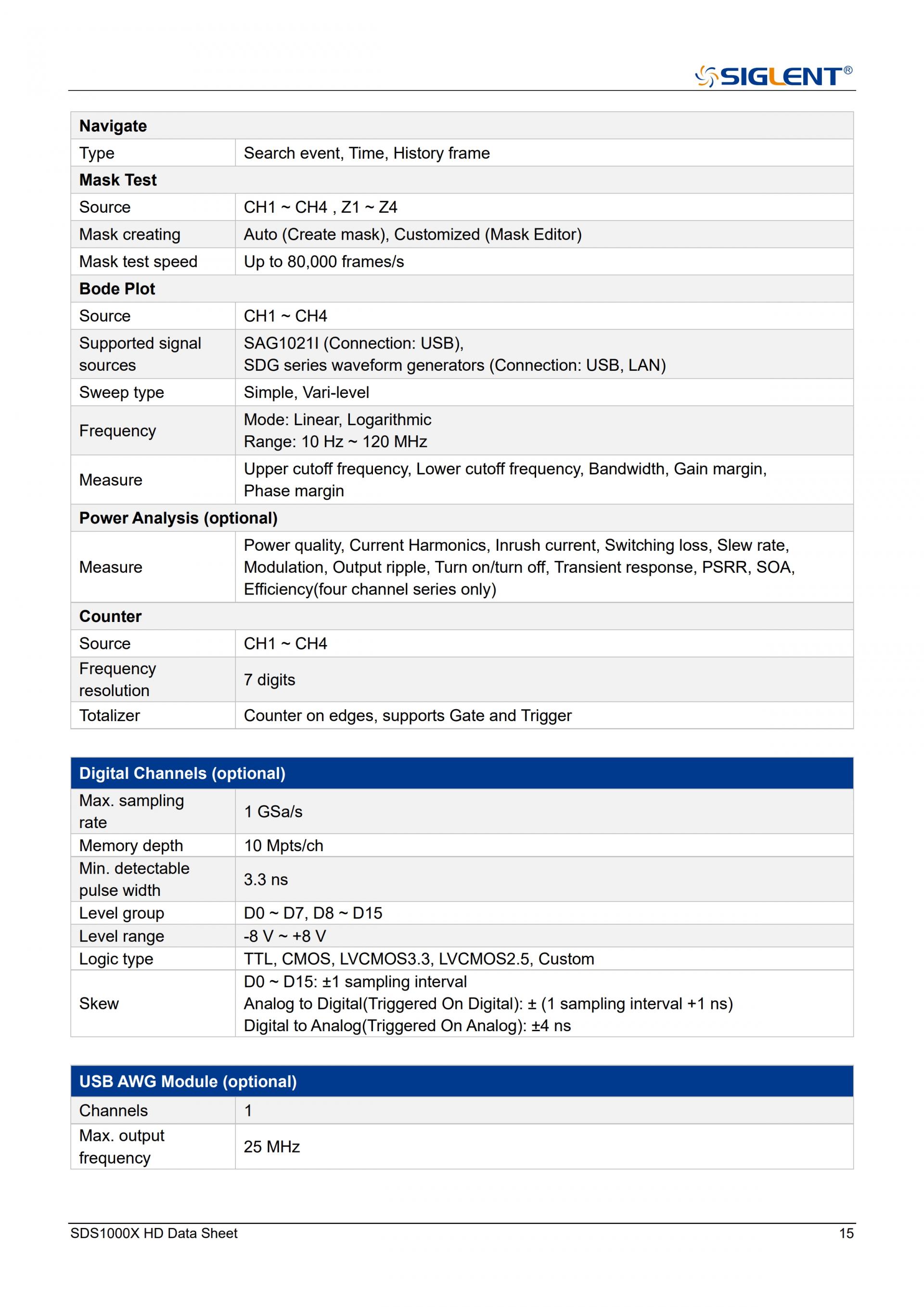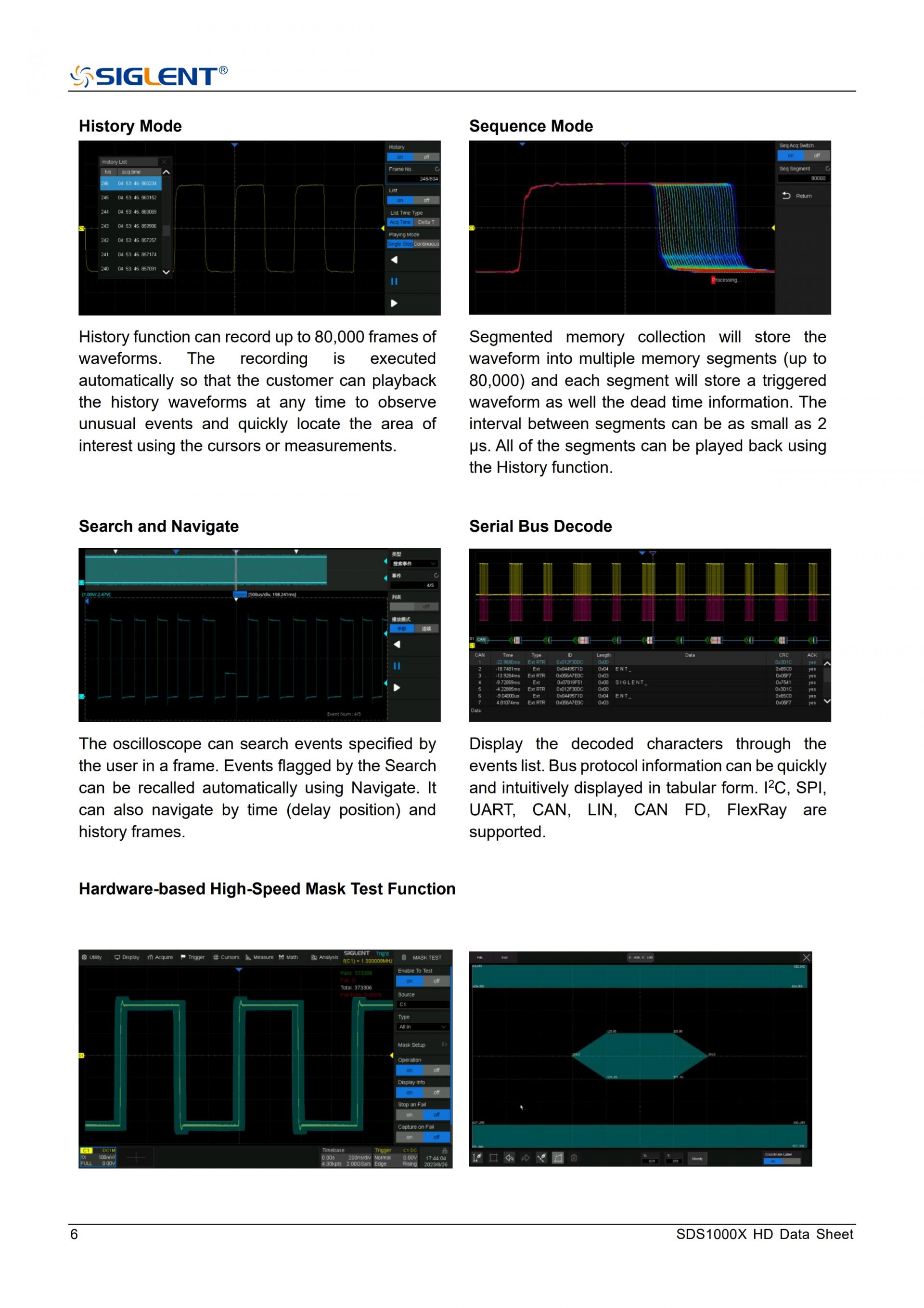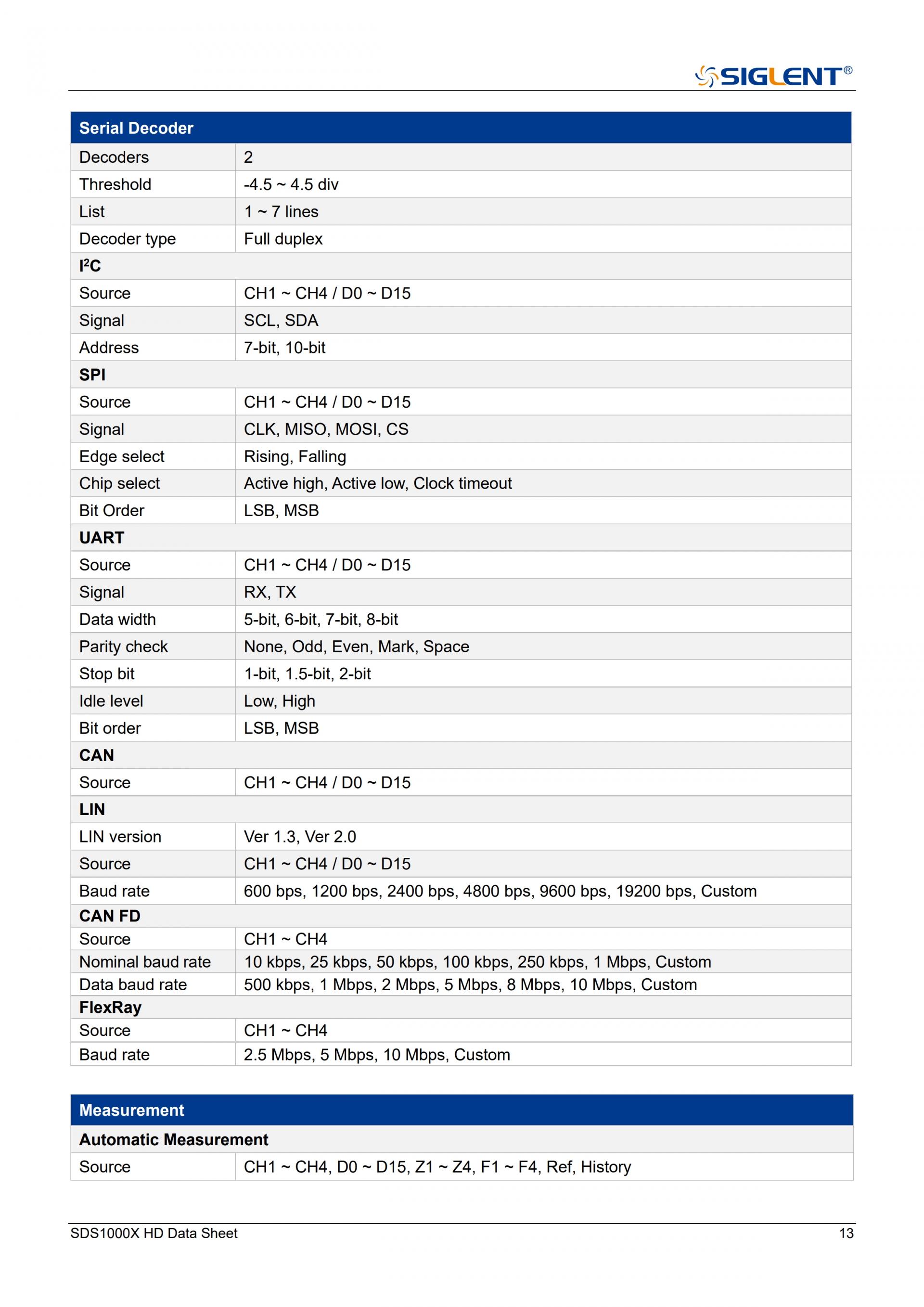 - 직렬 버스 트리거링 및 디코더, 프로토콜 I2C , SPI, UART, CAN, LIN, CAN FD(디코딩만 해당), FlexRay(디코딩만 해당) 지원