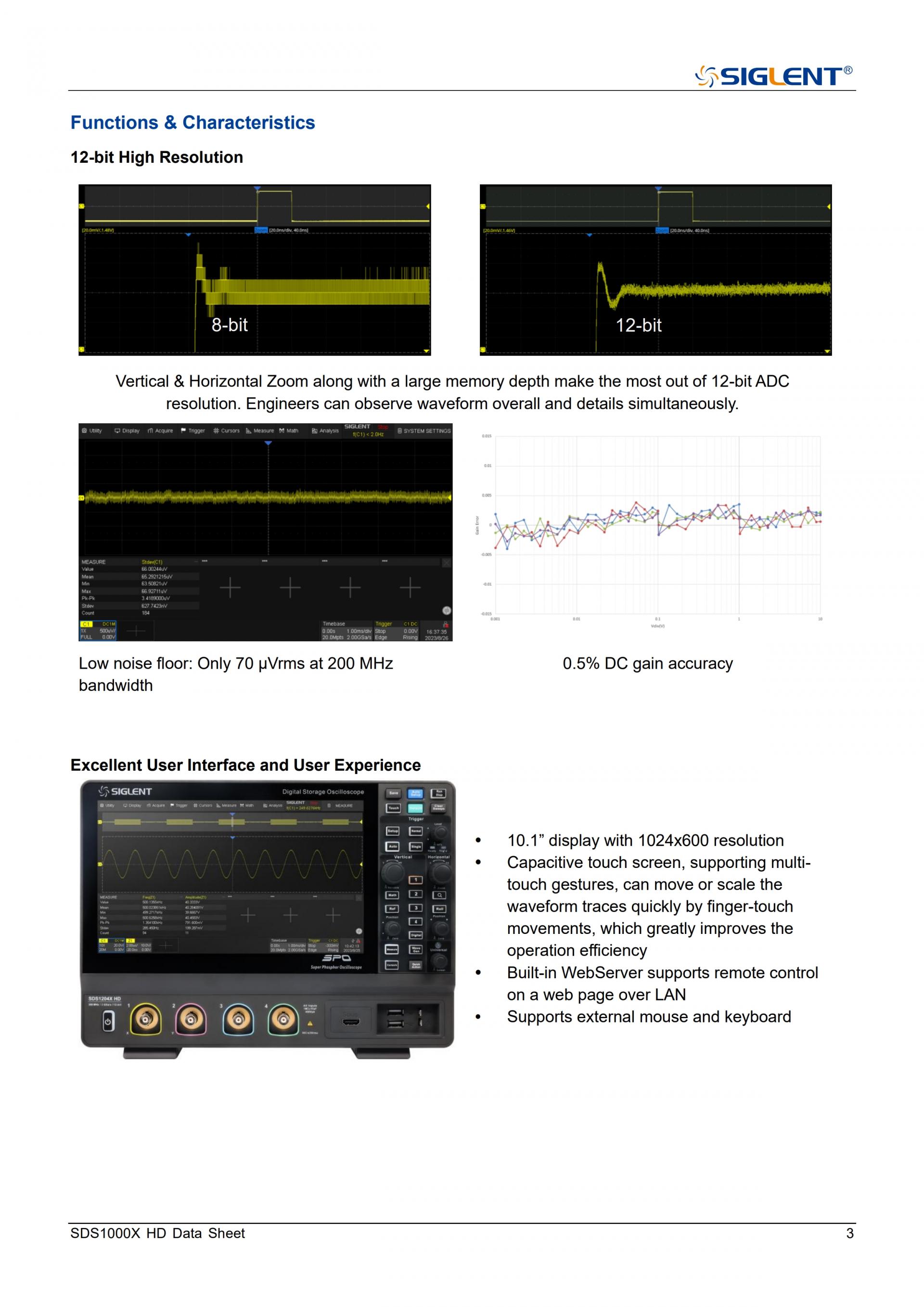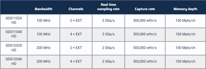 SIGLENT의 SDS1000X HD 시리즈 고해상도 디지털 스토리지 오실로스코프는 2GSa/s 속도의 12비트 아날로그-디지털 컨버터와 프런트엔드를 기반으로 탁월한 노이즈 플로어 성능을 제공합니다. 200MHz 및 100MHz 대역폭으로 제공되며, 최대 100Mpts의 레코드 길이를 갖추고 있으며, 2/4개의 아날로그 채널과 16개의 디지털 채널을 표시하는 혼합 신호 분석 기능을 제공합니다.