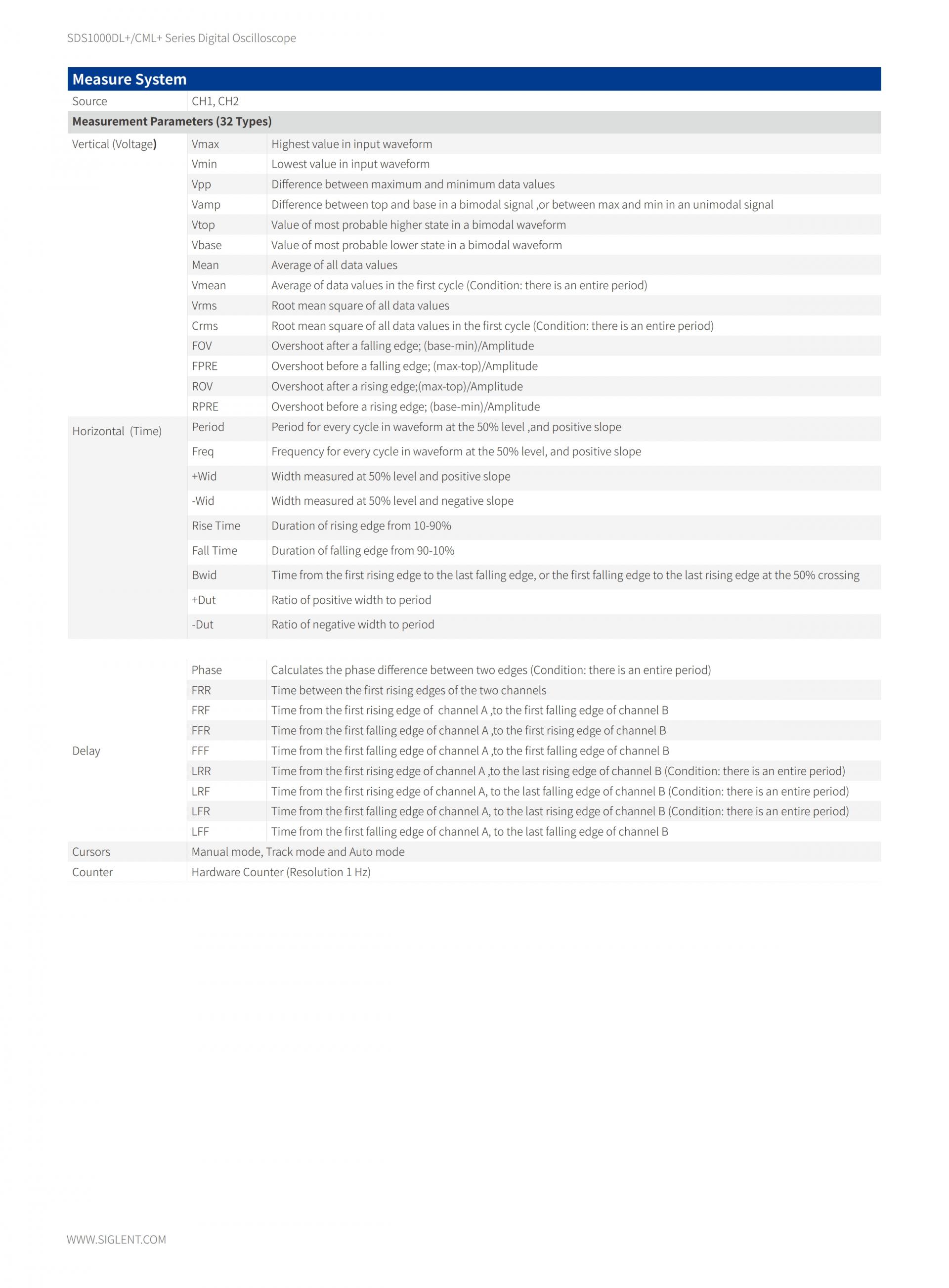 SDS1000CML+ 시리즈는 100MHz 및 150MHz 대역폭 모델로 제공되는 듀얼 채널 범용 디지털 오실로스코프입니다. 2Mpt 메모리 용량을 탑재하여 정확한 파형 분해능을 보장하고 더 긴 신호 길이를 포착할 수 있습니다. 7인치 TFT-LCD(800*480) 화면은 충분한 화면 공간을 제공하여 파형 세부 정보를 더 잘 보고 분석할 수 있도록 도와줍니다. 1GSa/s의 샘플링 속도와 함께 SDS1000CML+는 32개의 파라미터 측정 및 일반적인 수학 연산을 지원하여 복잡하고 반복적인 측정을 더욱 빠르게 수행할 수 있습니다.