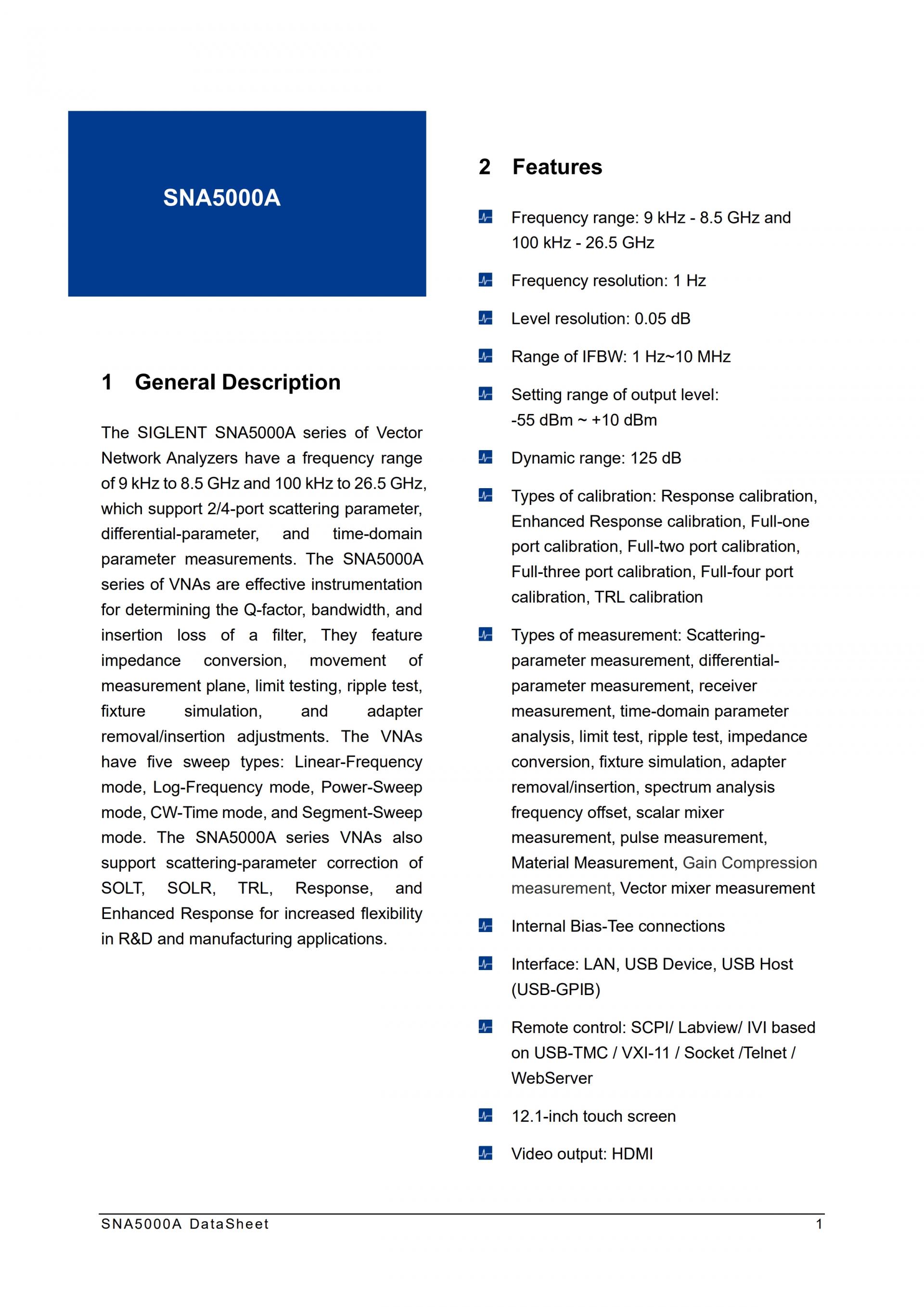 SIGLENT SNA5000A 시리즈 벡터 네트워크 분석기는 9kHz ~ 8.5GHz 및 100kHz ~ 26.5GHz의 주파수 범위를 제공하며, 2/4포트 산란 파라미터, 차동 파라미터 및 시간 영역 파라미터 측정을 지원합니다. SNA5000A 시리즈 VNA는 필터의 Q 인자, 대역폭 및 삽입 손실을 결정하는 데 효과적인 계측기입니다. 임피던스 변환, 측정 평면 이동, 한계 테스트, 리플 테스트, 고정구 시뮬레이션 및 어댑터 제거/삽입 조정 기능이 있습니다. VNA는 선형 주파수 모드, 로그 주파수 모드, 전력 스윕 모드, CW 시간 모드 및 세그먼트 스윕 모드의 5가지 스윕 유형을 제공합니다. SNA5000A 시리즈 VNA는 또한 R&D 및 제조 애플리케이션의 유연성을 높이기 위해 SOLT, SOLR, TRL, 응답 및 향상된 응답의 산란 파라미터 보정을 지원합니다.