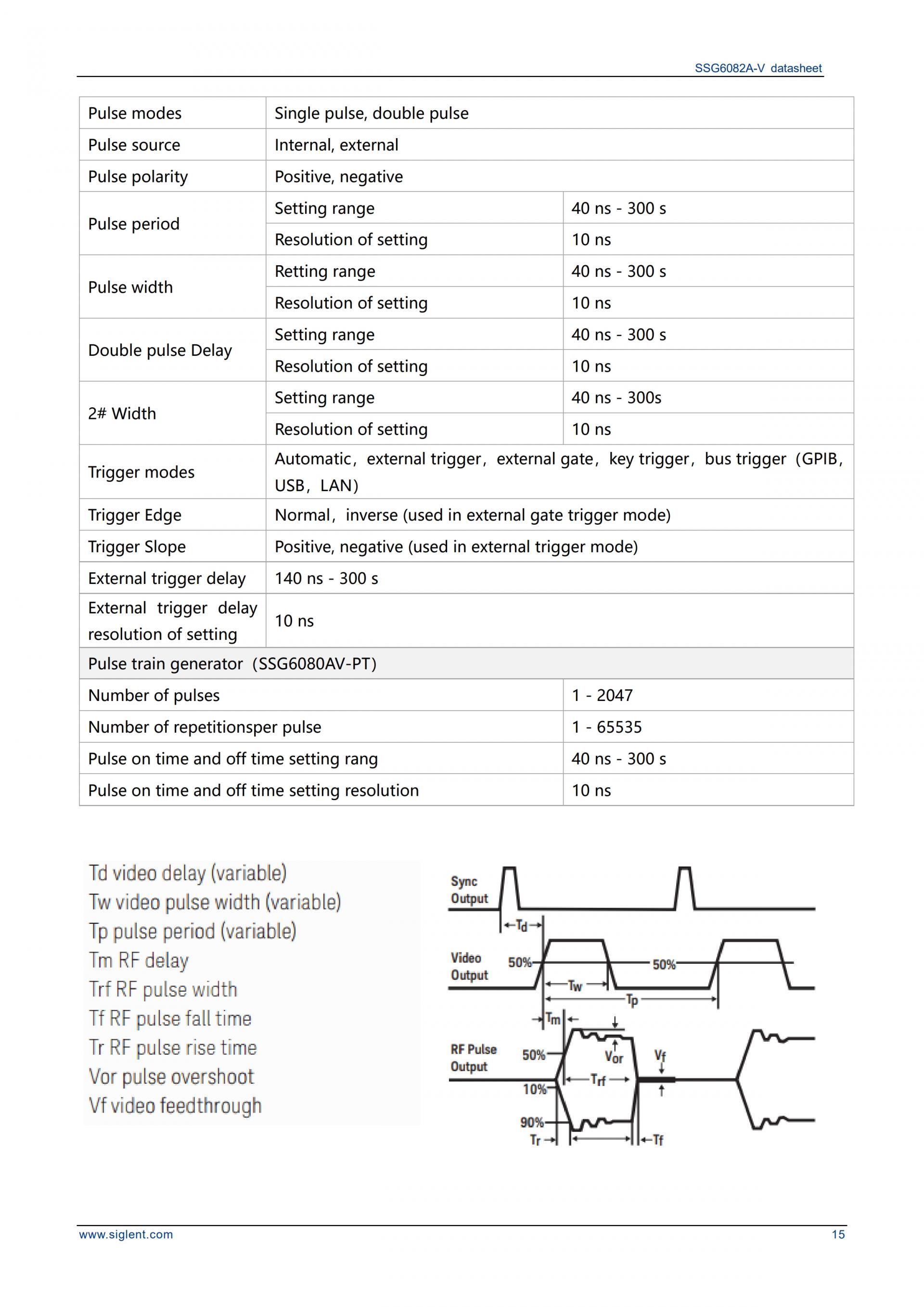 - 펄스 변조: 펄스 변조 기능, 펄스 열 생성기 및 사용자 정의 펄스 시퀀스(옵션)를 지원합니다.