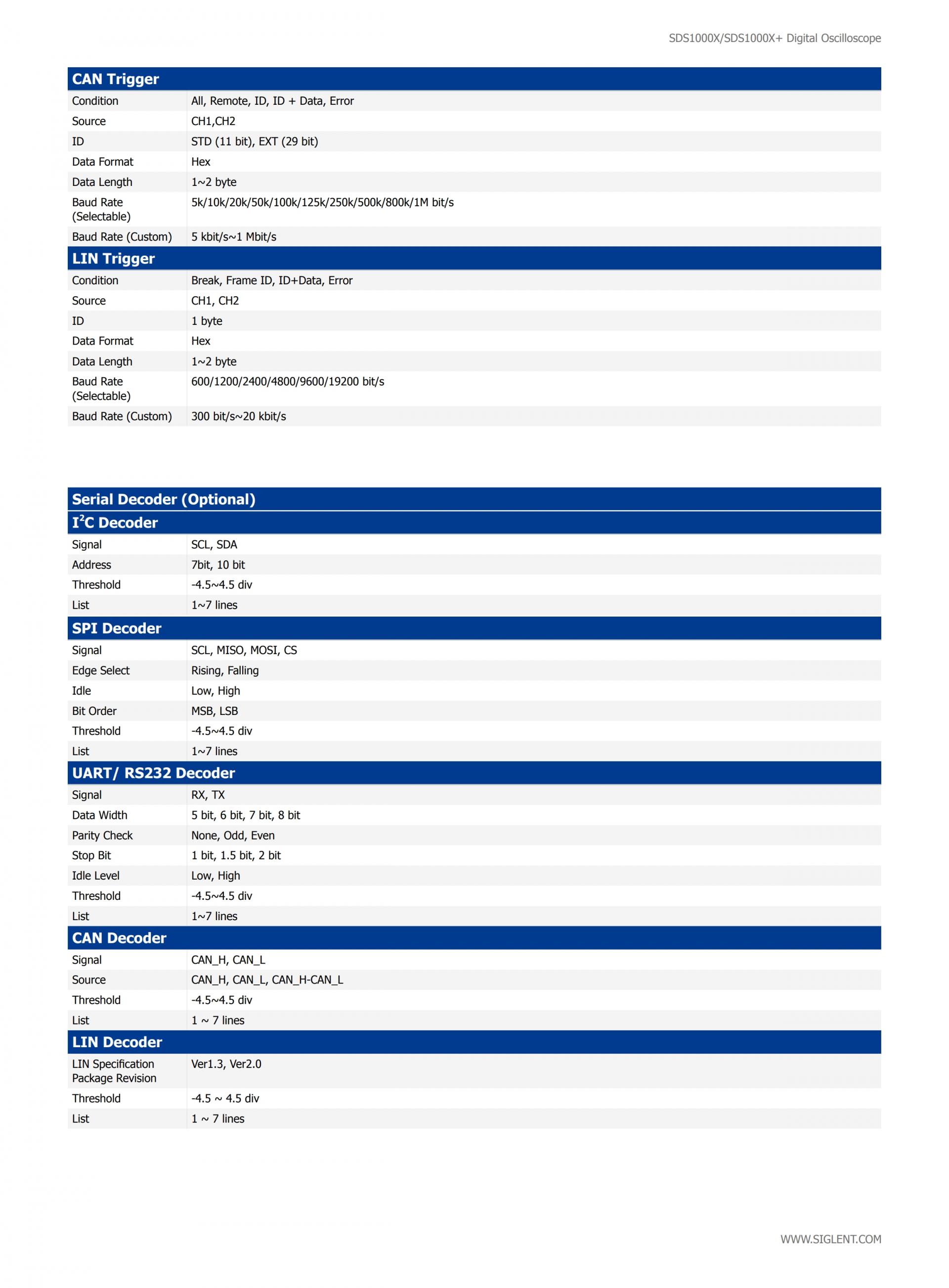 - 직렬 버스 트리거링 및 디코드, IIC, SPI, UART, RS232, CAN 및 LIN 프로토콜 지원