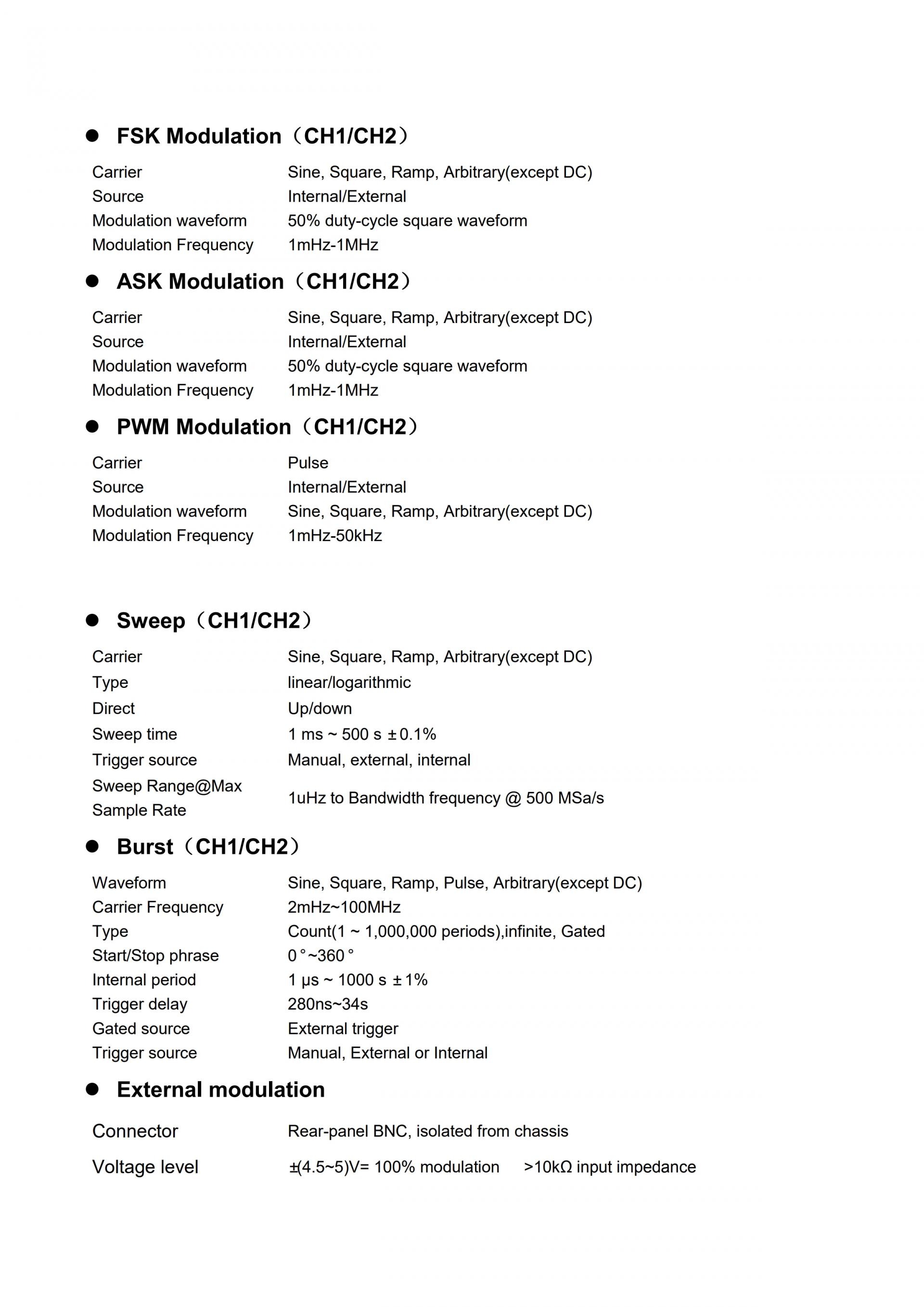 - 변조 기능에는 AM, DS-AM, FM, FSK, ASK, PWM, 선형/로그 스위핑 및 버스트가 포함됩니다.