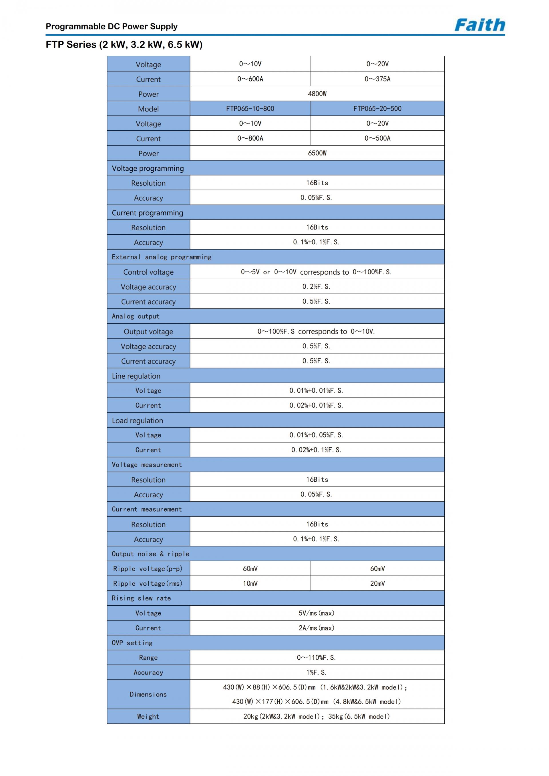 FTP series wide range Benchtop computer-controlled DC regulated power supply is a high performance DC power supply developed by Faith Technology. It has the advantages of wide range output, large current, low ripple noise, fast transient response, high resolution, high precision, voltage and current slope can be set, etc.