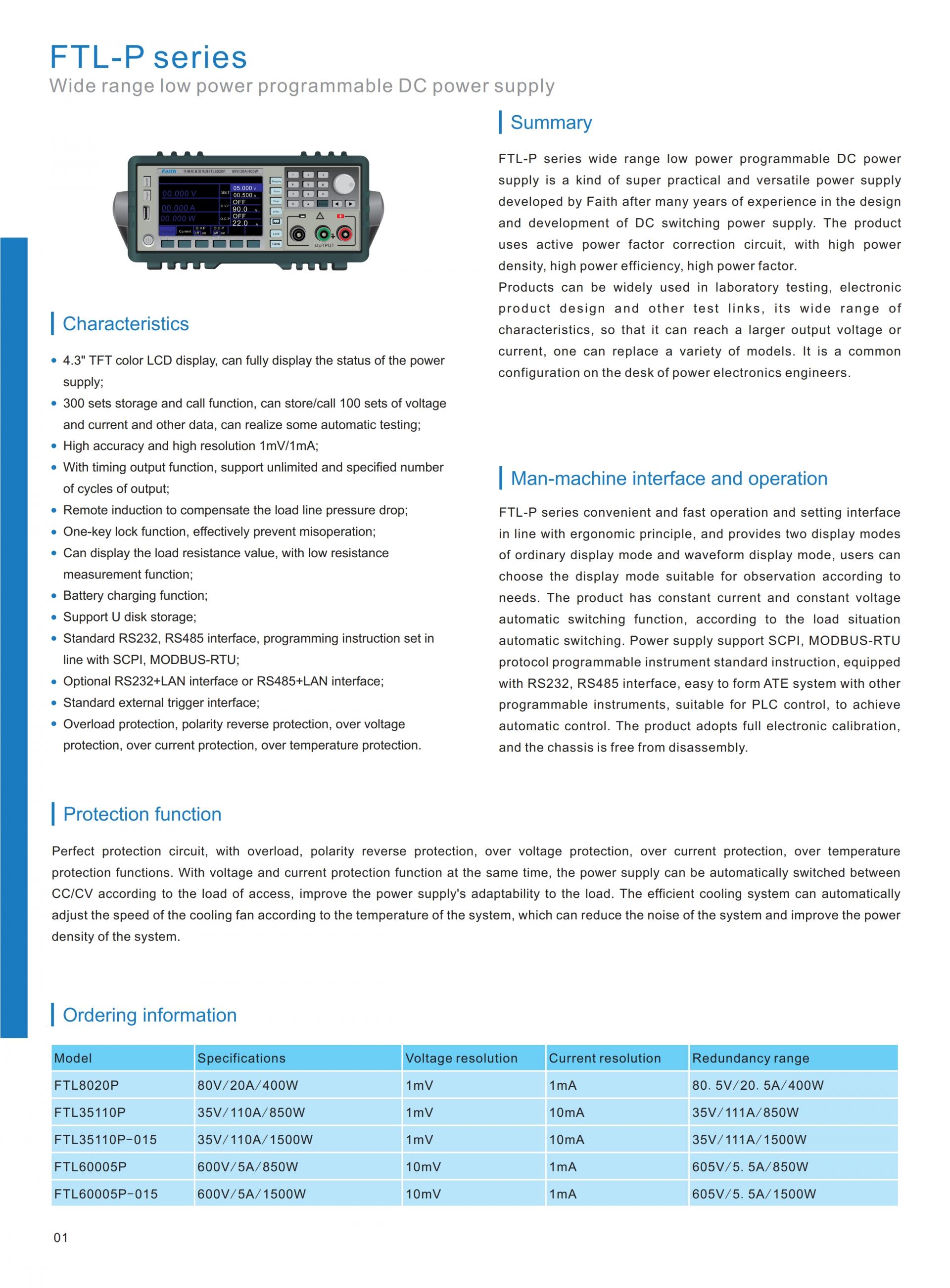 The FTL series is a high precision DC linear power supply with high performance, multi-function, medium and small power features. The product is stable and mature, and has comprehensive protection functions such as reverse polarity, overvoltage, overcurrent, overload and overtemperature, which can keep the power supply and load safe in unstable environments. FTL has a regulation rate of < 0.01%, ripple and noise of < 1mVrms and fine transient performance, and is suitable for application environments like current surges. The FTL series DC power supply is not only suitable for high-grade laboratory, but also for high-performance test systems.