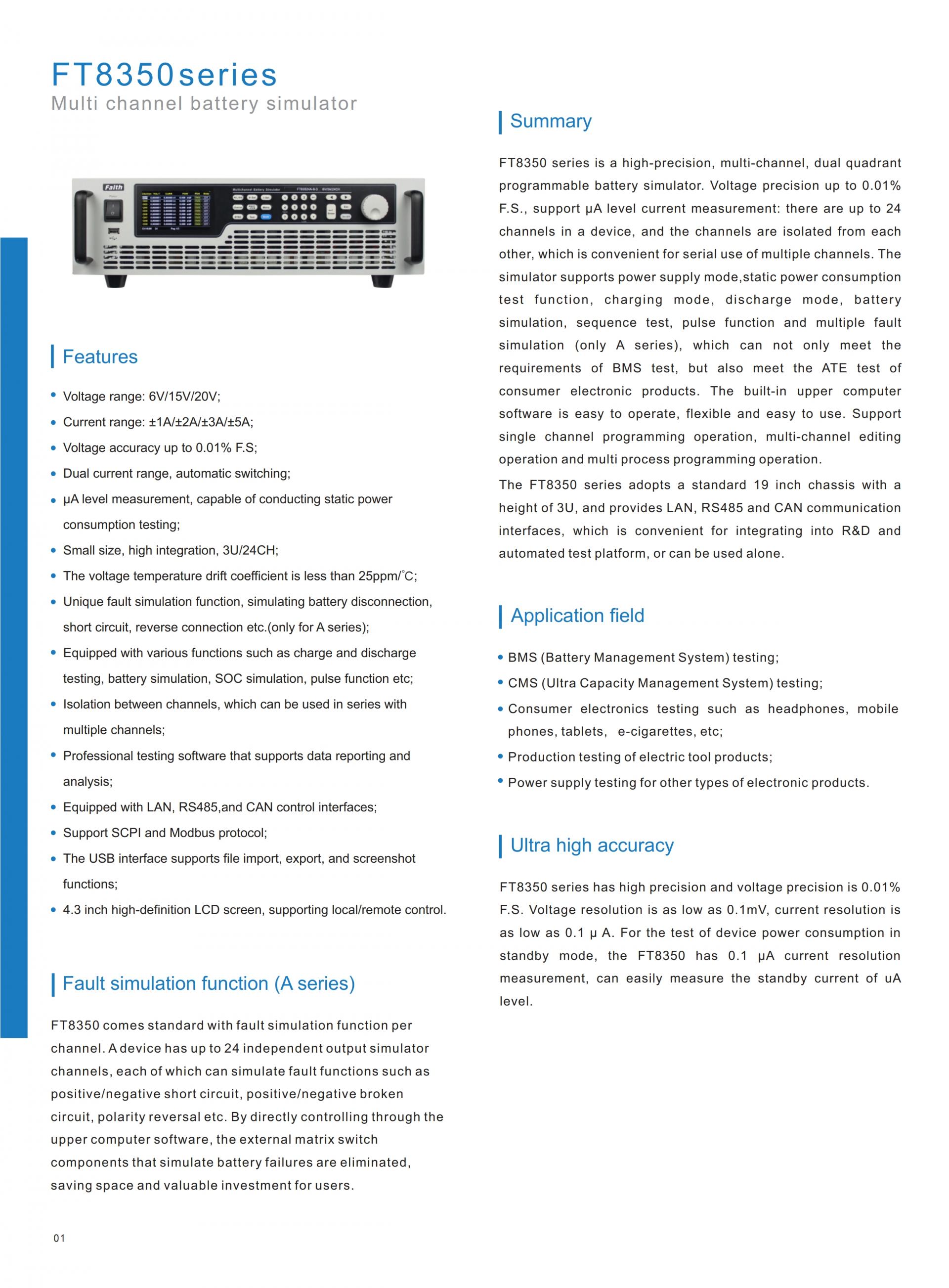 FT8350 series is a high-precision, multi-channel, dual quadrant programmable battery simulator. Voltage precision up to 0.01% F.S., support μA level current measurement: there are up to 24 channels in a device, and the channels are isolated from each other, which is convenient for serial use of multiple channels. The simulator supports power supply mode,static power consumption test function, charging mode, discharge mode, battery simulation, sequence test, pulse function and multiple fault simulation (only A series), which can not only meet the requirements of BMS test, but also meet the ATE test of consumer electronic products. The built-in upper computer software is easy to operate, flexible and easy to use. Support single channel programming operation, multi-channel editing operation and multi process programming operation.