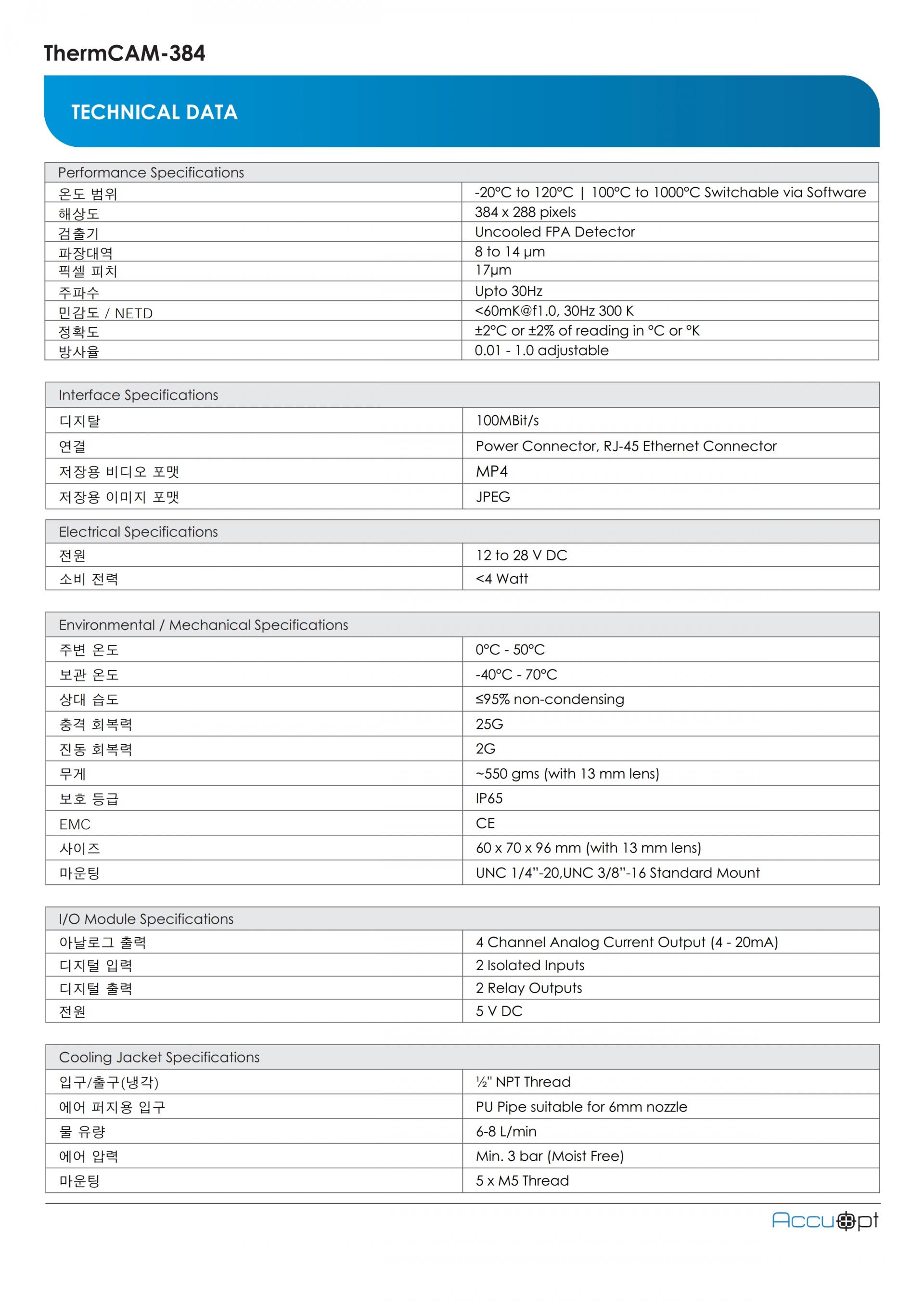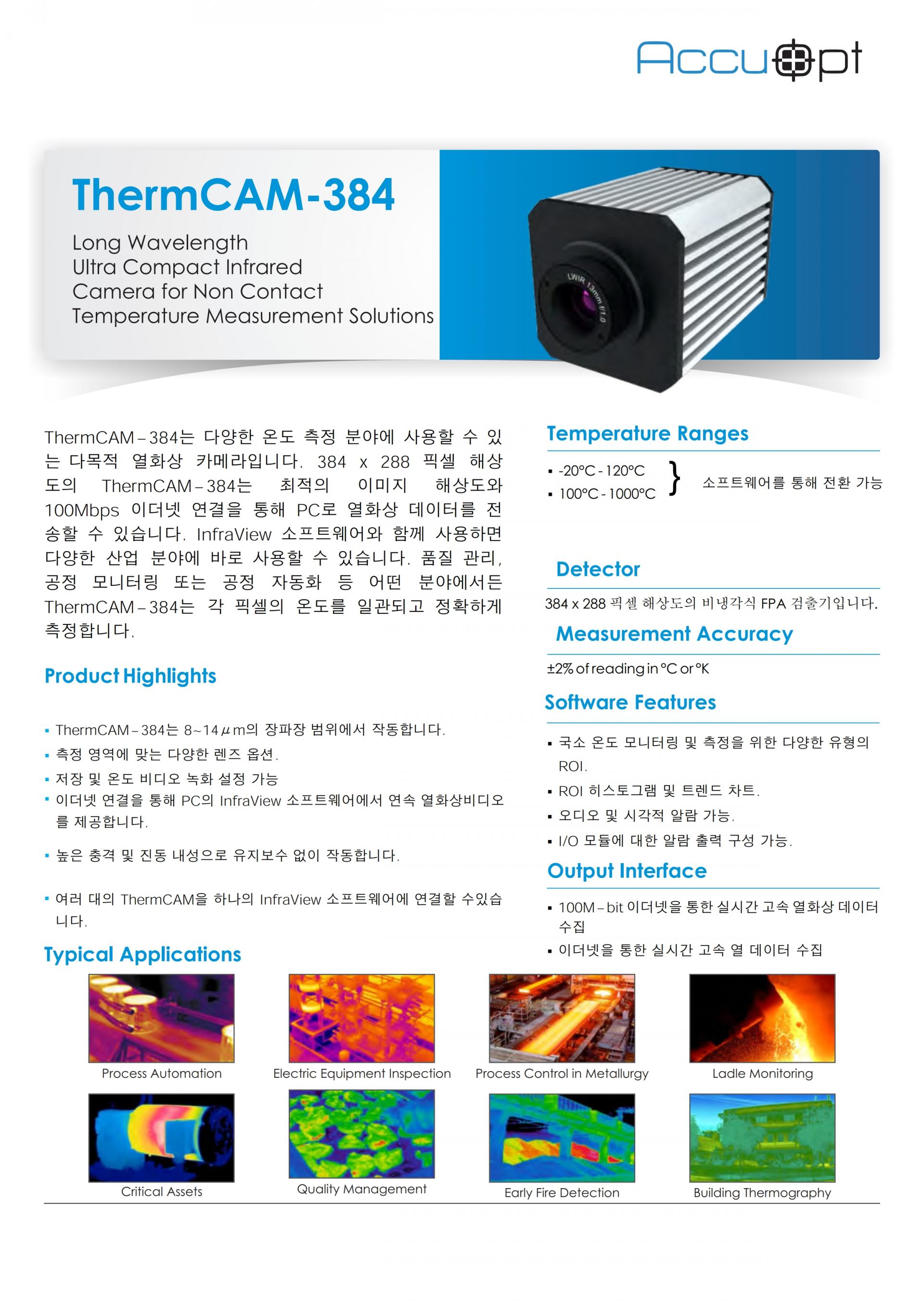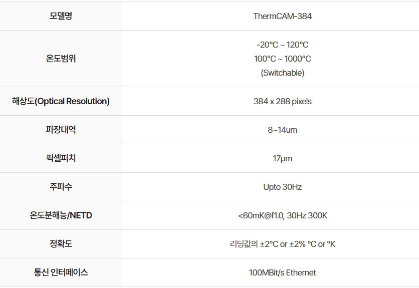 384 x 288 pixels 열화상카메라 (온도 범위 -20°C ~ 1000°C)